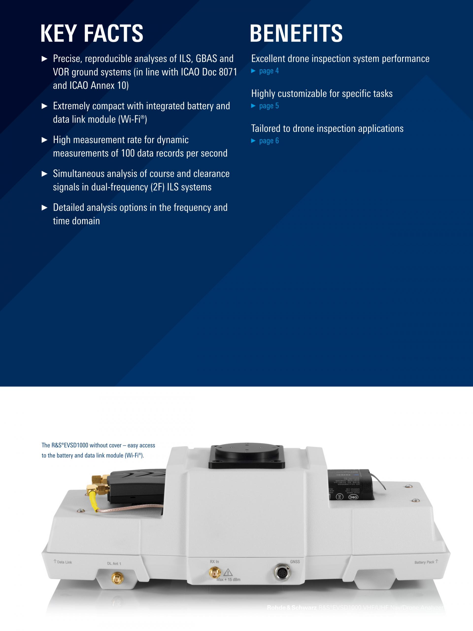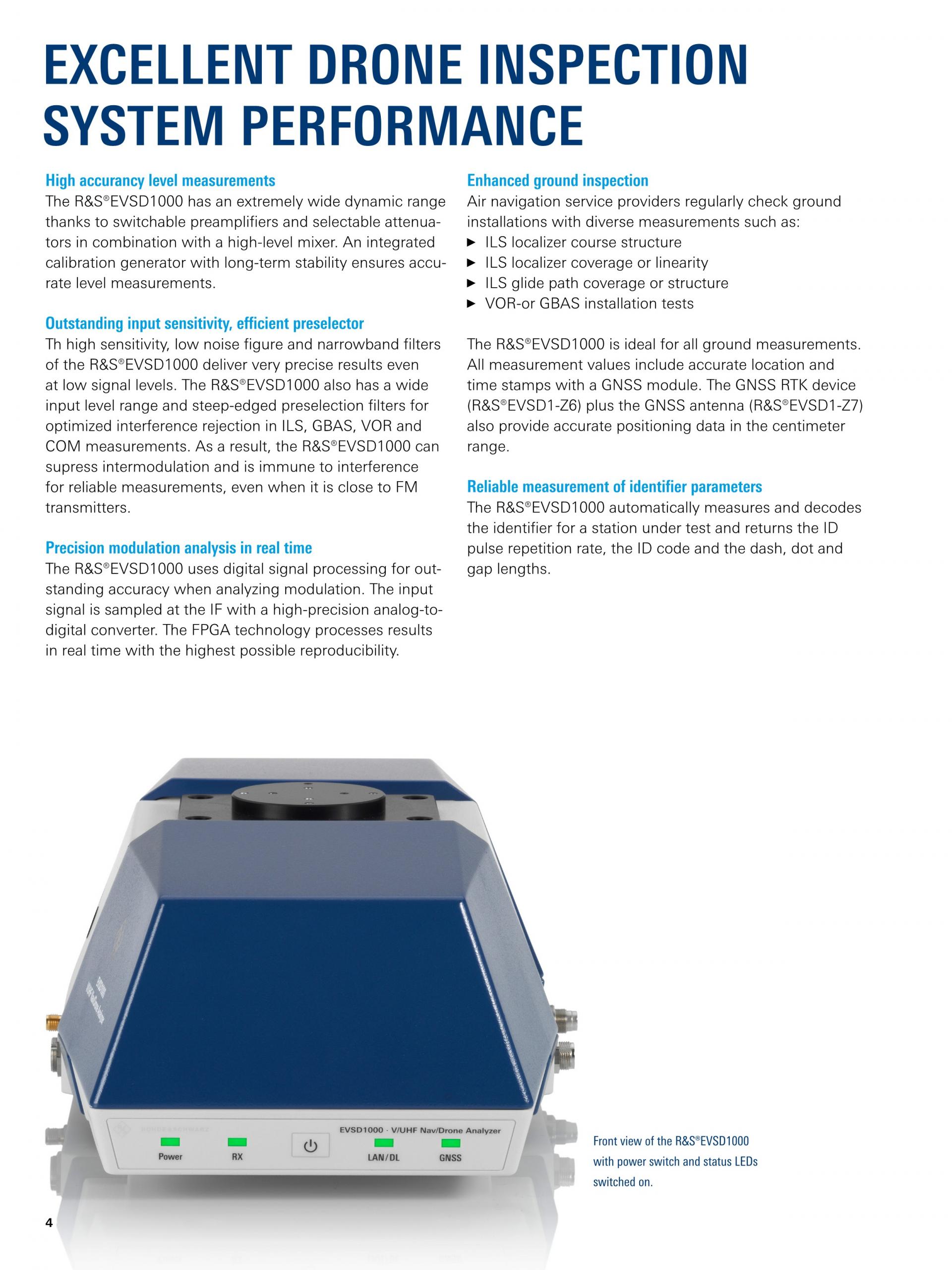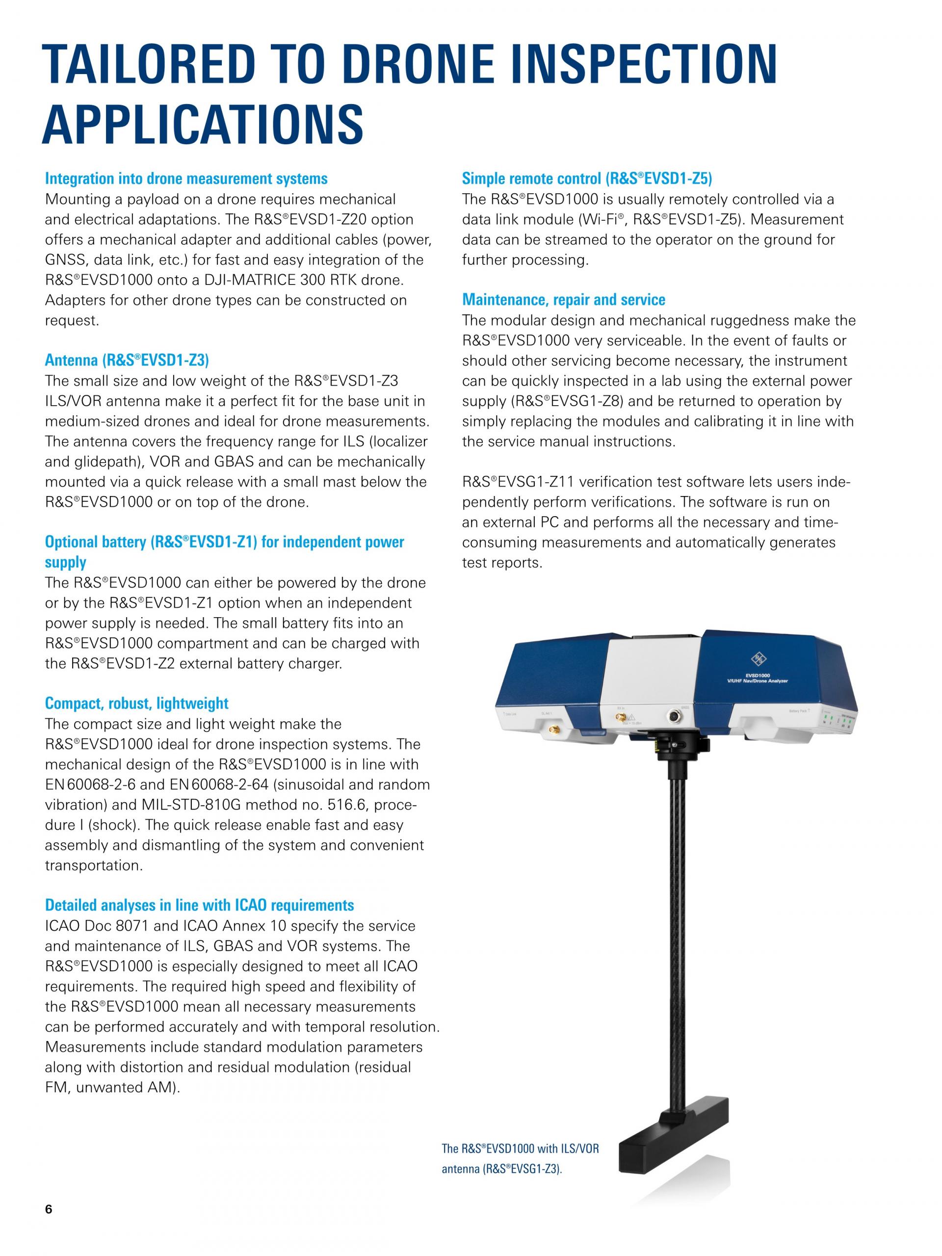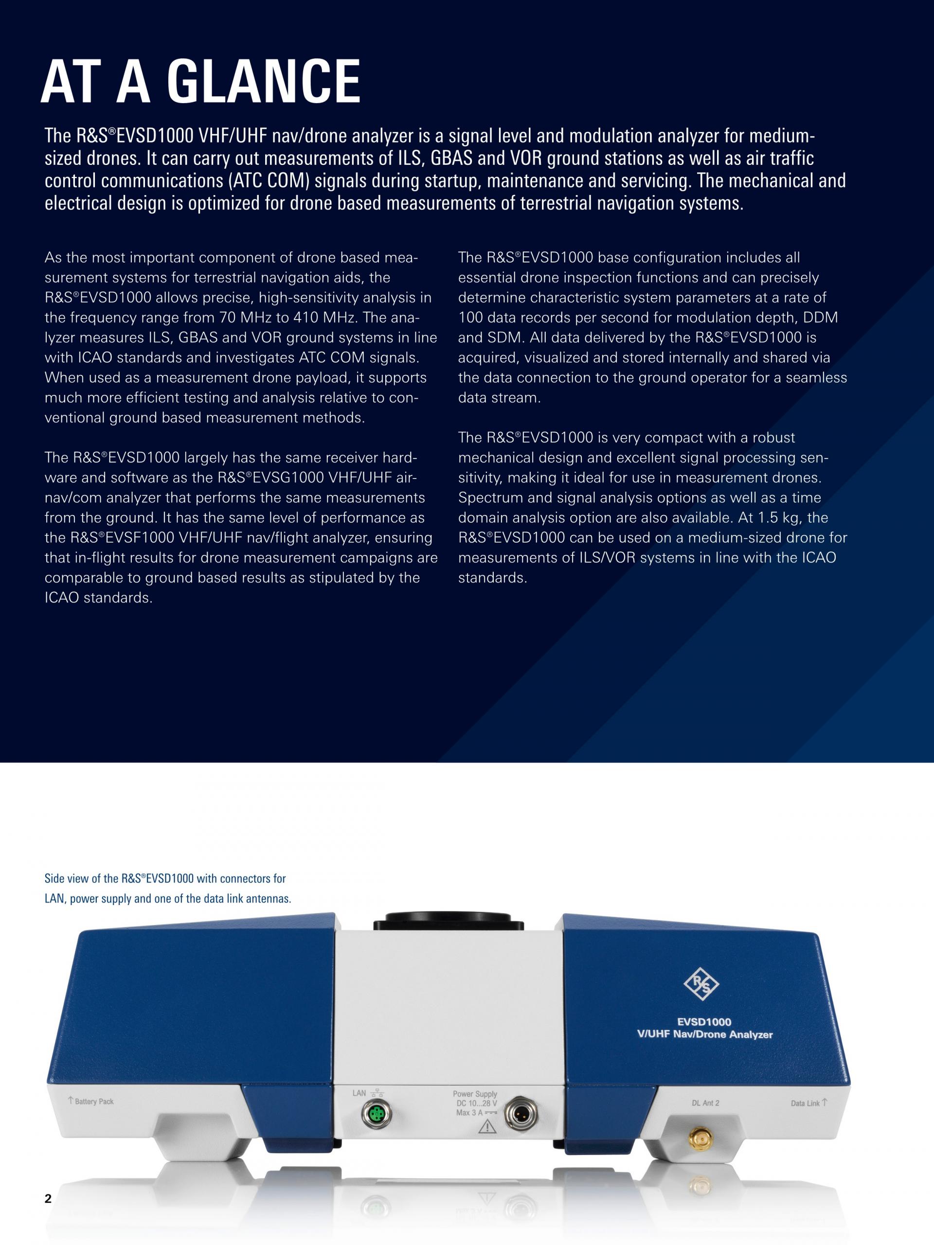 R&S®EVSD1000 VHF/UHF Nav/Drone Analyzer는 중형 드론에 탑재해 사용하는 신호 레벨 및 변조 분석기입니다. 이 시스템은 기동, 유지보수 및 정비중의 ILS, GBAS, VOR 지상국을 측정하고, ATC COM(Air Traffic Control Communication) 신호를 분석합니다. 기계적 설계와 전자적 설계는 지상 항법 시스템의 드론 기반 측정에 최적화되어 있습니다.