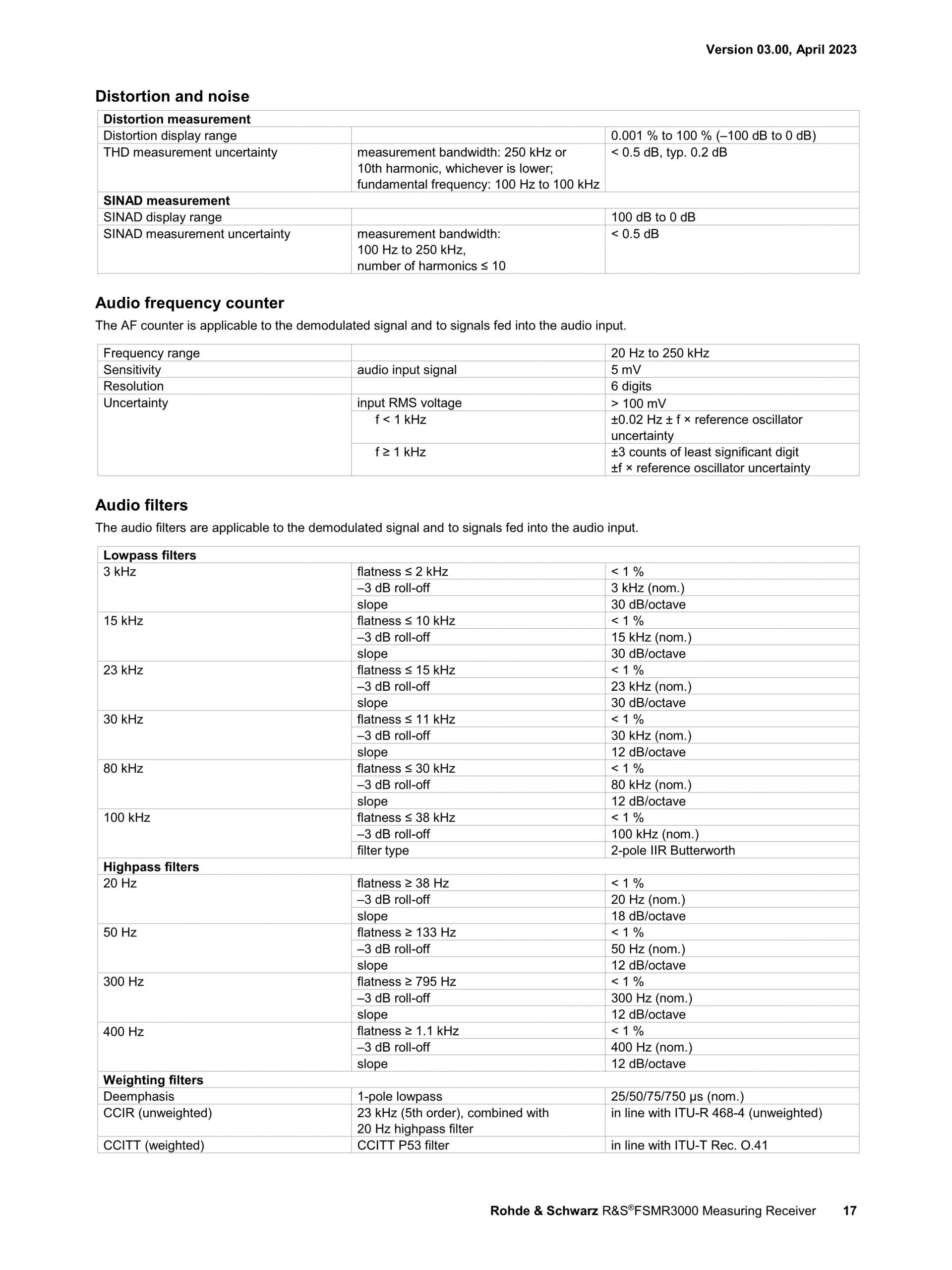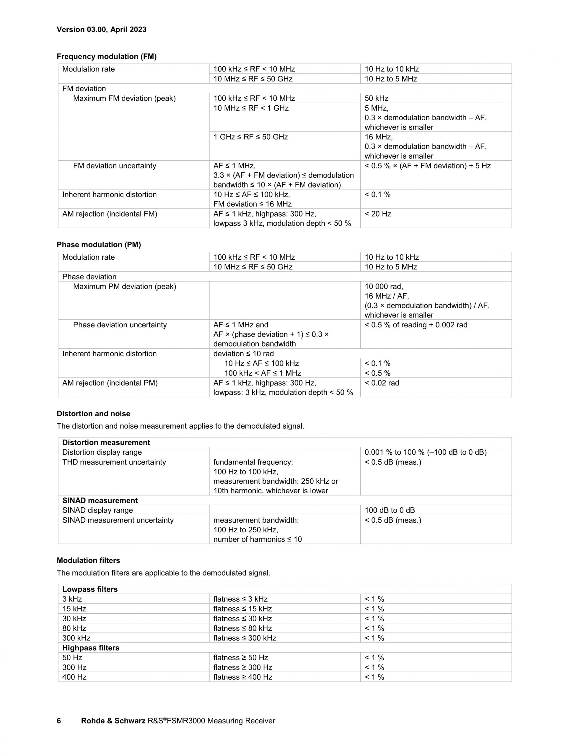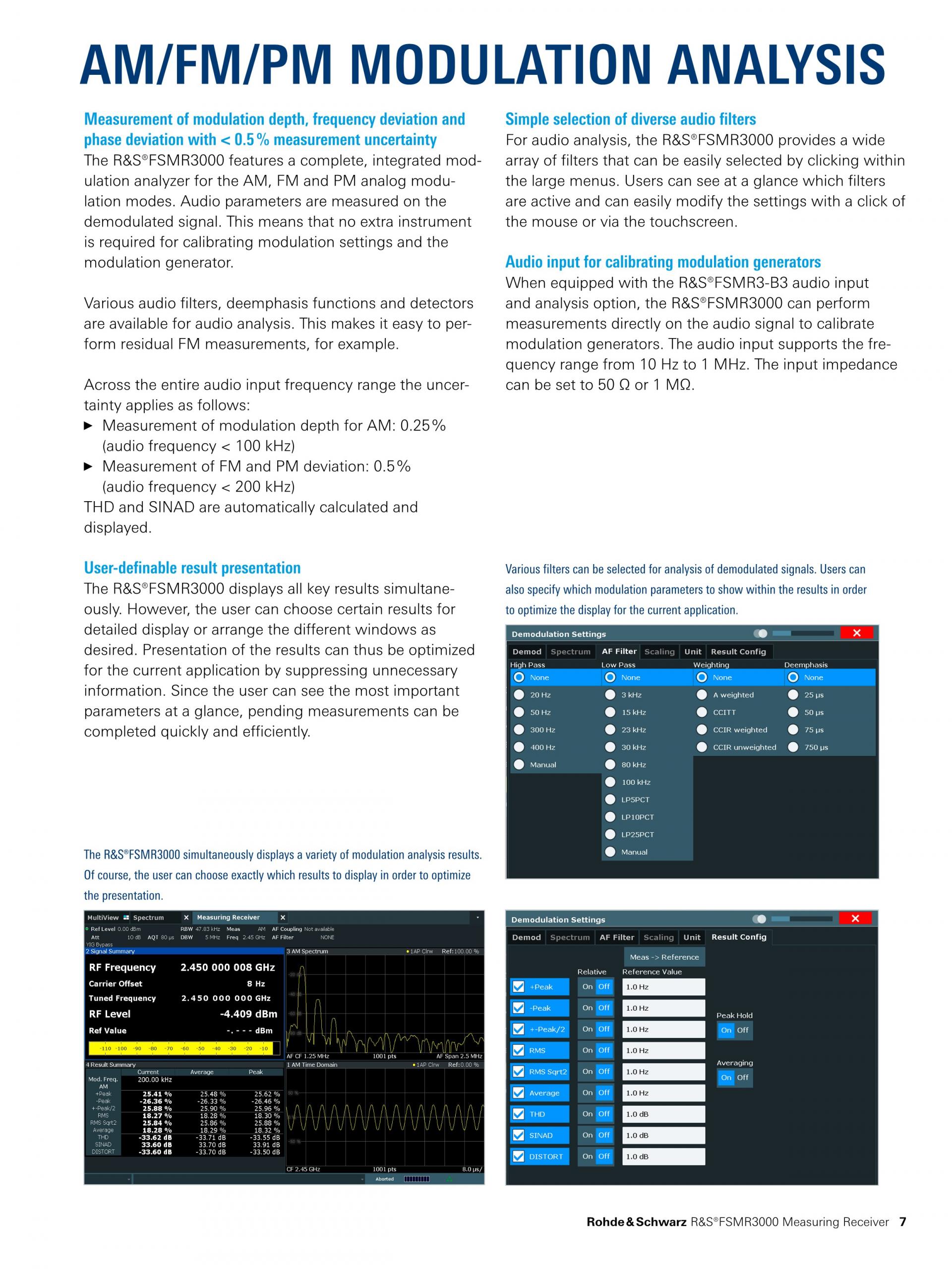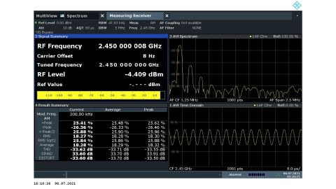 R&S®FSMR3000에는 AM, FM, PM 아날로그 변조 모드를 위한 완전한 일체형 변조 분석기가 탑재되어 있습니다. 오디오 파라미터는 복조된 신호에서 측정됩니다. 오디오 분석을 위해 다양한 오디오 필터, 디엠퍼시스 기능 및 검출기를 사용할 수 있습니다. |