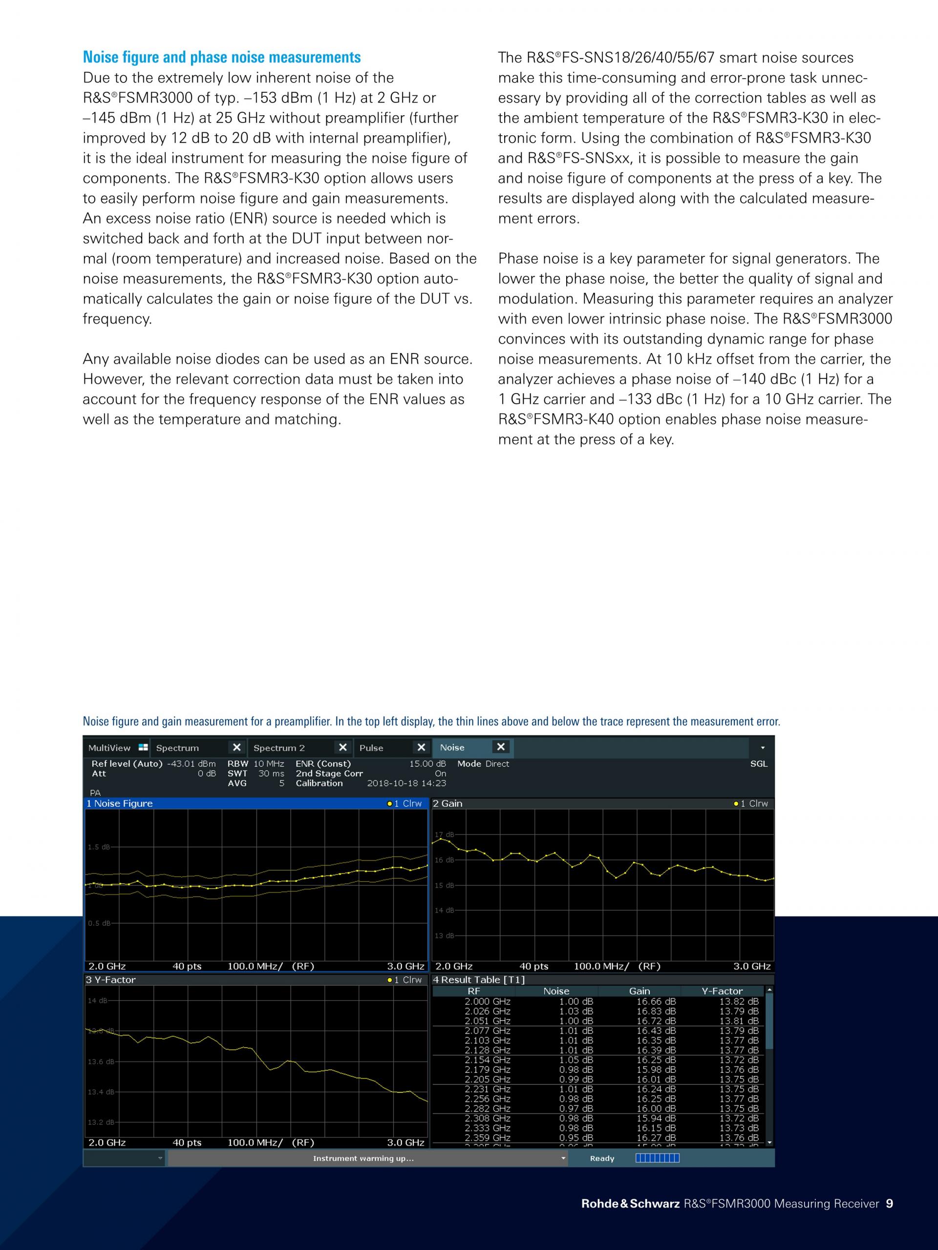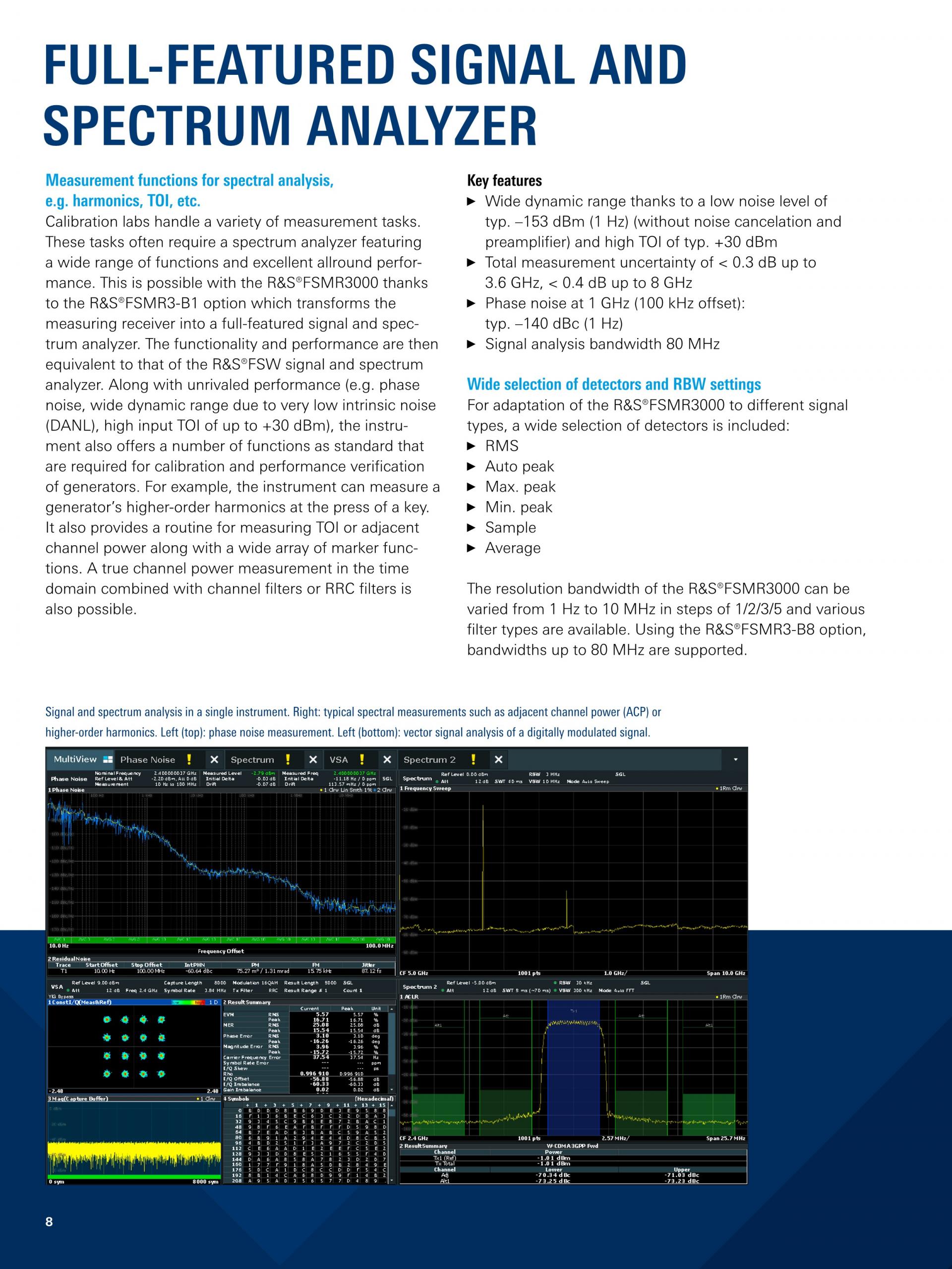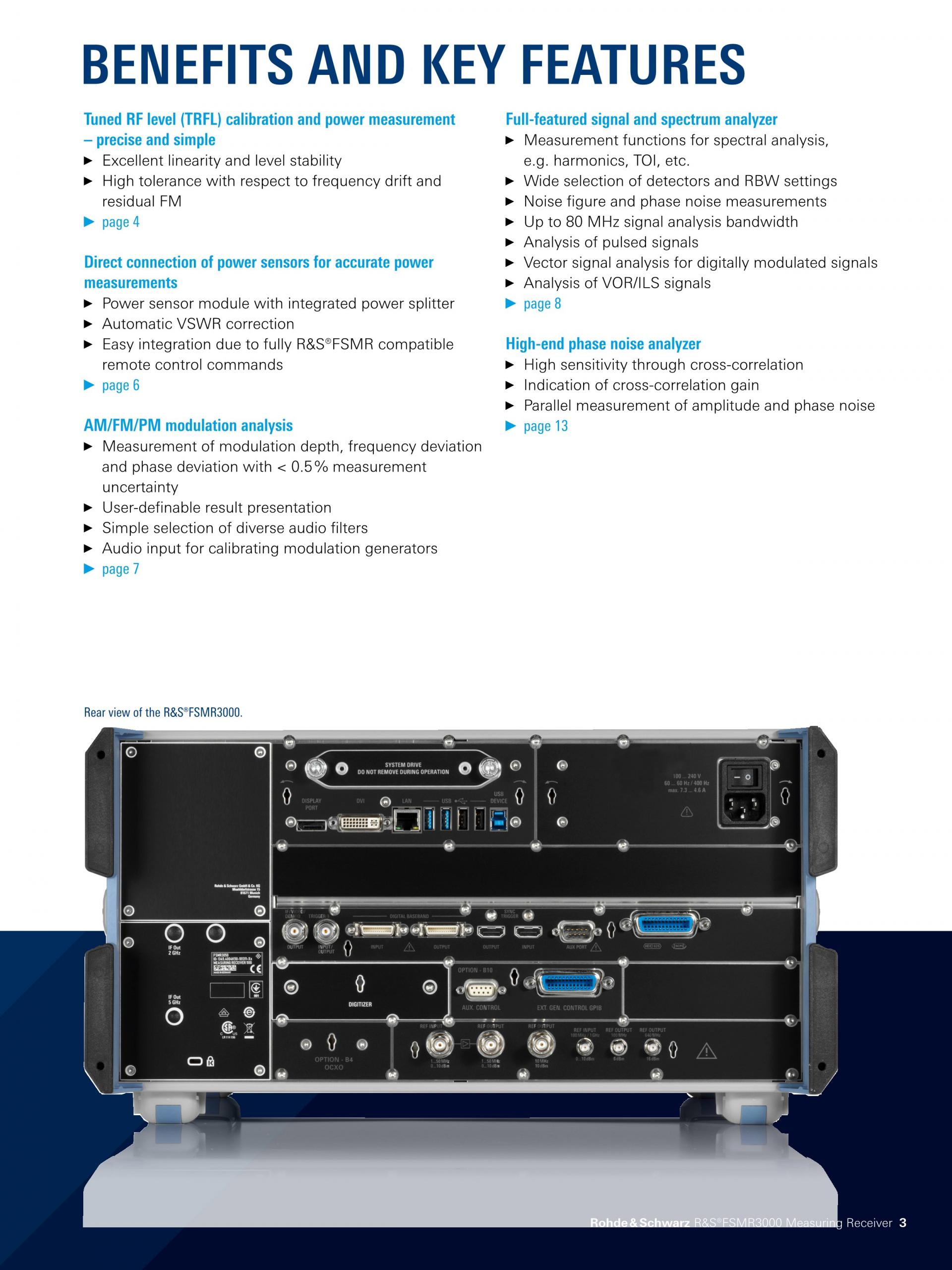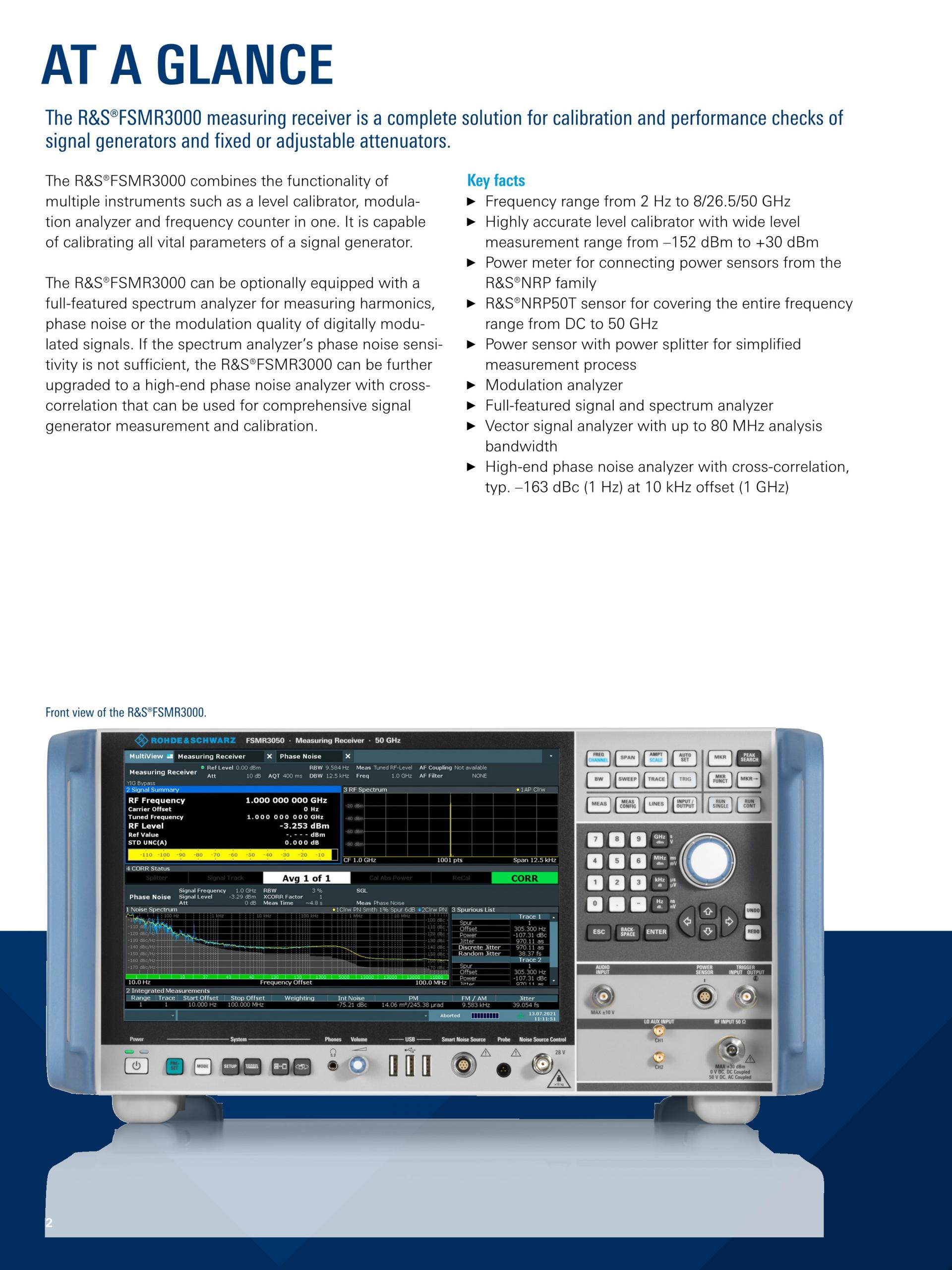 R&S®FSMR3000은 기기 한 대로 신호 발생기와 감쇠기를 교정하는 Microwave 측정 수신기입니다. 이 수신기에서 가장 중요한 기능은 TRFL(Tuned RF Level) 측정, 레벨 측정, 아날로그 변조, 스펙트럼 분석입니다. 그 외에도 R&S®FSMR3000에 스펙트럼 분석기를 이용한 표준 위상 노이즈 테스트를 보완하는 하이엔드 위상 노이즈 테스트를 위해 강력한 하드웨어를 장착할 수 있습니다. 또한, 디지털 및 아날로그 변조 신호 분석, 80 MHz 분석 대역폭, 펄스 및 VOR/ILS 신호 분석 기능을 제공합니다. R&S®FSMR은 교정의 복잡성을 줄이기 위해 싱글 박스 기기로 설계되었습니다.