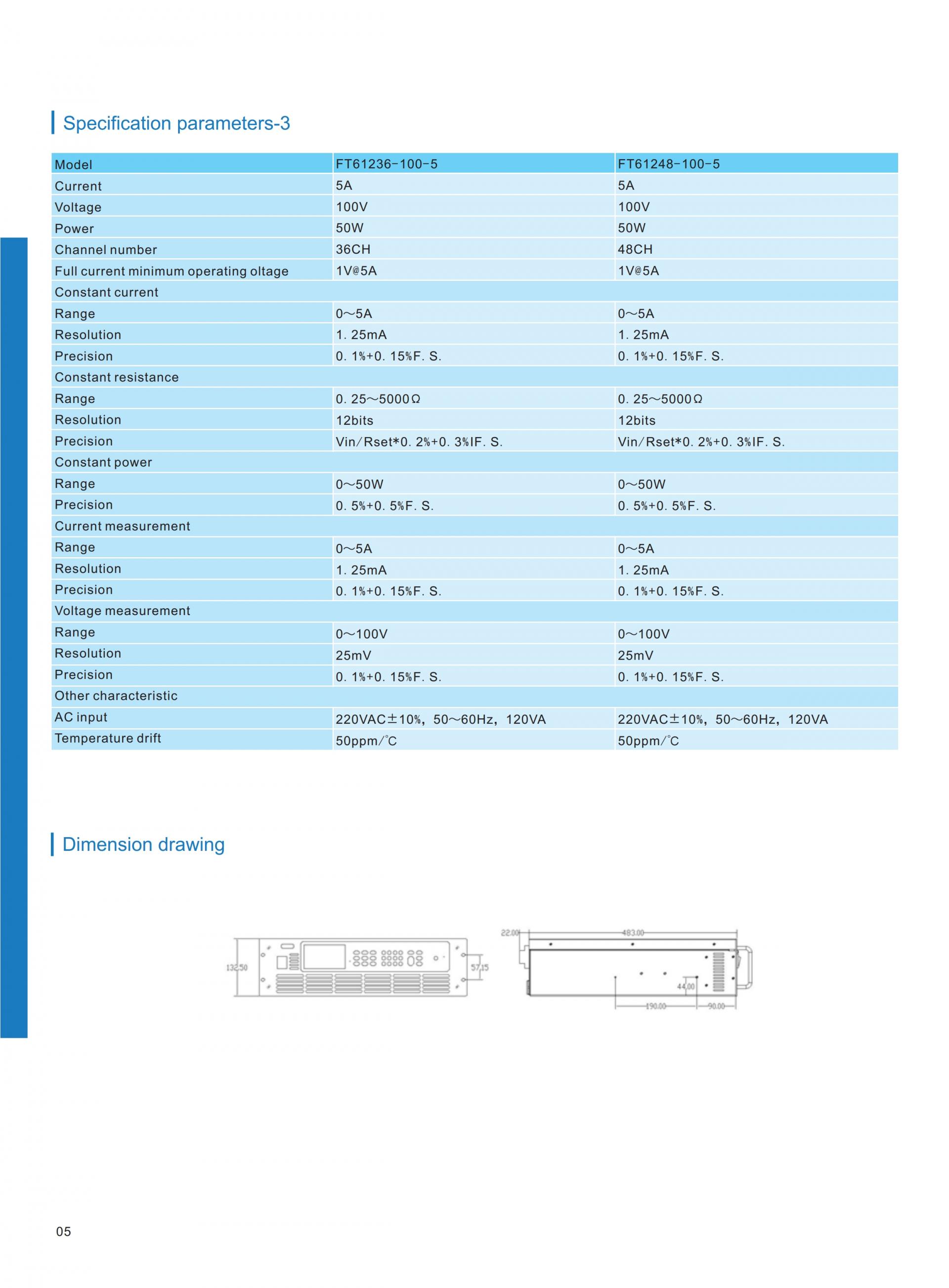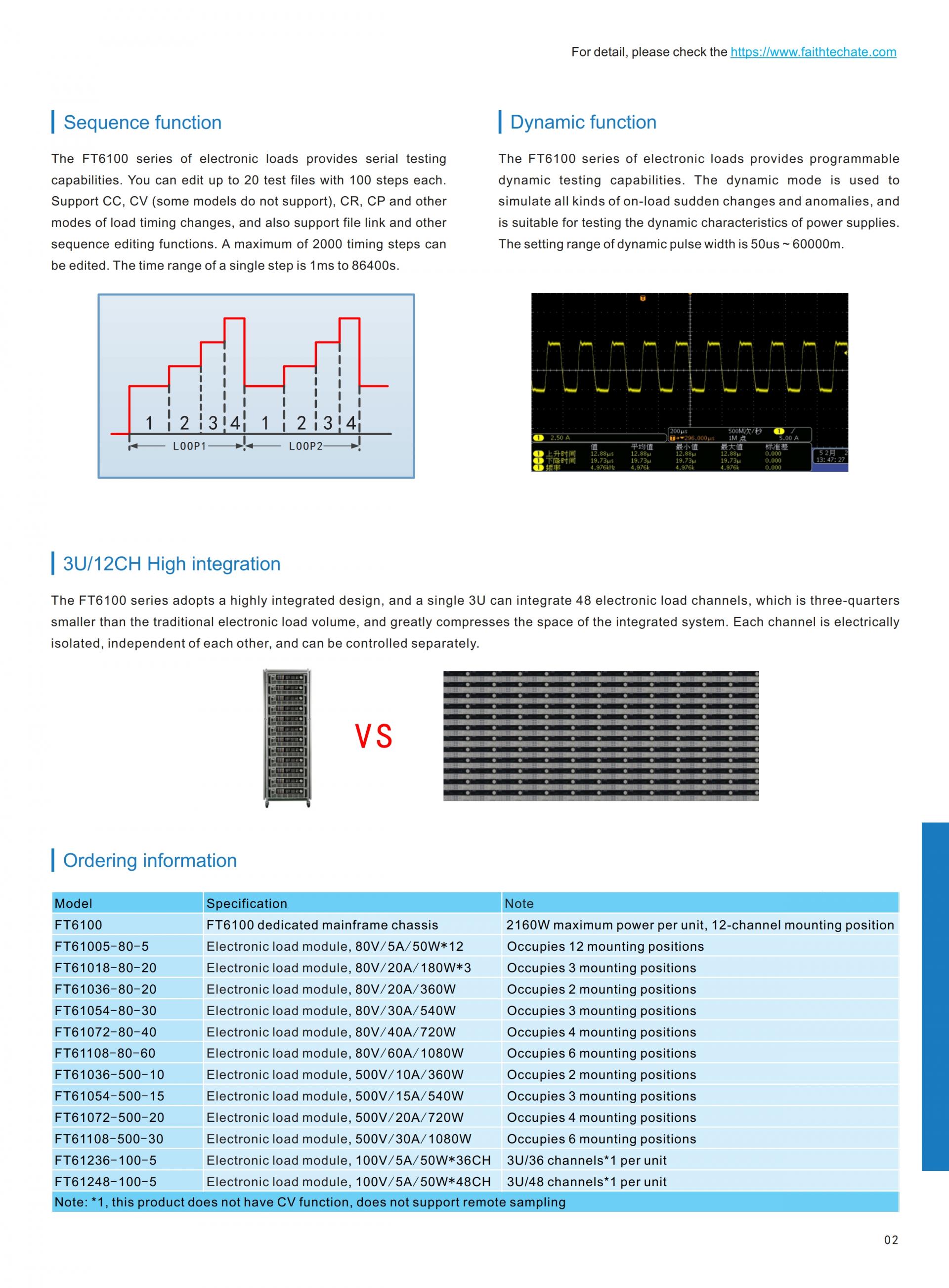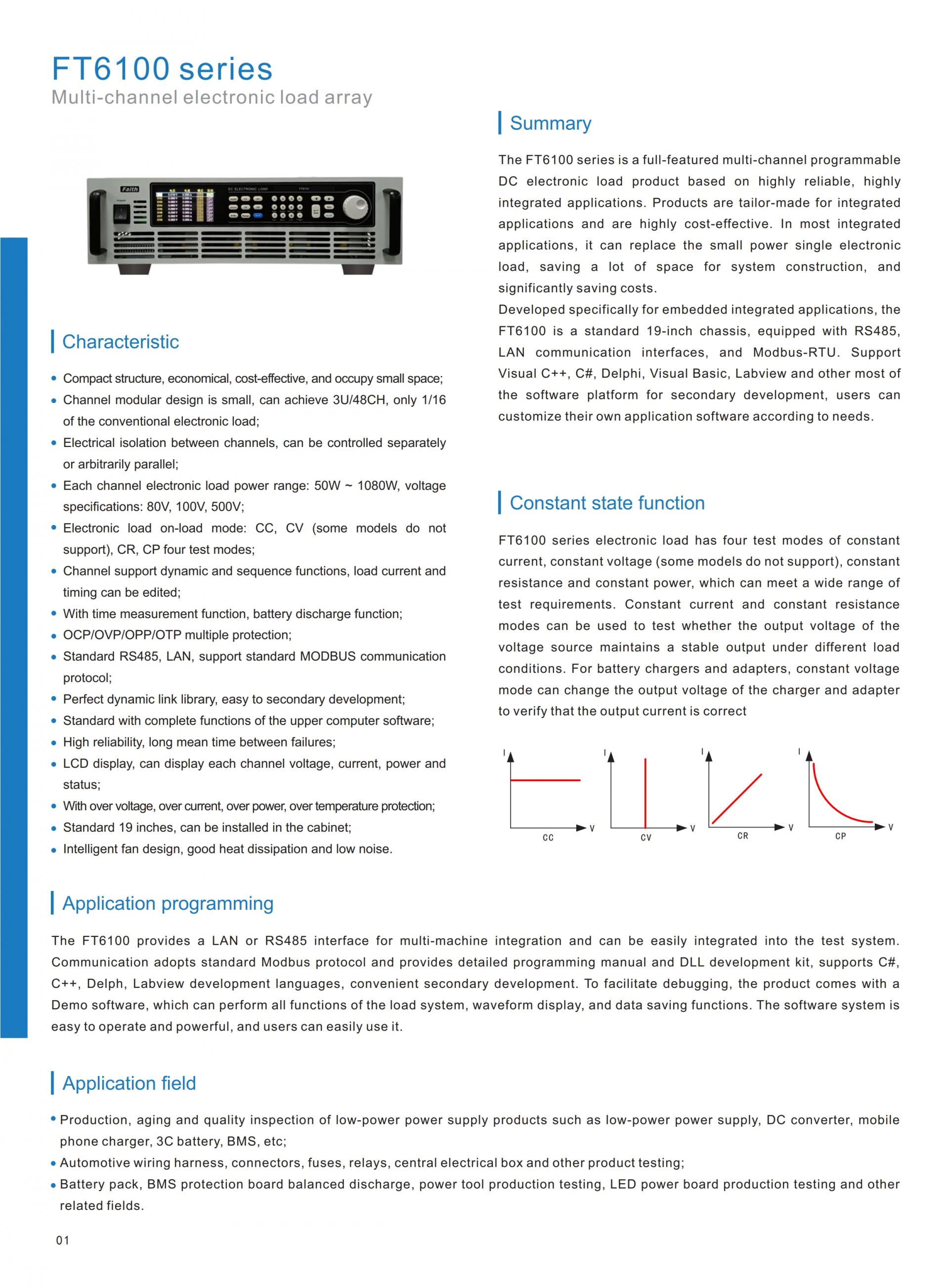 The FT6100 series is a full-featured multi-channel programmable DC electronic load product based on highly reliable, highly integrated applications. Products are tailor-made for integrated applications and are highly cost-effective. In most integrated applications, it can replace the small power single electronic load, saving a lot of space for system construction, and significantly saving costs.