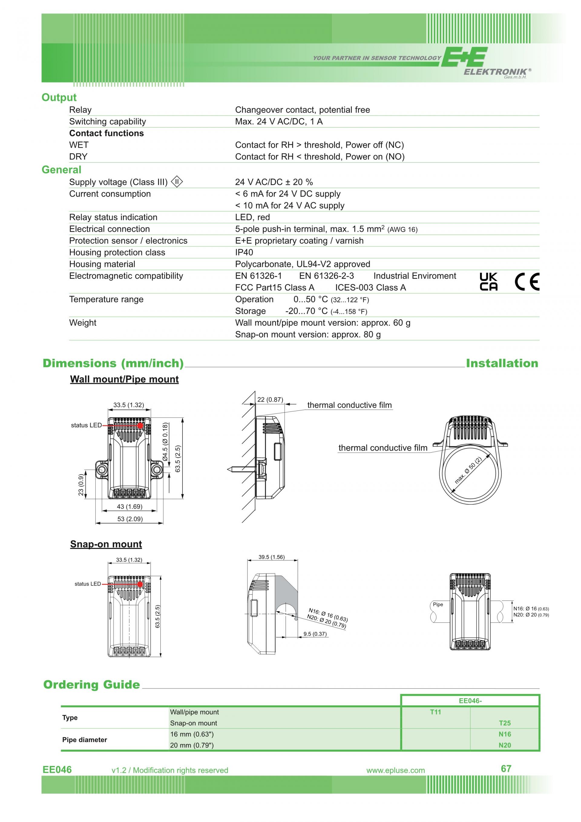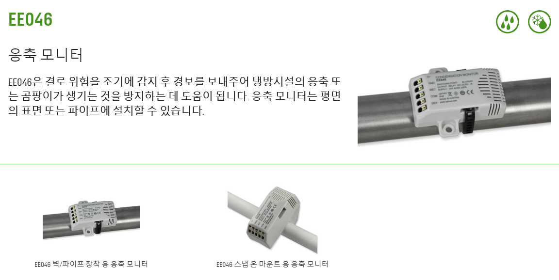 EE046 응축모니터는 표면의 상대습도(RH)를 정확하게 측정하여 공기 중의 상대습도가 100%에 도달 할 때 발생되는 응축 위험을 조기에 감지 합니다. 응축이 발생하기 직전인 90%RH에 도달하면 릴레이 출력을 통해 조기 경보를 보내는데 이는 전원공급 오류 또는 케이블 손상을 알려 줍니다. 또한 LED는 EE046의 작동 상태 (정상작동 / 알람 / 전원공급 오류)를 나타냅니다.