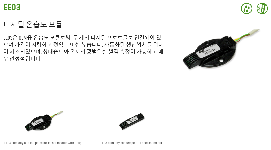 내장된 마이크로프로세서는 교정 데이터를 유지하며, 최대 범위의 온습도 출력을 제공합니다. EE03은 간단한 E2 디지털 프로토콜을 사용하여, 적은 비용으로 마이크로프로세서를 기반으로하는 제어장비들과 연동하여 제어 및 모니터링을 할 수 있습니다.