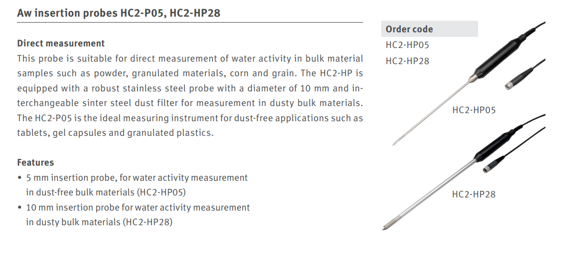 삽입 프로브는 먼지가 없는 벌크 재료, 벽돌, 콘크리트 등의 측정에 적합합니다. 습도와 온도를 측정하고 이슬점/서리점을 계산합니다. 응용 분야 수분 활동도 측정, 휴대용 휴대용 기기 및 데이터 로거
