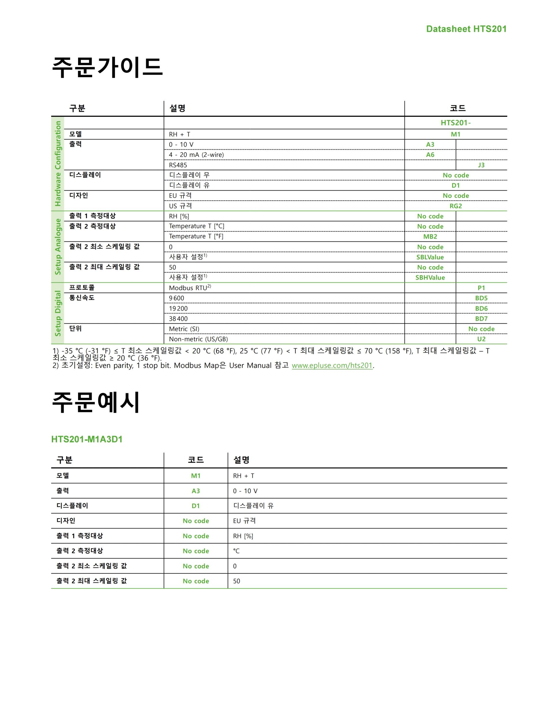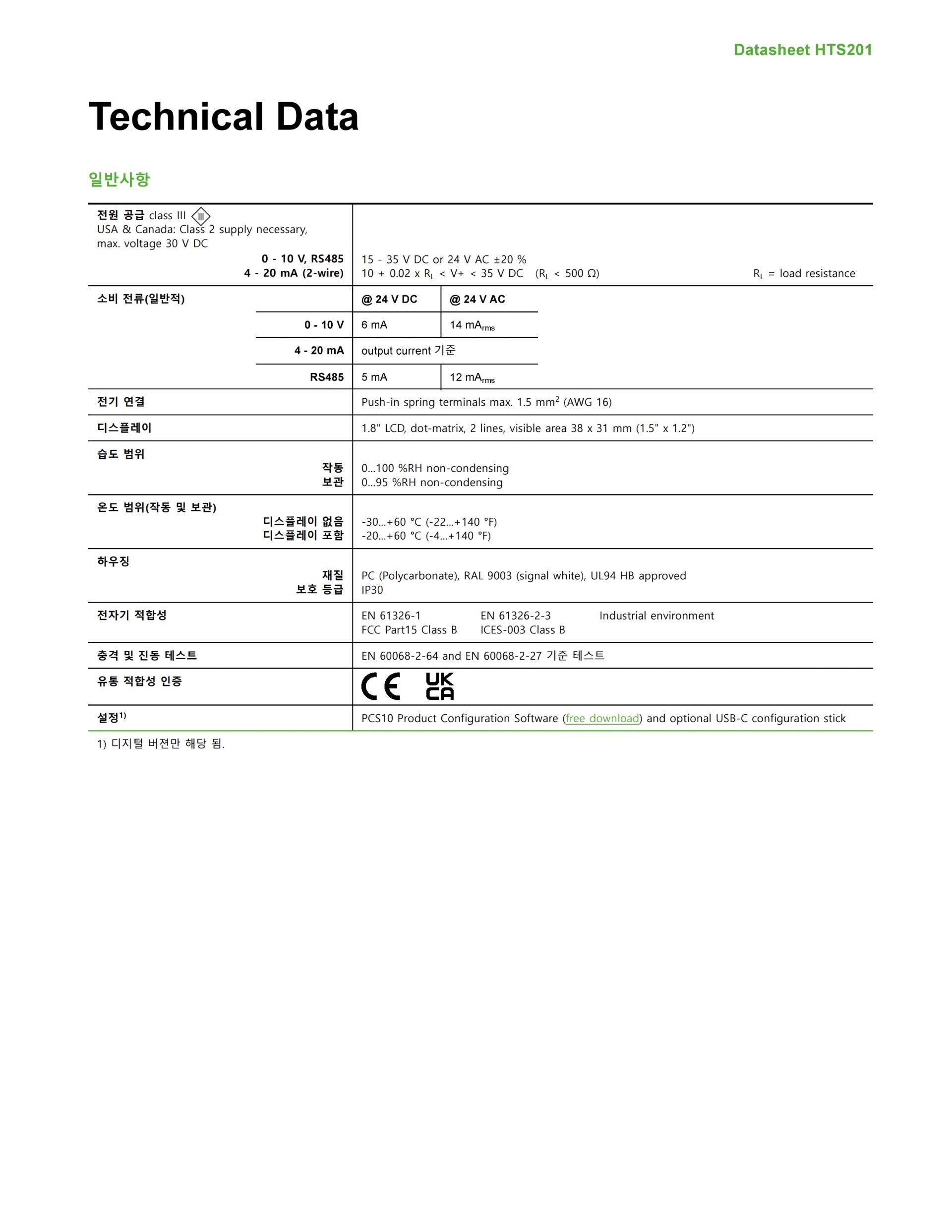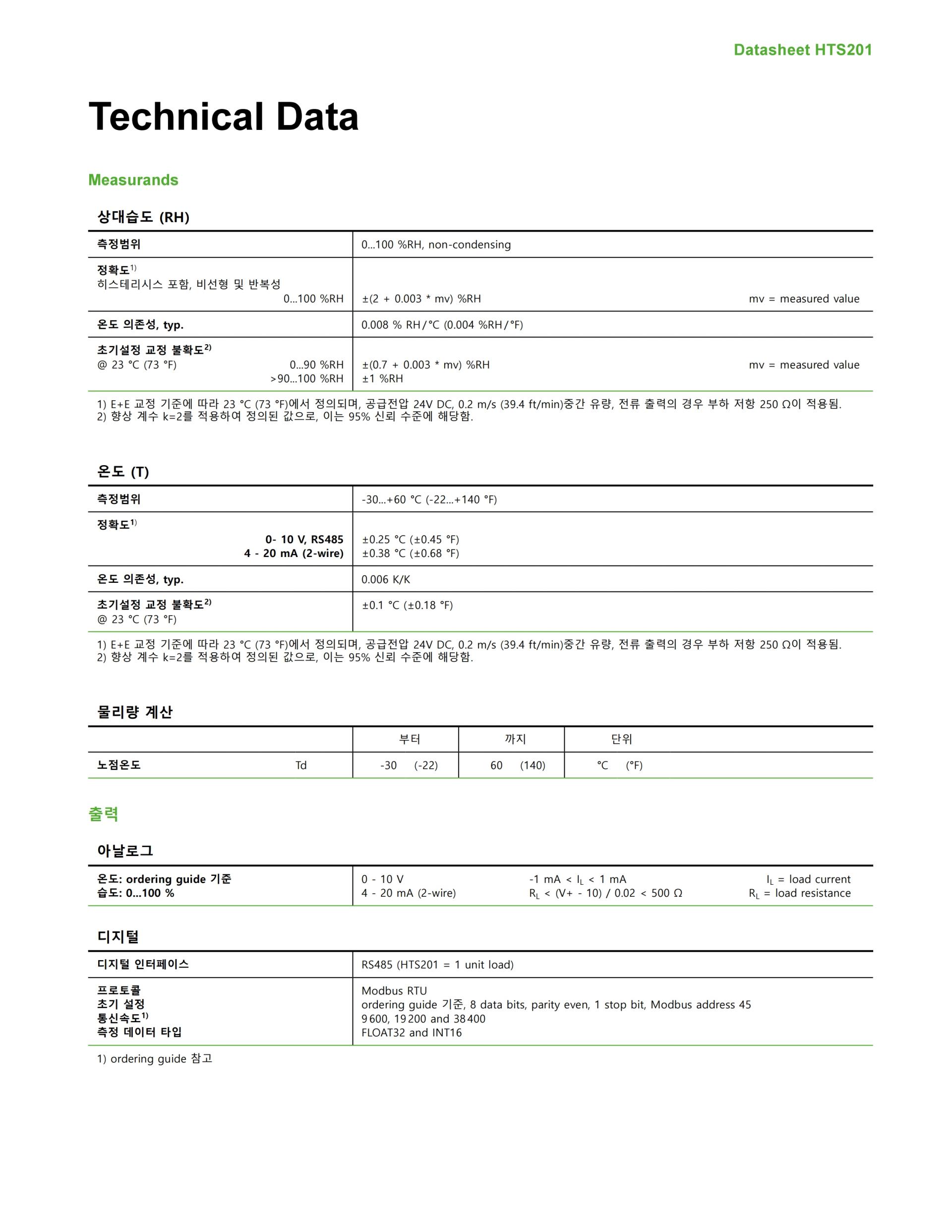 상대 습도 및 온도 측정 데이터는 두 개의 아날로그 출력 또는 Modbus RTU 또는 BACnet MS/TP 프로토콜의 디지털 RS485 인터페이스에서 사용할 수 있습니다. 또한 이슬점 온도(Td)는 Modbus RTU 및 BACnet MS/TP를 통해 사용할 수 있습니다.