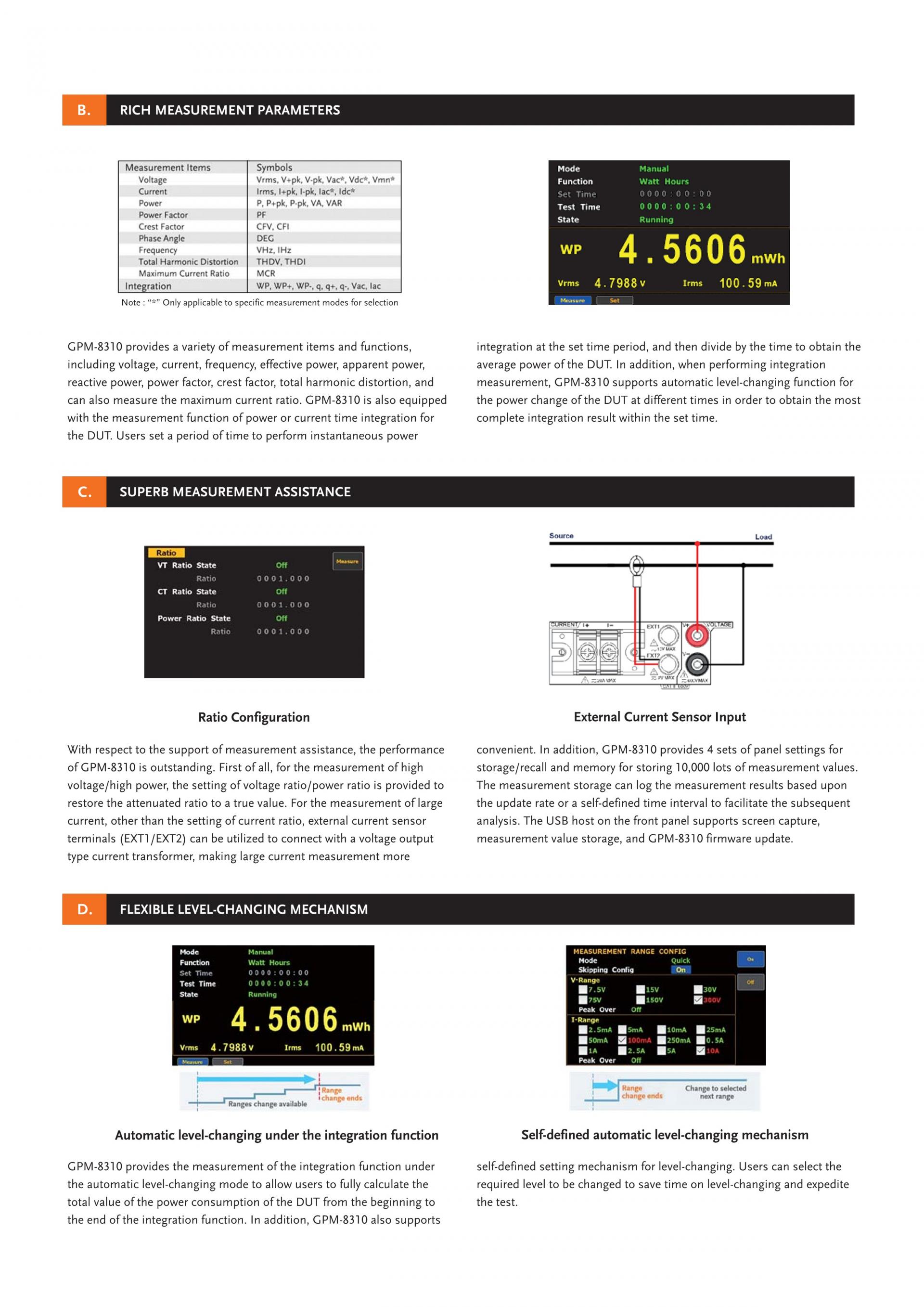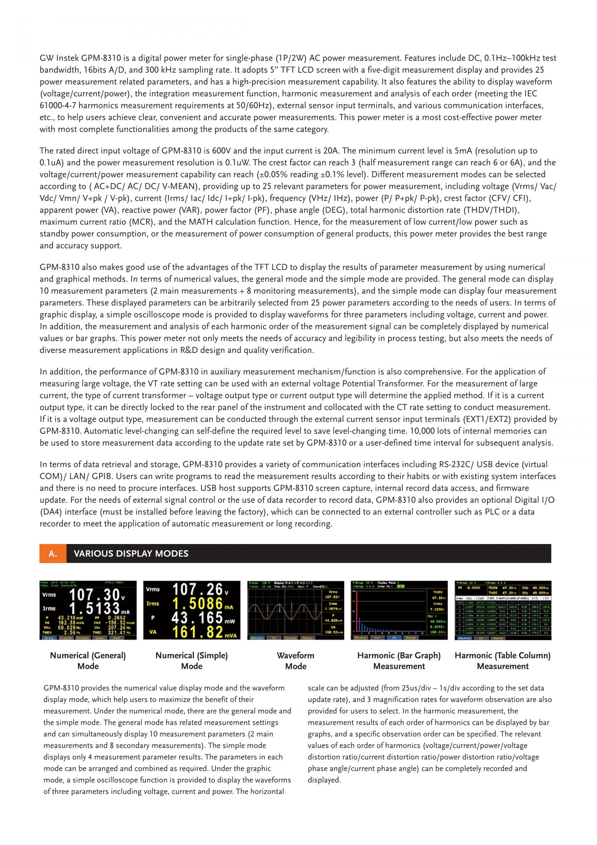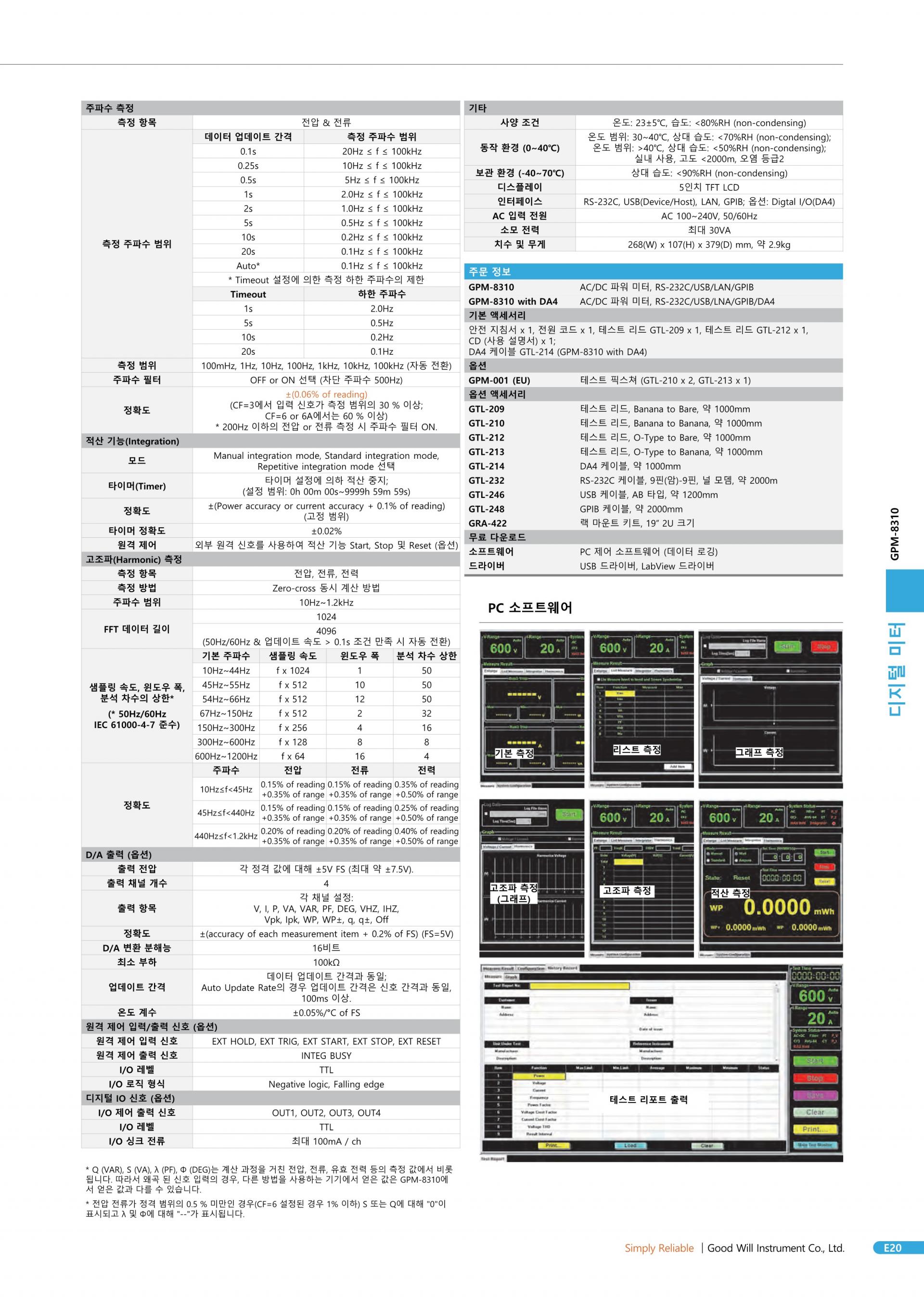 GW Instek GPM-8310은 단상(1P/2W) AC 전력 측정용 디지털 파워미터입니다. DC, 0.1Hz~100kHz 테스트 대역폭, 16bits A/D, 300kHz 샘플링 속도가 특징입니다. 5자리 측정 디스플레이가 있는 5인치 TFT LCD 화면을 채택하고 25개의 전력 측정 관련 매개변수를 제공하며 고정밀 측정 기능을 갖추고 있습니다. 또한 파형(전압/전류/전력)을 표시하는 기능, 통합 측정 기능, 각 차수의 고조파 측정 및 분석, 외부 센서 입력 단자 및 다양한 통신 인터페이스 등을 제공하여 사용자가 명확하고 편리하며, 정확한 전력 측정. 이 파워미터는 같은 카테고리의 제품 중 가장 완벽한 기능을 갖춘 가장 가성비 좋은 파워미터입니다.