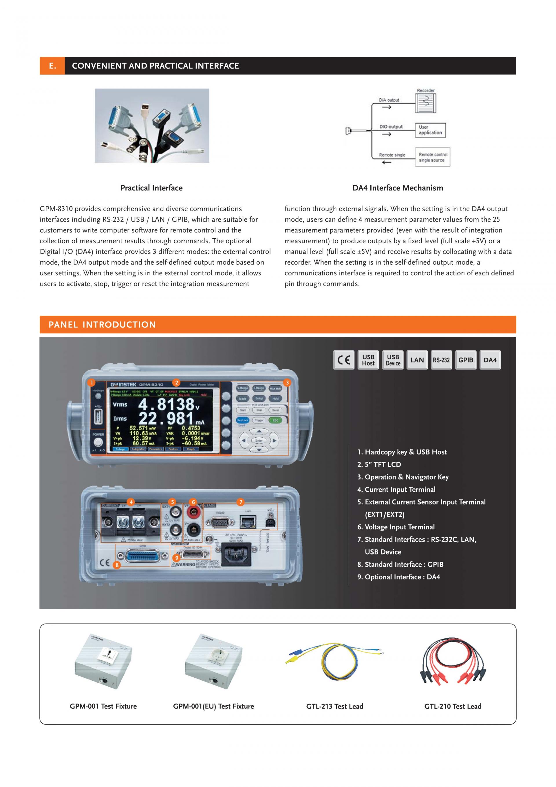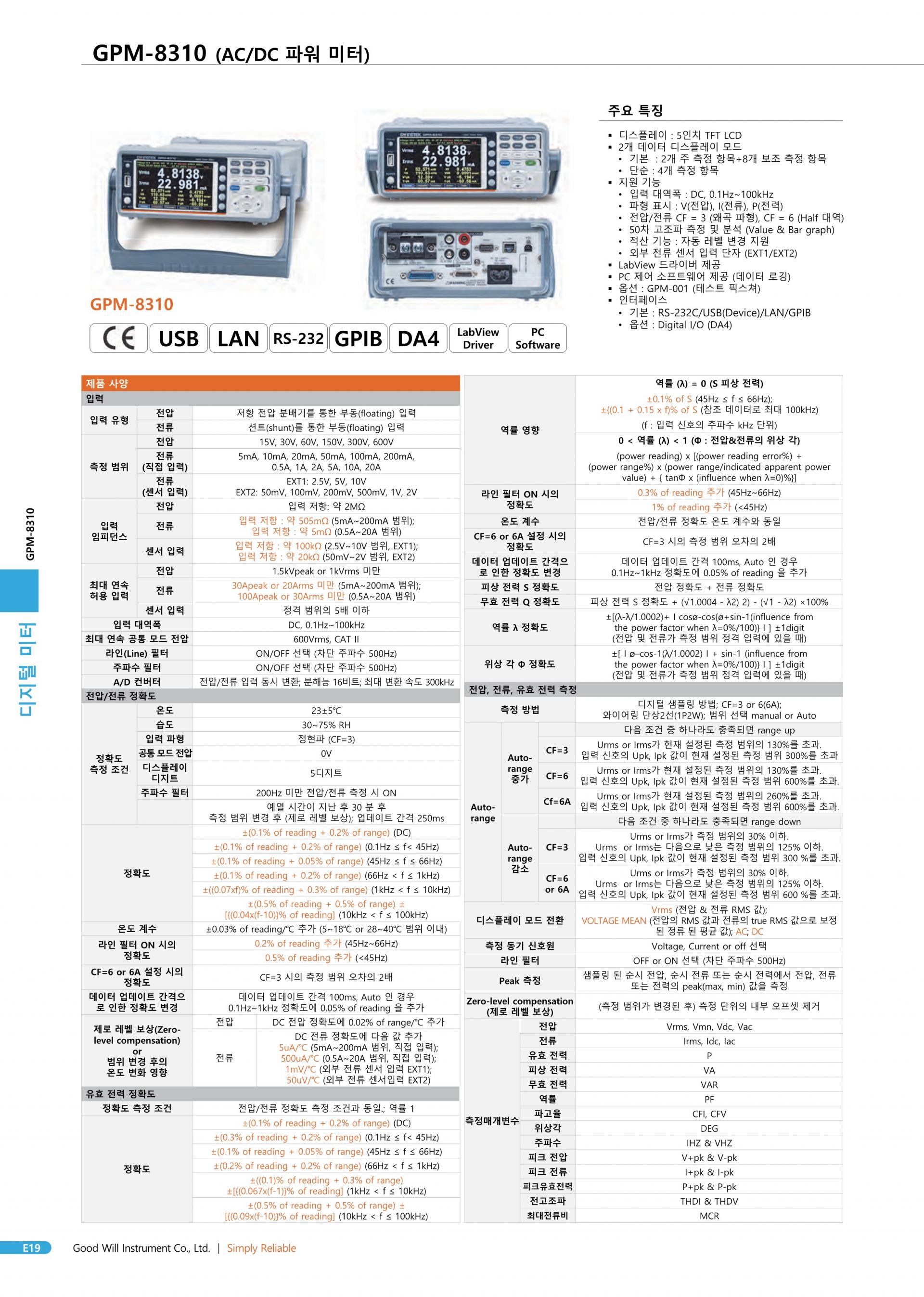 - 표준 인터페이스: RS-232C, USB 장치/호스트, LAN, GPIB