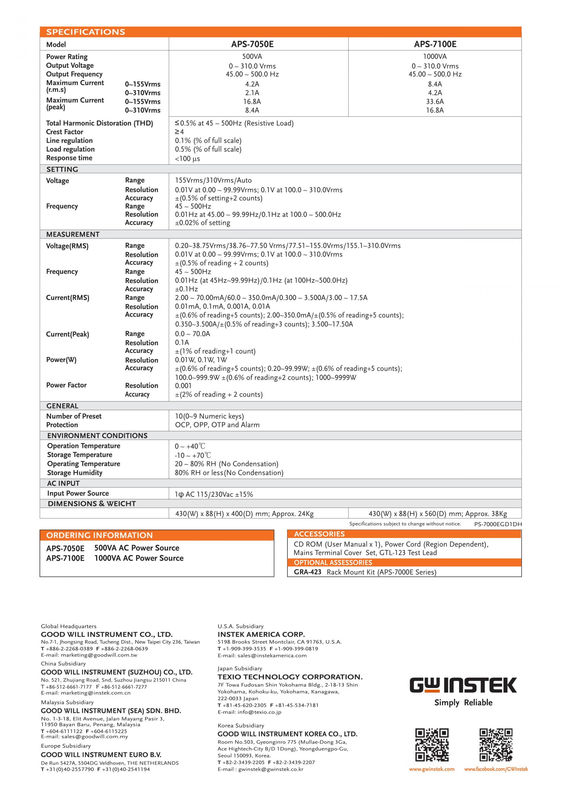 - Output Capacity: APS-7050E(500VA, 310Vrms, 4.2/ 2.1Arms), APS-7100E(1000VA, 310Vrms, 8.4/ 4.2Arms)