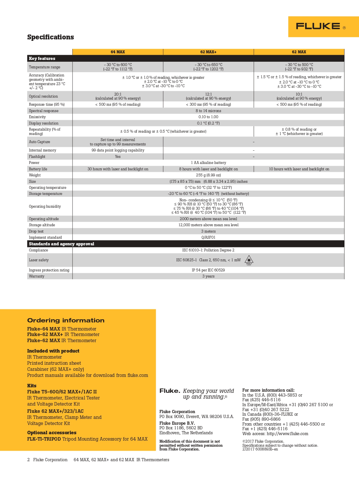 새로 출시된 Fluke 62 MAX 및 62 MAX+ 적외선 온도계는 온도 측정 분야의 전문가들이 설계하여 작업에 유리한 특성을 모두 갖추고 있습니다. 작은 크기, 극도의 정확성, 간편한 사용법. IP54 등급의 방진 및 방수 기능. 3미터 낙하에도 끄떡없는 견고함과 정교함. 실제로 62 MAX와 62 MAX+는 매우 단단하므로 손상 염려없이 사용할 수 있는 유일한 IR 온도계입니다.