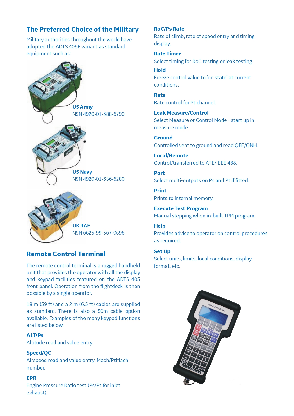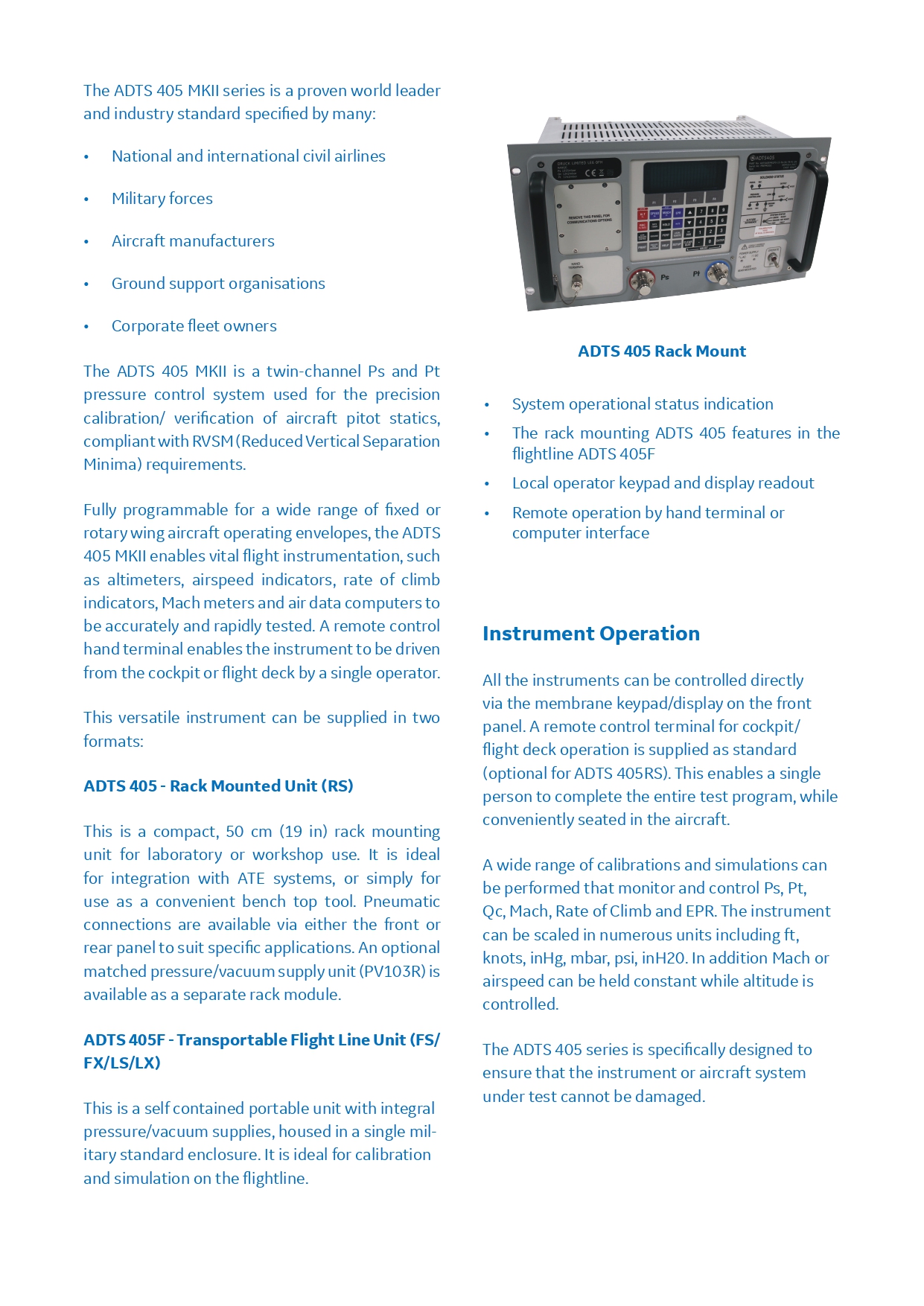 ADTS 405는 항공기 동정압의 정밀 교정/검증에 사용되는 이중 채널 Ps 및 Pt 압력 제어 시스템으로써 RVSM (Reduced Vertical Separation Minima) 요건을 충족합니다.