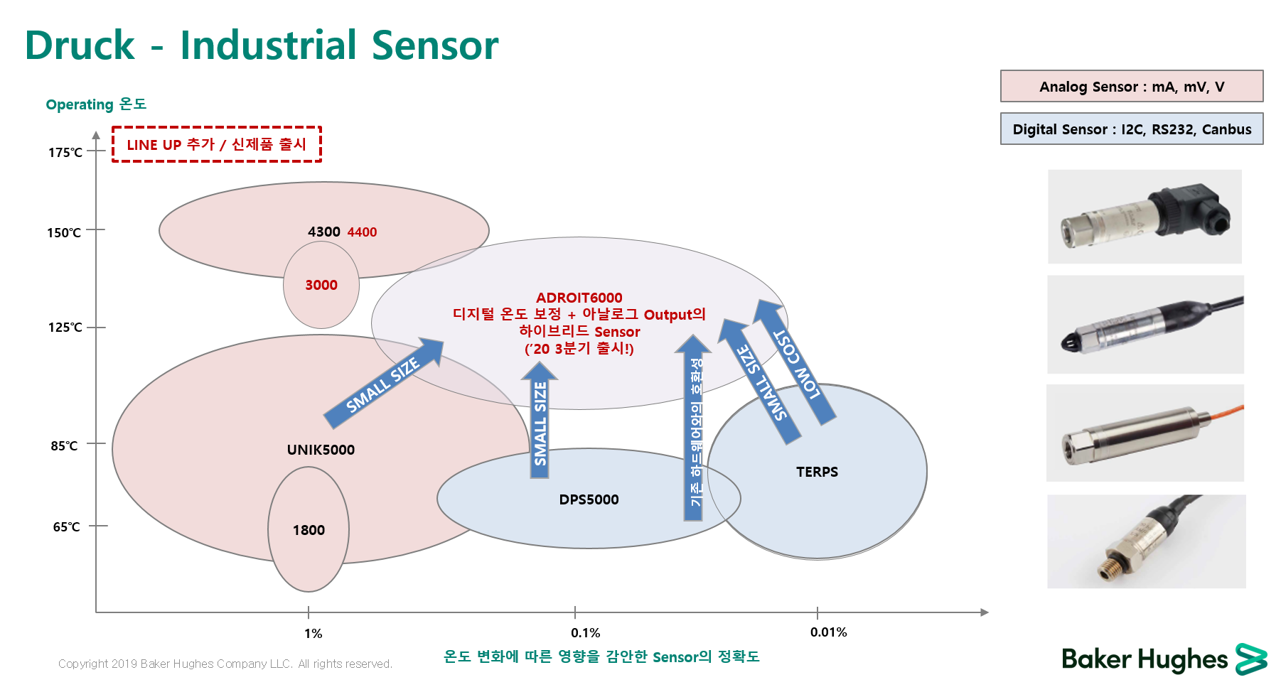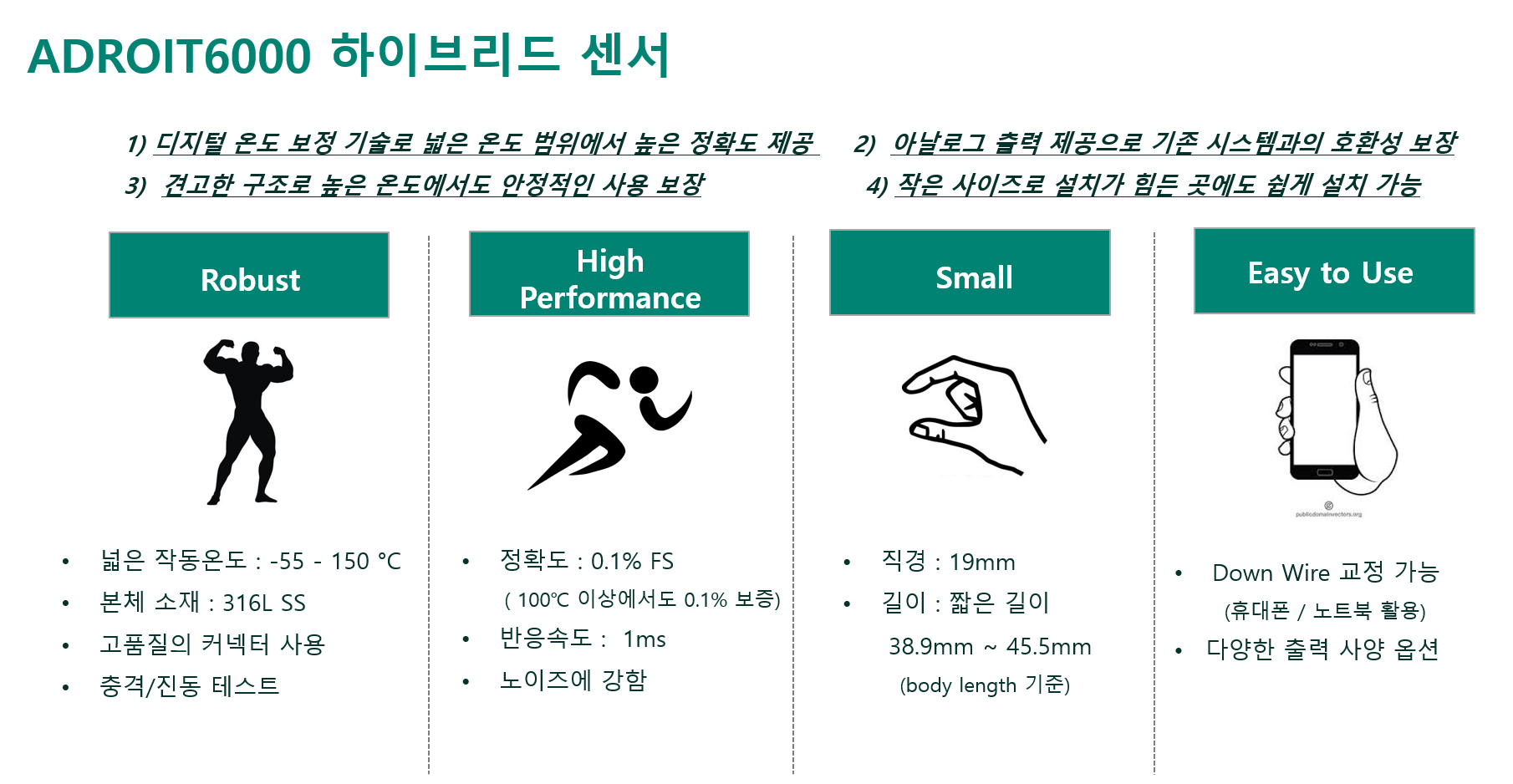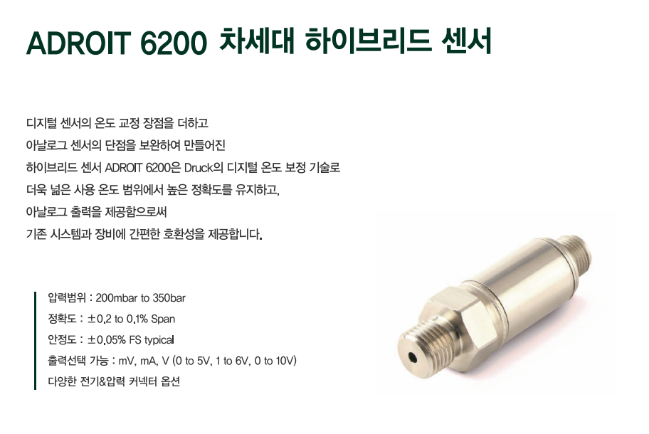 디지털 센서의 온도 교정 장점을 더하고 아날로그 센서의 단점을 보완하여 만들어진 ADROIT6200 은 아날로그 센서이지만 내장된 디지털 모듈을 통해서 온도 변화에 따른 측정값을 보정을 해주는 하이브리드 센서 입니다.