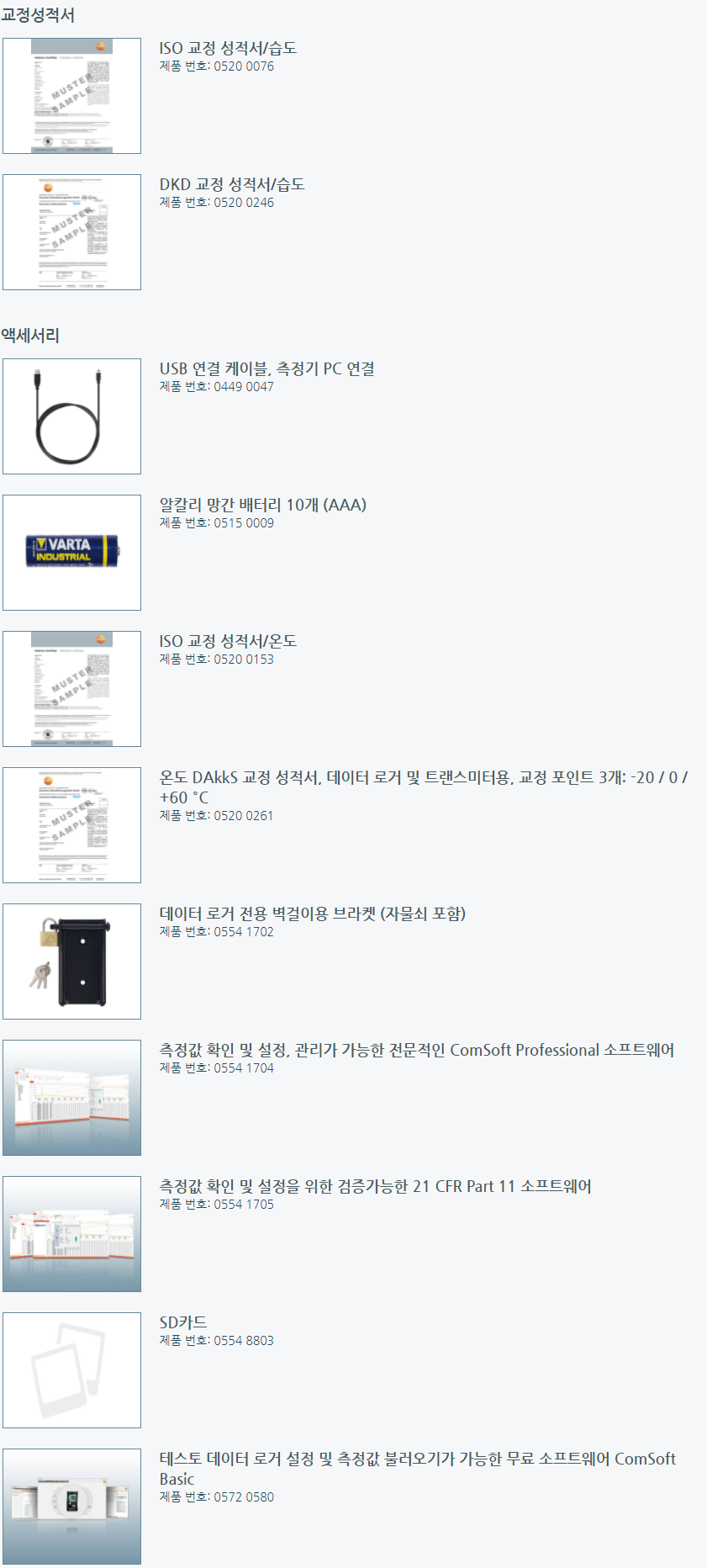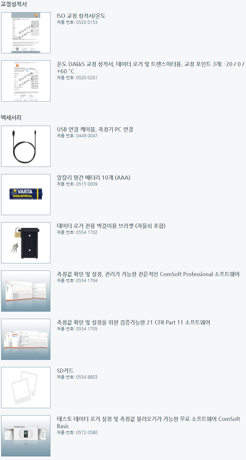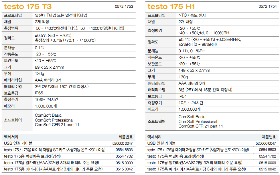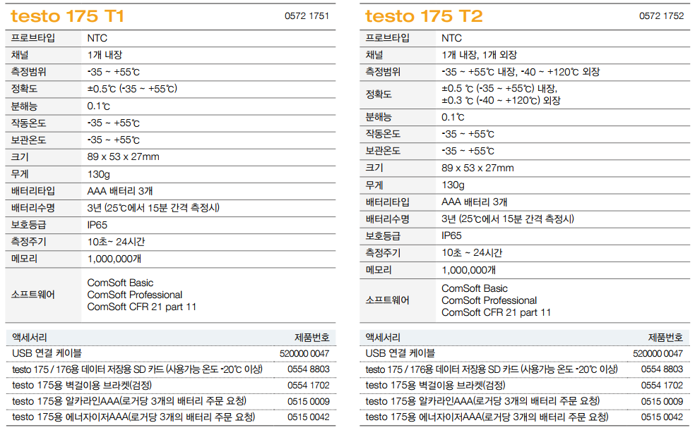 주의: 2채널 온도 로거 testo 175 T3를 사용하기에 앞서 최소 하나 이상의 열전대 프로브(별도 구매)를 선택해야 합니다. 또한 데이터 로거를 PC에 연결하기 위한 USB 케이블은 추가 주문하셔야 합니다. 2채널 온도 로거 testo 175 T3로 측정한 값을 PC로 전송하려면 USB 케이블 또는 SD 카드가 필요합니다. USB 케이블이나 SD카드가 없다면, 데이터 로거 주문 시, 반드시 추가 구매하셔야 합니다.