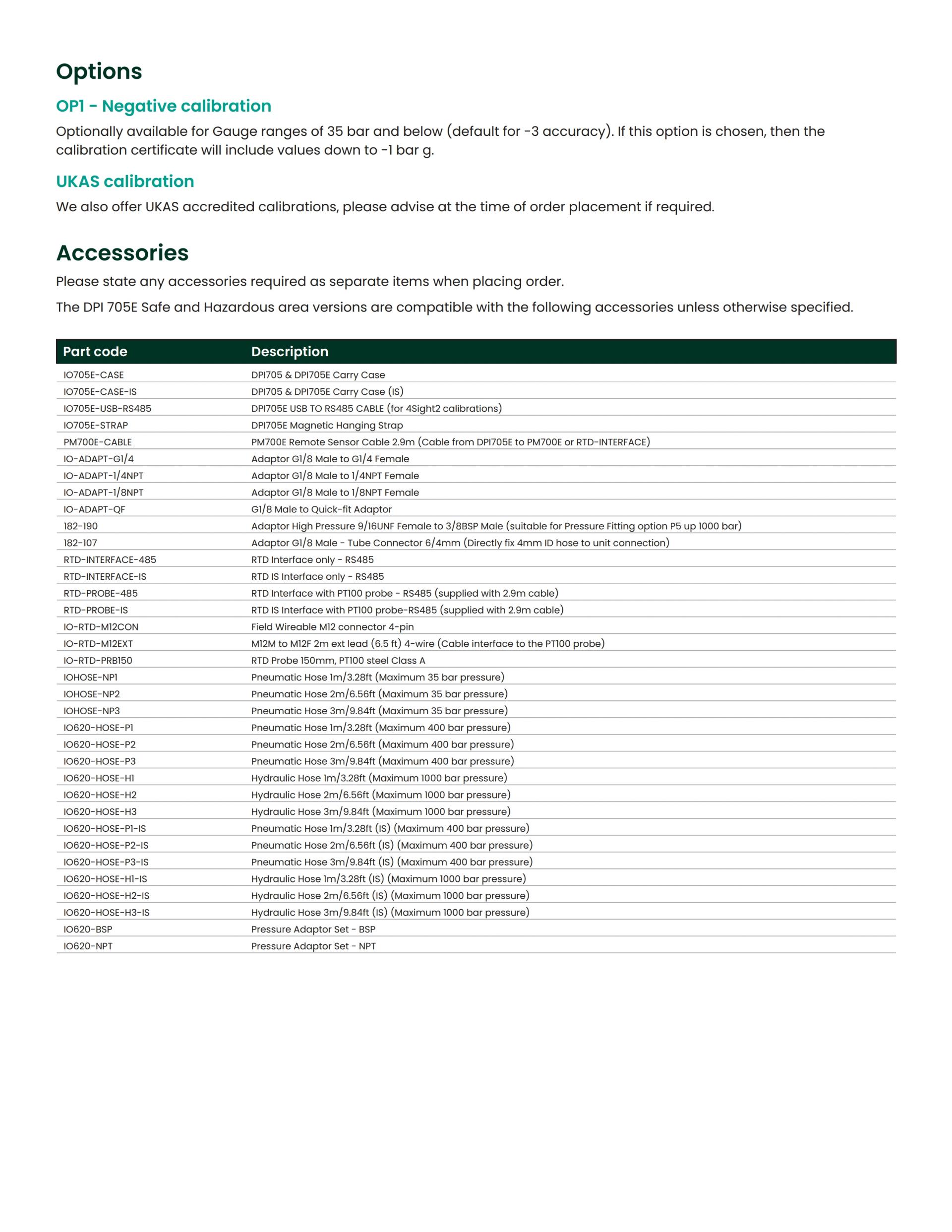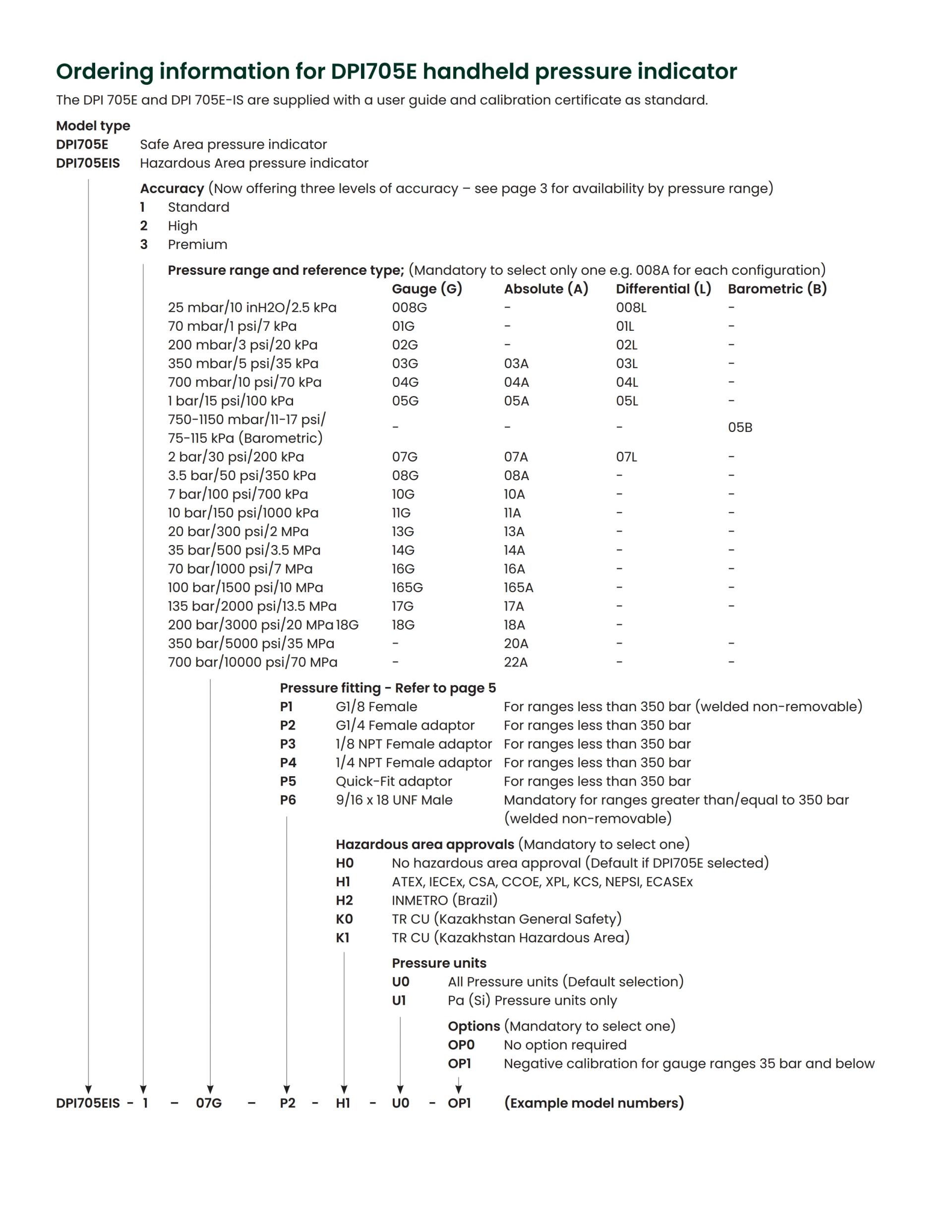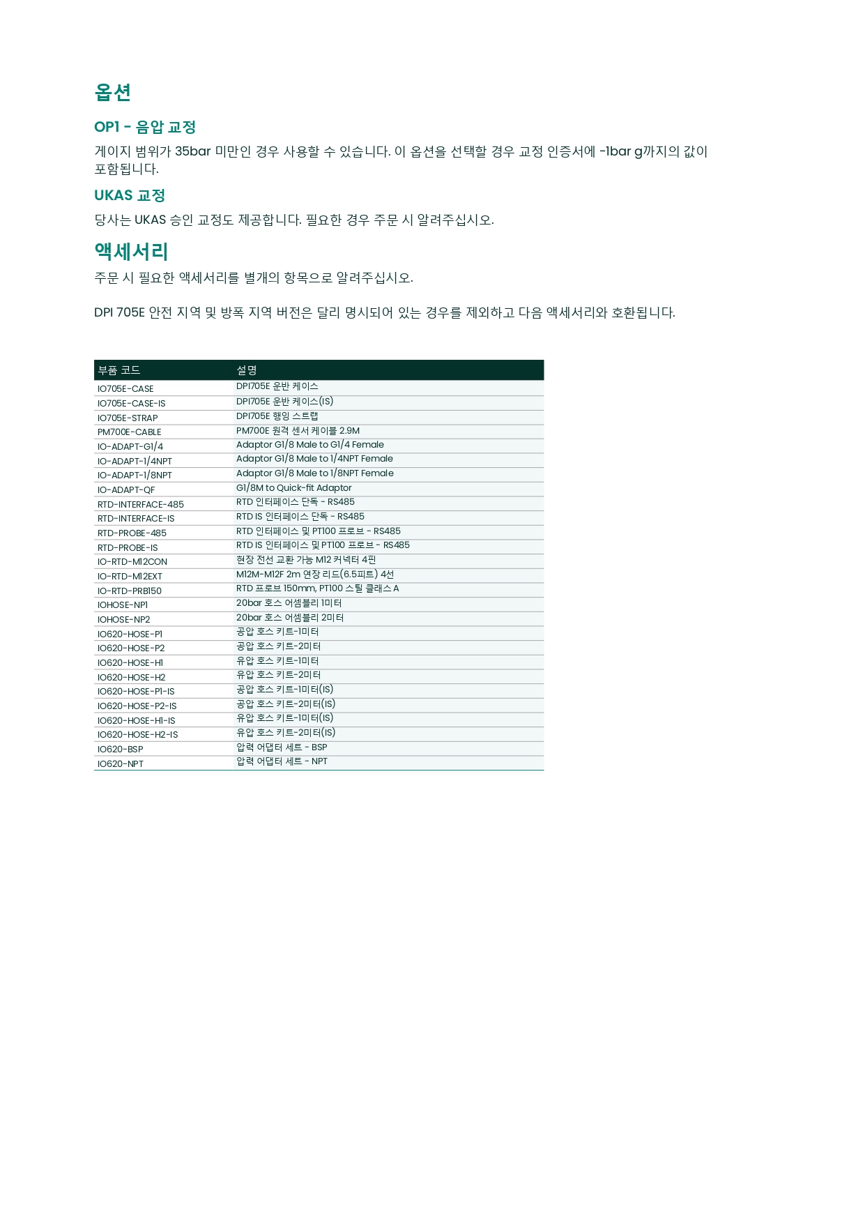 배터리 • 4 x AA 알카라인 / NiCd / NiMH 셀 • 전력 효율적인 설계, 단일 배터리 세트를 사용하여 하루 8 시간, 주 6 일 1 년 동안 사용할 수 있습니다. 디스플레이 16mm LCD with ±99999 readout 승인 • IS Class I, Groups A, B, C & D, T4 Ex ia; Class I, Zone 0, AEx/Ex ia IIC T4 Ga (-10°C ≤ Ta ≤ +50°C) to CSA Std. 157-92, UL 913 (7th Ed.), CAN/CSA-C22.2 No. 60079- 0:2018, CAN/CSA-C22.2 No. 60079-11:2012, ANSI/UL 60079-0:2018 and ANSI/UL 60079-11:2012. • Ex ia IIC T4 Ga (-10°C ≤ Ta ≤ +50°C) to ATEX IEC 60079-0:2017 and EN 60079-11:2011 압력 범위 내부 및 원격 센서에는 아래에 설명과 같이 압력 커넥터가 장착되어 있습니다. • 25 mbar – 200 bar (10 inH2O-3000 psi / 2.5 kPa-20 MPa) : G1 / 8 BSP Female • 차압 기준 포트 : Legris 4 mm 튜브 어댑터 • ≥350 bar (5000 psi / 35 MPa) : Autoclave 9/16 x 18 UNF Male DPI 705E 내부 센서 DPI705E에는 내부 절대압/게이지압 또는 센서가 포함되어 있습니다.