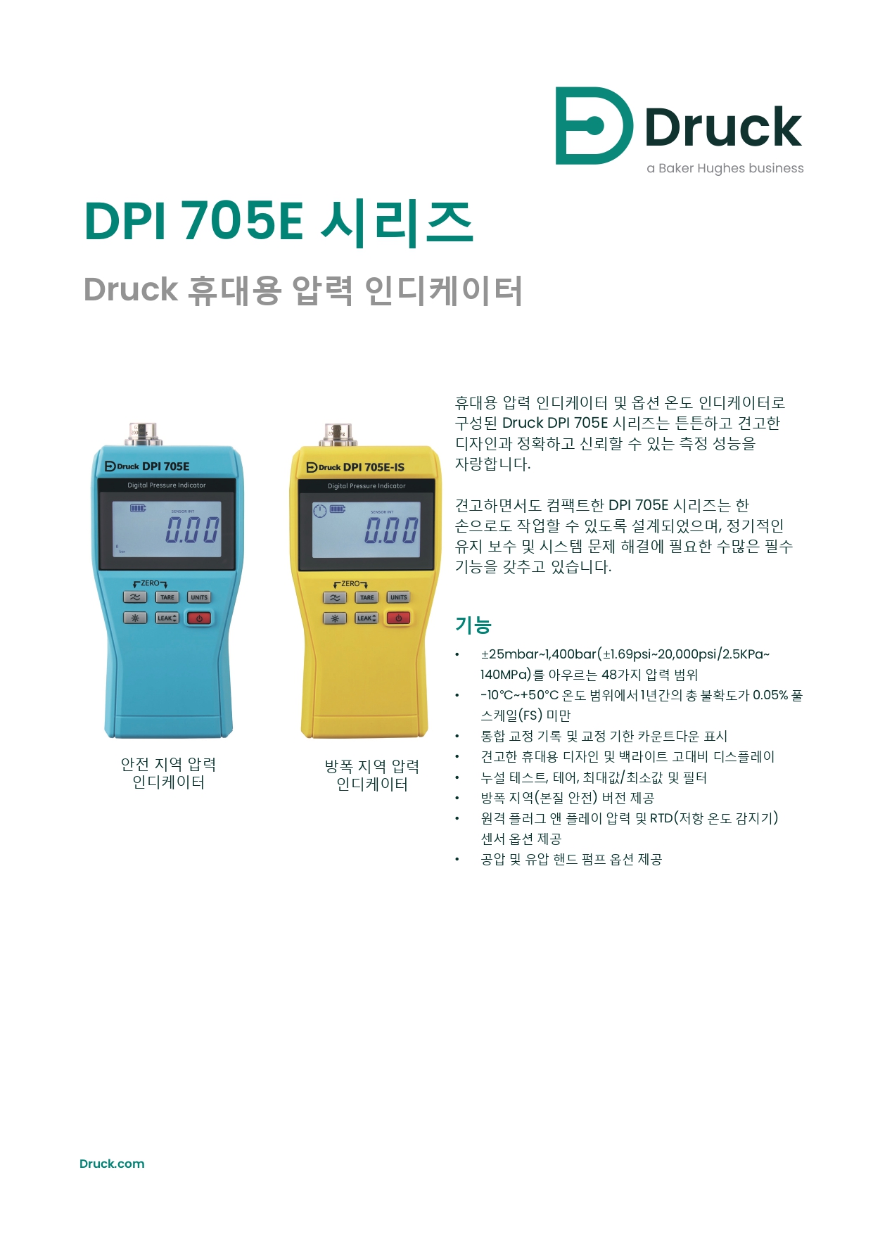 제품소개 | DPI705E Series Handheld Indicators Druck의 휴대용 압력 및 온도(옵션) 인디게이터인 DPI705E는 견고한 설계와 정확하고 신뢰할 수 있는 측정을 결합합니다. 작고 강력한 DPI705E 시리즈는 한 손으로 쉽게 작동하도록 설계되었으며, 일상적인 유지 관리 및 시스템 트러블 슈팅에 필요한 많은 필수 기능을 제공합니다. | ||||