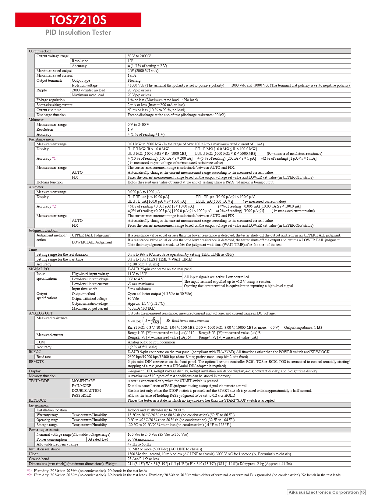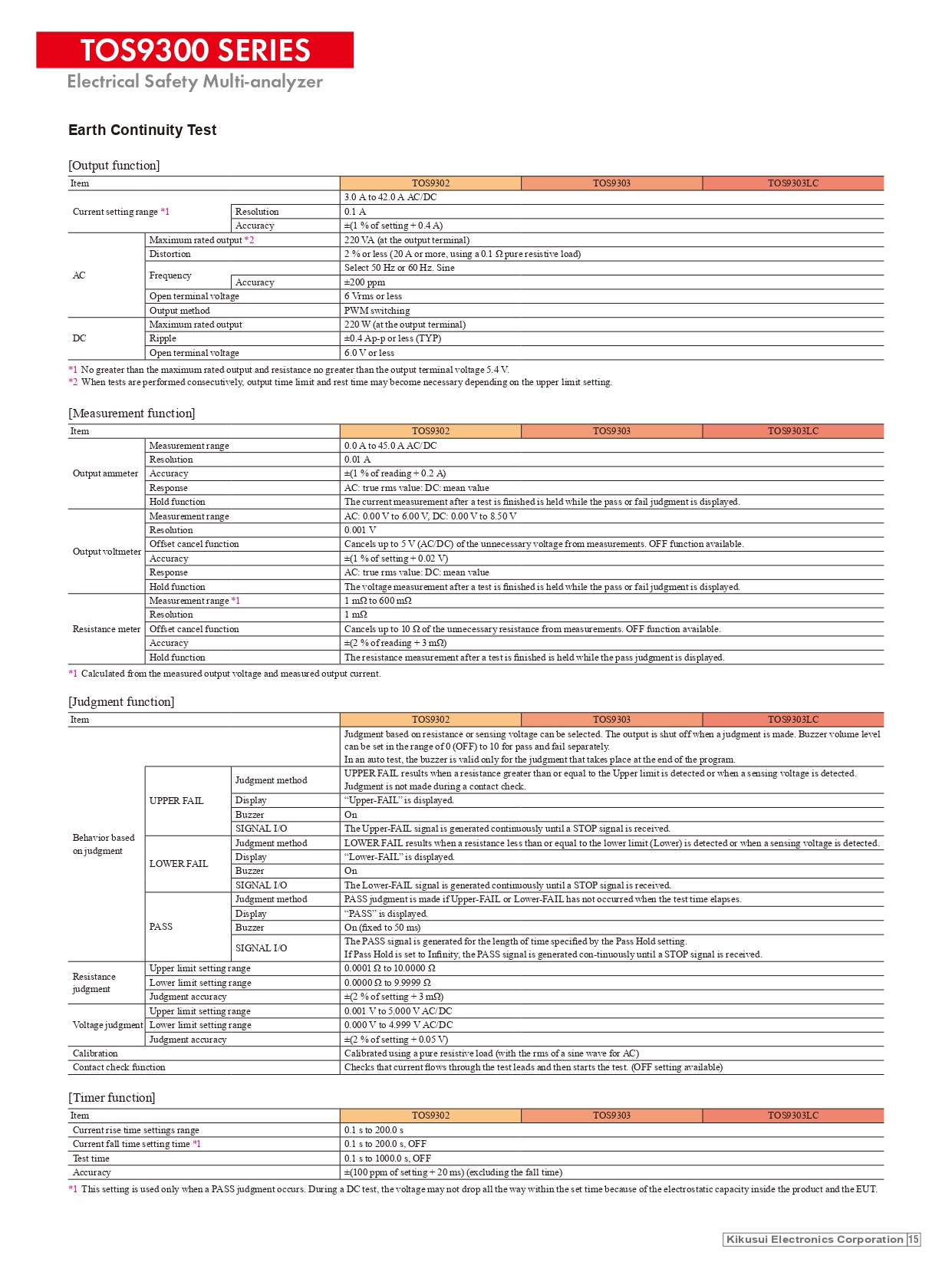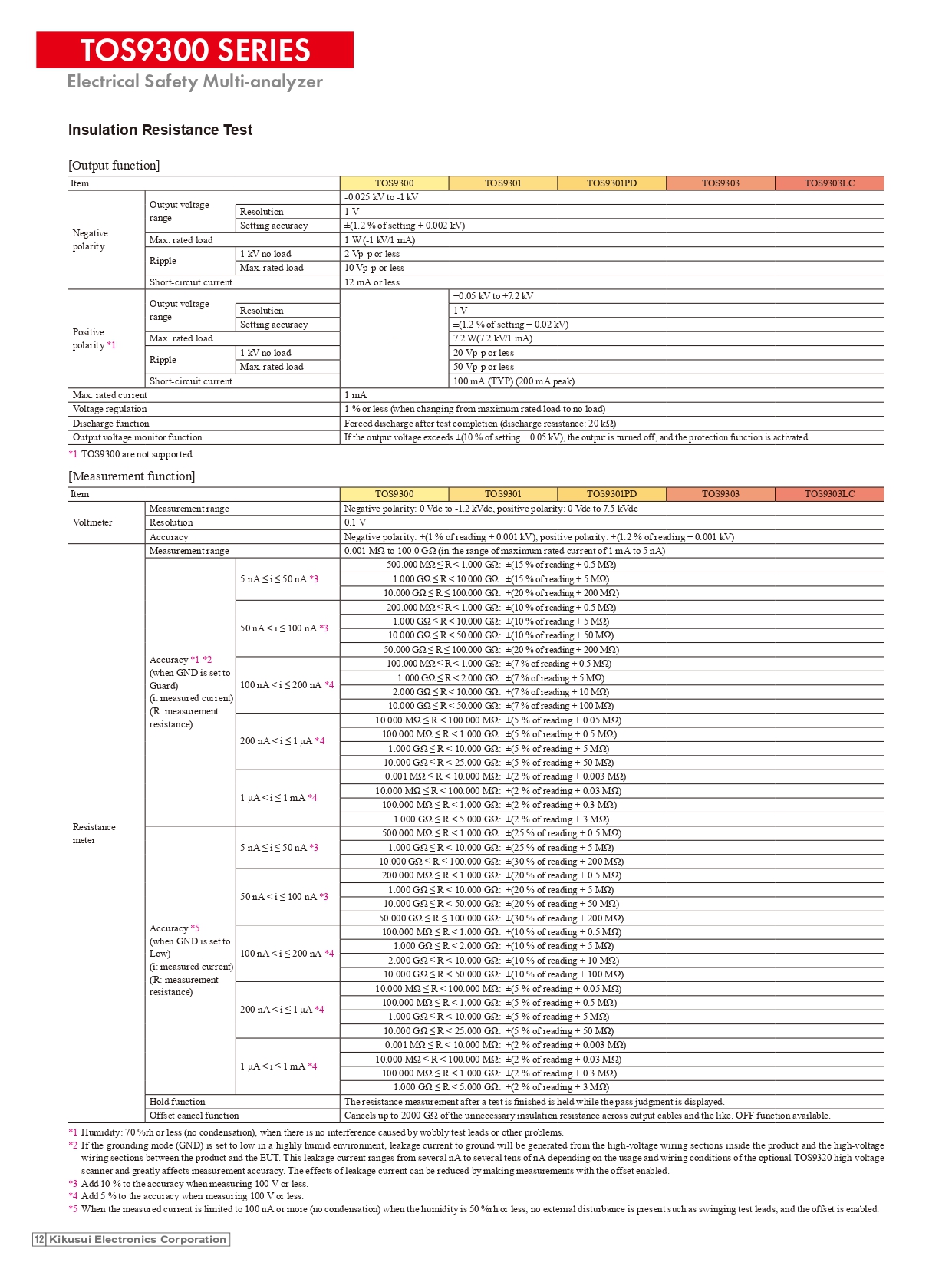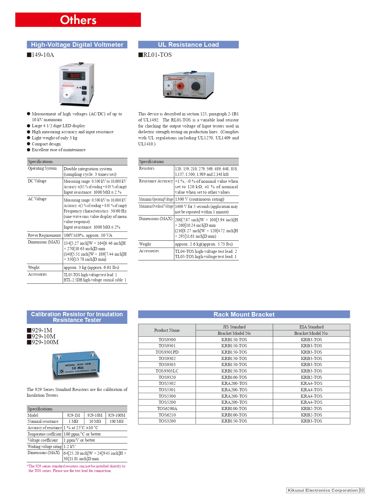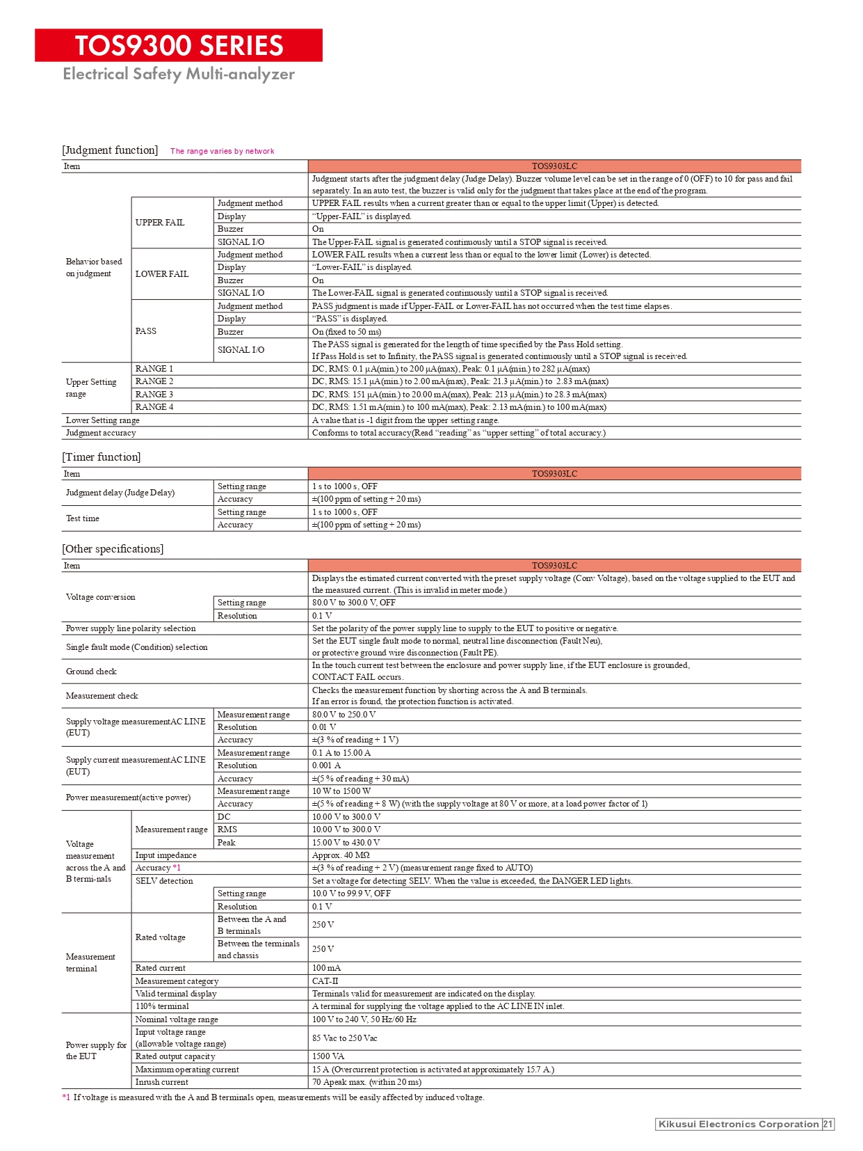| TOS7200 | Manual...출력전압 설정범위:-25V~ -1000V、저항 측정범위:0.01〜5000M Ω 、SIGNAL I/O, 리모컨 단자 탑재、RS-232C 인터페이스 표준 장비 |