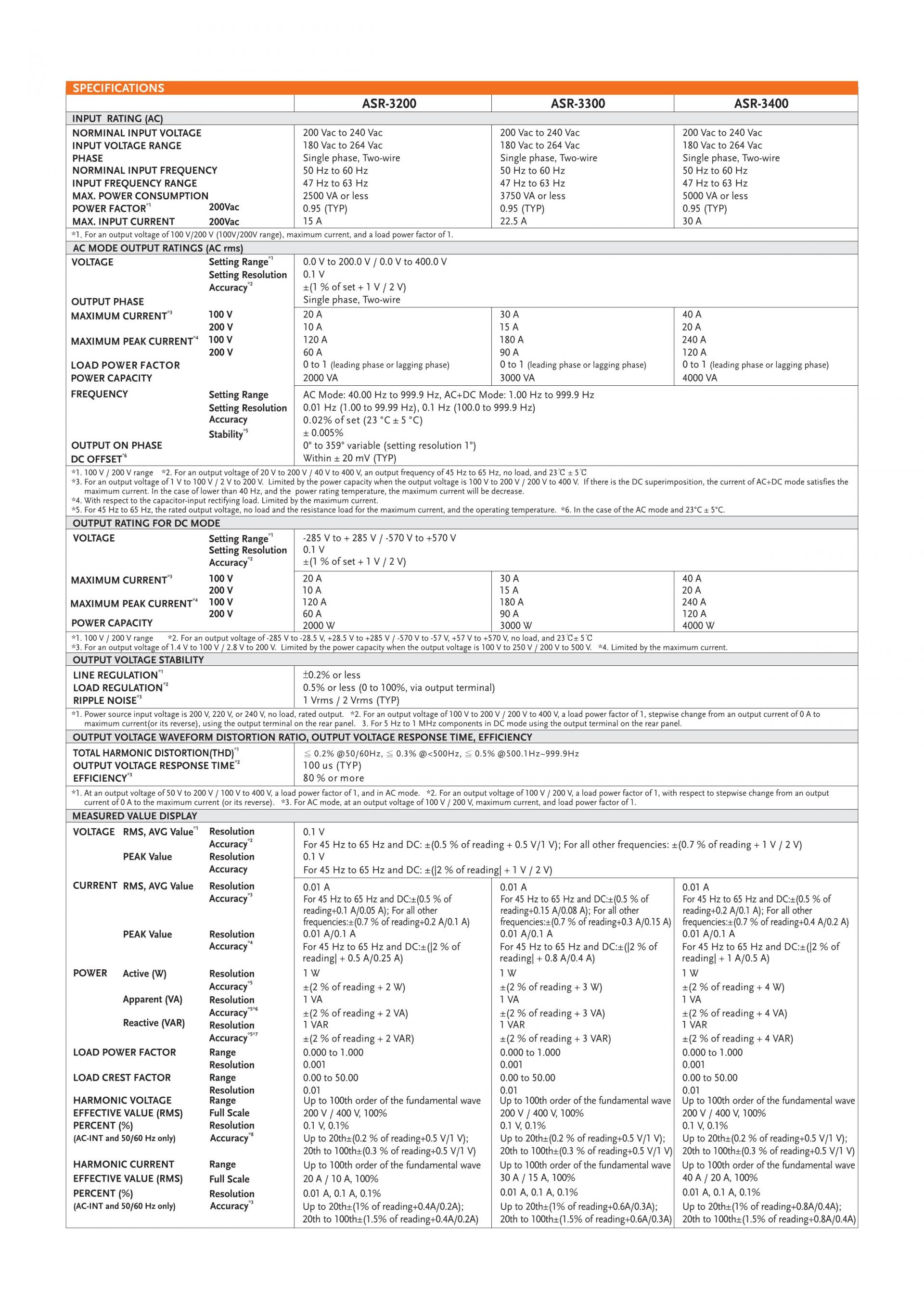 이 시리즈에는 ASR-3200 (2kVA), ASR-3300 (3kVA) 및 ASR-3400 (4kVA)의 세 가지 모델이 있으며 AC 와 DC 로 9 가지의 출력 모드를 제공합니다. 9 개의 ASR-3000 시리즈 출력 모드는