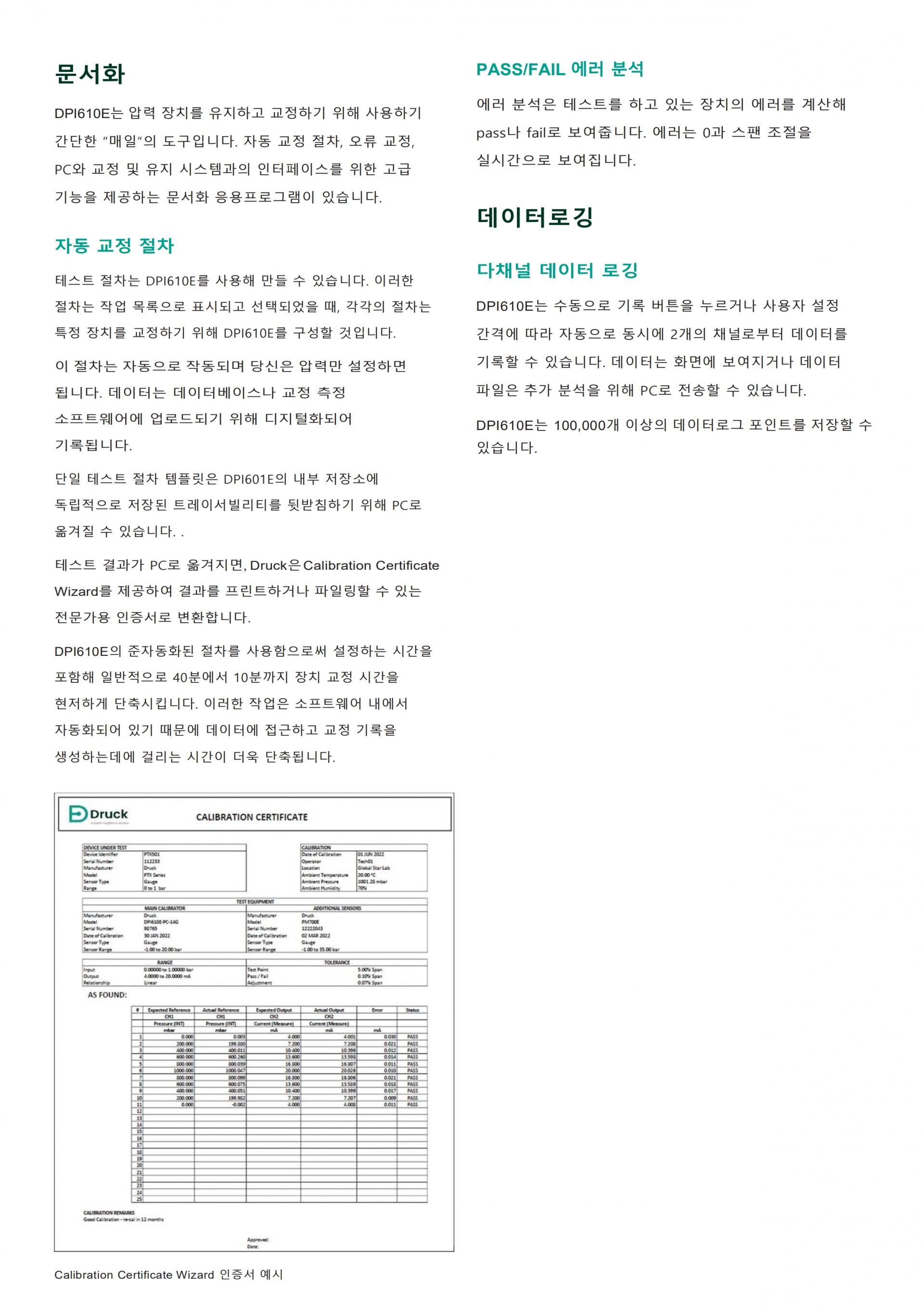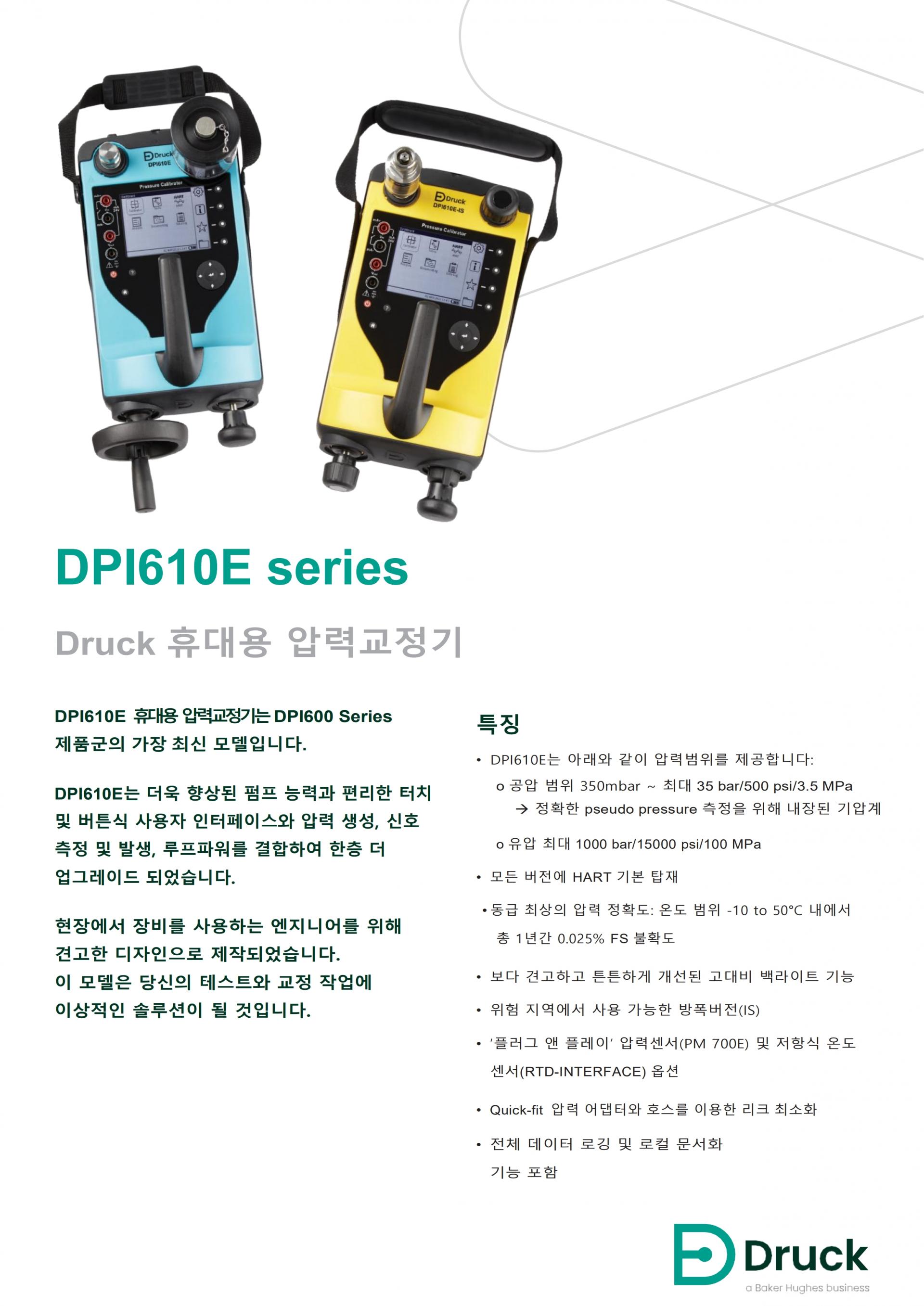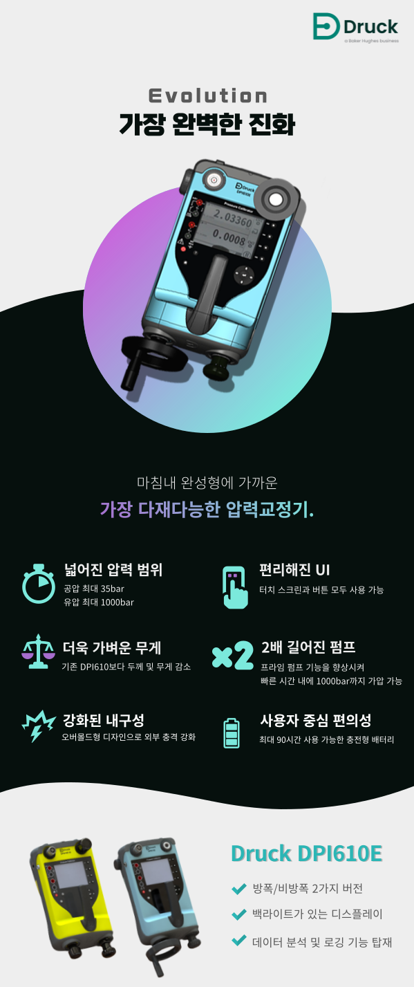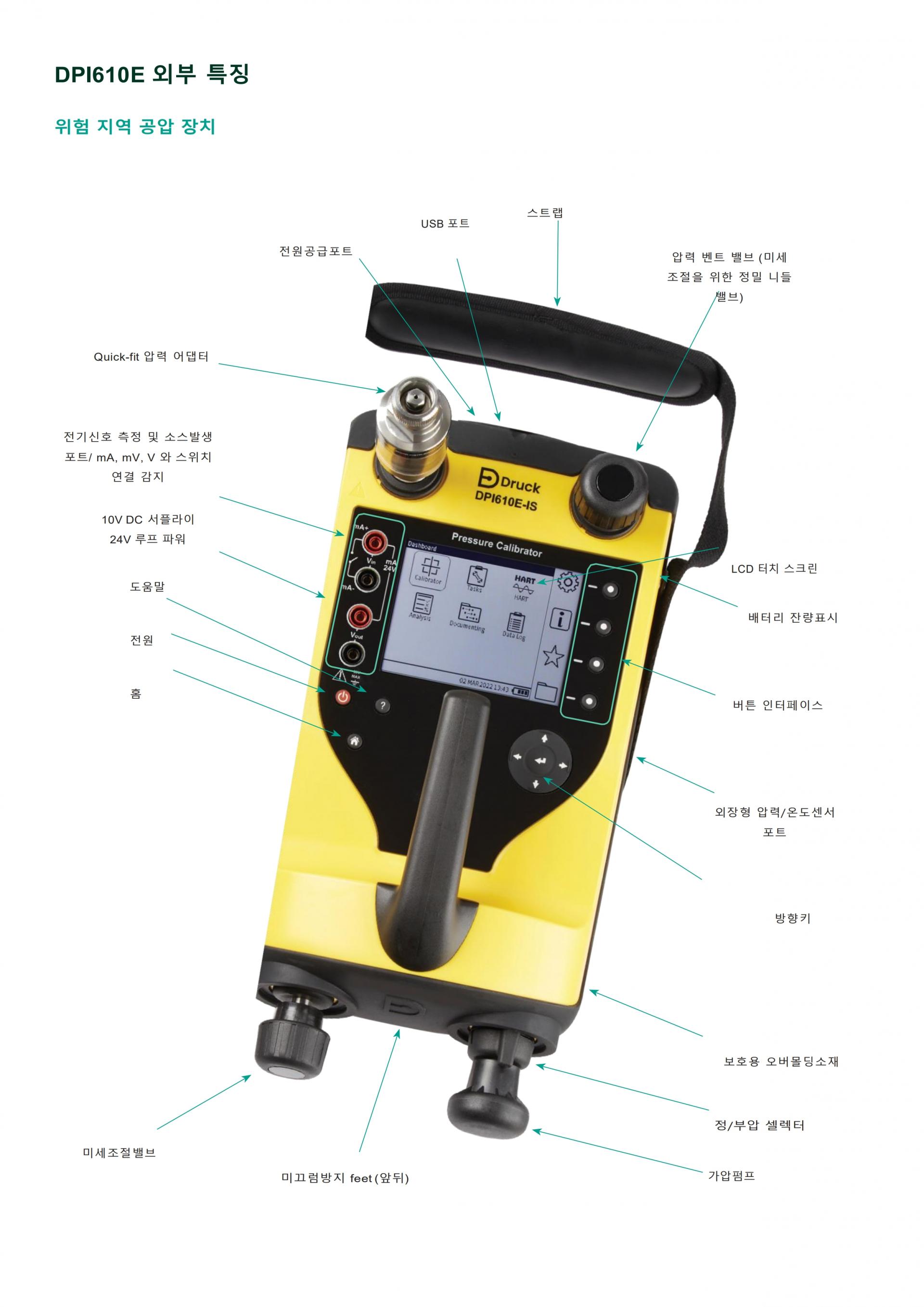 DPI610E는 이전 모델의 상징적인 핸들, 사용 편의성, 견고하고 신뢰할 수 있는 디자인을 그대로 유지하면서, 내부 기압계를 포함한 흥미롭고 새로운 기능과 교정용 기압계 포트를 제공합니다. 이 외에도 DPI610E는 향상된 배터리를 탑재하여 한 번 충전으로 2시간 동안 사용할 수 있으며, 60시간 이상 연속 사용이 가능합니다.