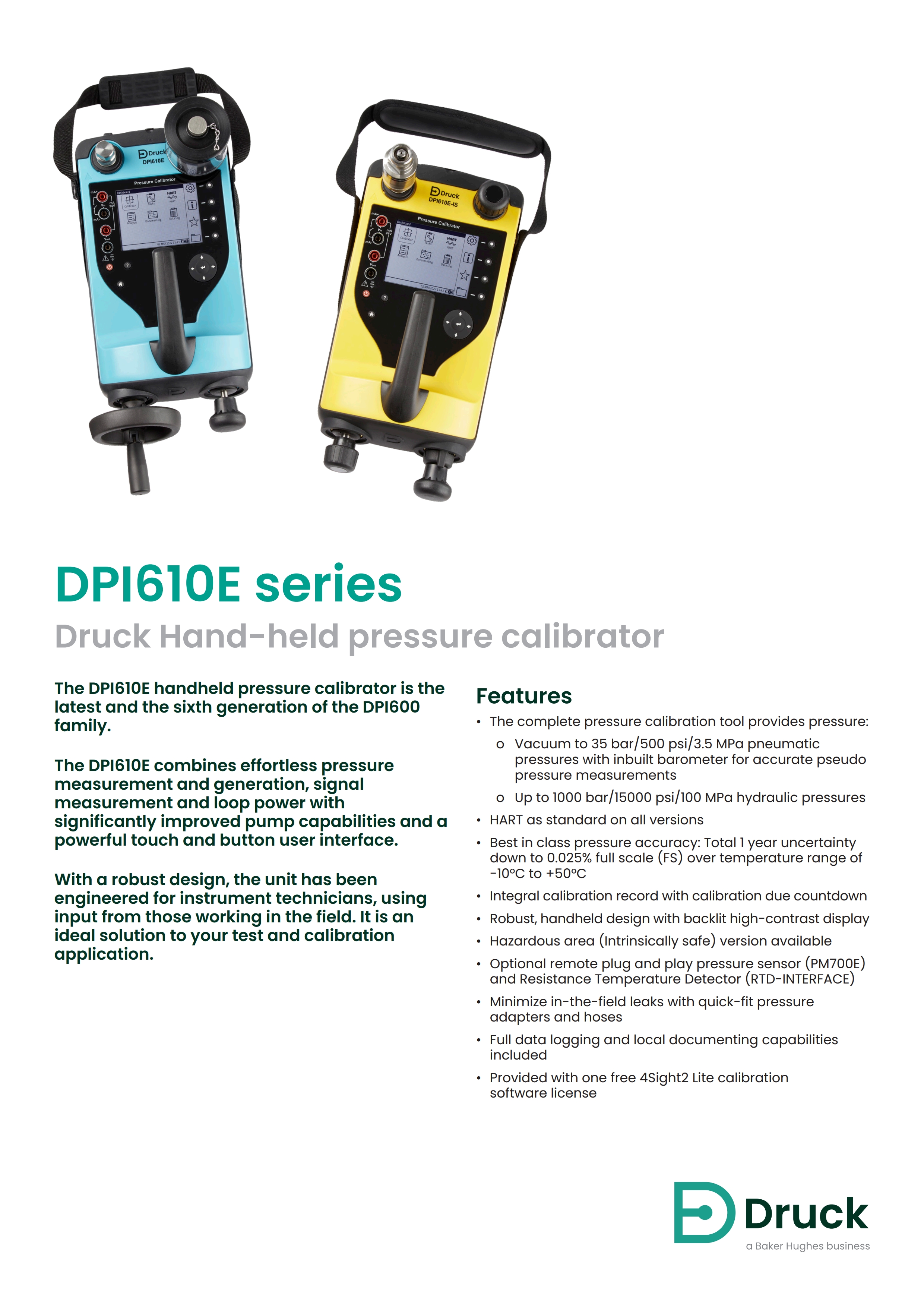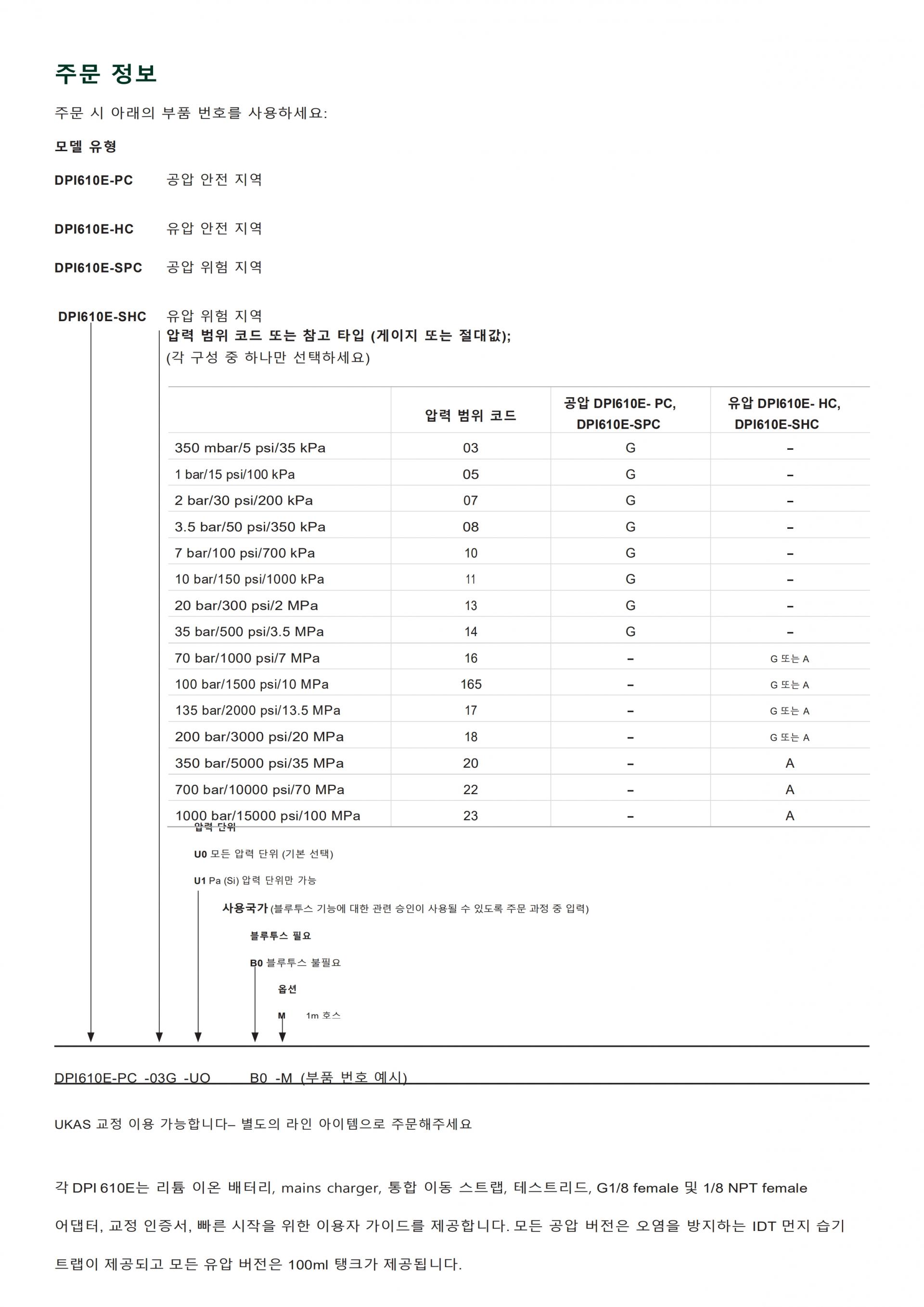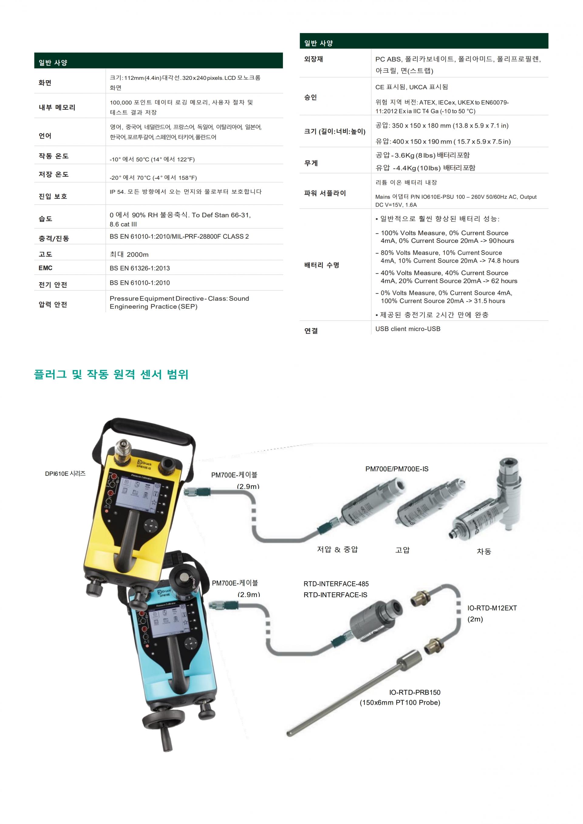 DPI610E는 이전 모델의 상징적인 핸들, 사용 편의성, 견고하고 신뢰할 수 있는 디자인을 그대로 유지하면서, 내부 기압계를 포함한 흥미롭고 새로운 기능과 교정용 기압계 포트를 제공합니다. 이 외에도 DPI610E는 향상된 배터리를 탑재하여 한 번 충전으로 2시간 동안 사용할 수 있으며, 60시간 이상 연속 사용이 가능합니다.