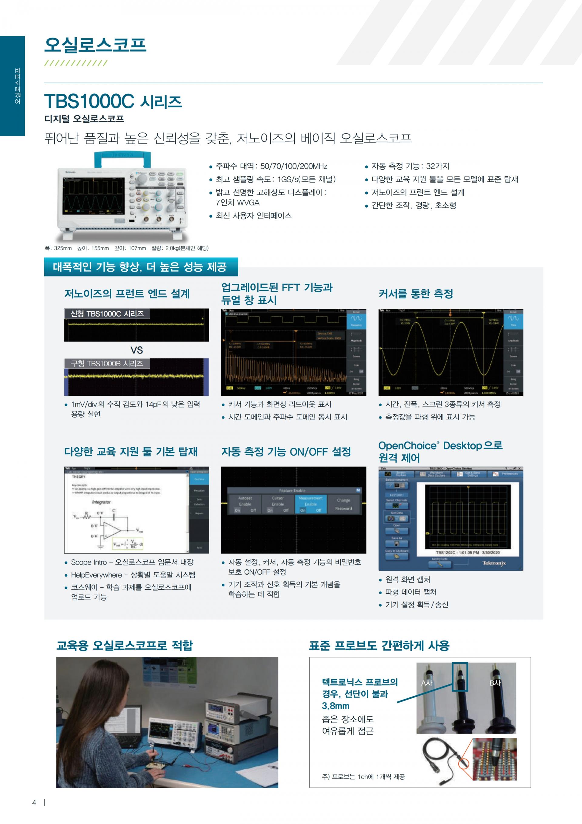 소형 디자인에 경제적인 성능을 제공하는 TBS1000C 디지털 스토리지 오실로스코프는 오늘날의 교육 기관, 임베디드 설계자 및 제조업체 커뮤니티에서 요구하는 기능, 다기능성 및 내구성을 제공합니다. TBS1000C는 최대 1GS/s의 샘플링 속도, 50MHz~200MHz의 대역폭 및 5년 보증을 제공하며 7인치 WVGA 컬러 디스플레이가 포함됩니다. 그리고 혁신적인 코스웨어 시스템으로 실험실 실습과 학생들을 위한 단계별 지침을 통합합니다. HelpEverywhere® 시스템은 사용자 인터페이스 전반에 걸쳐 유용한 팁과 힌트를 제공하여 새로운 사용자도 장비에 더 쉽게 접근할 수 있습니다.