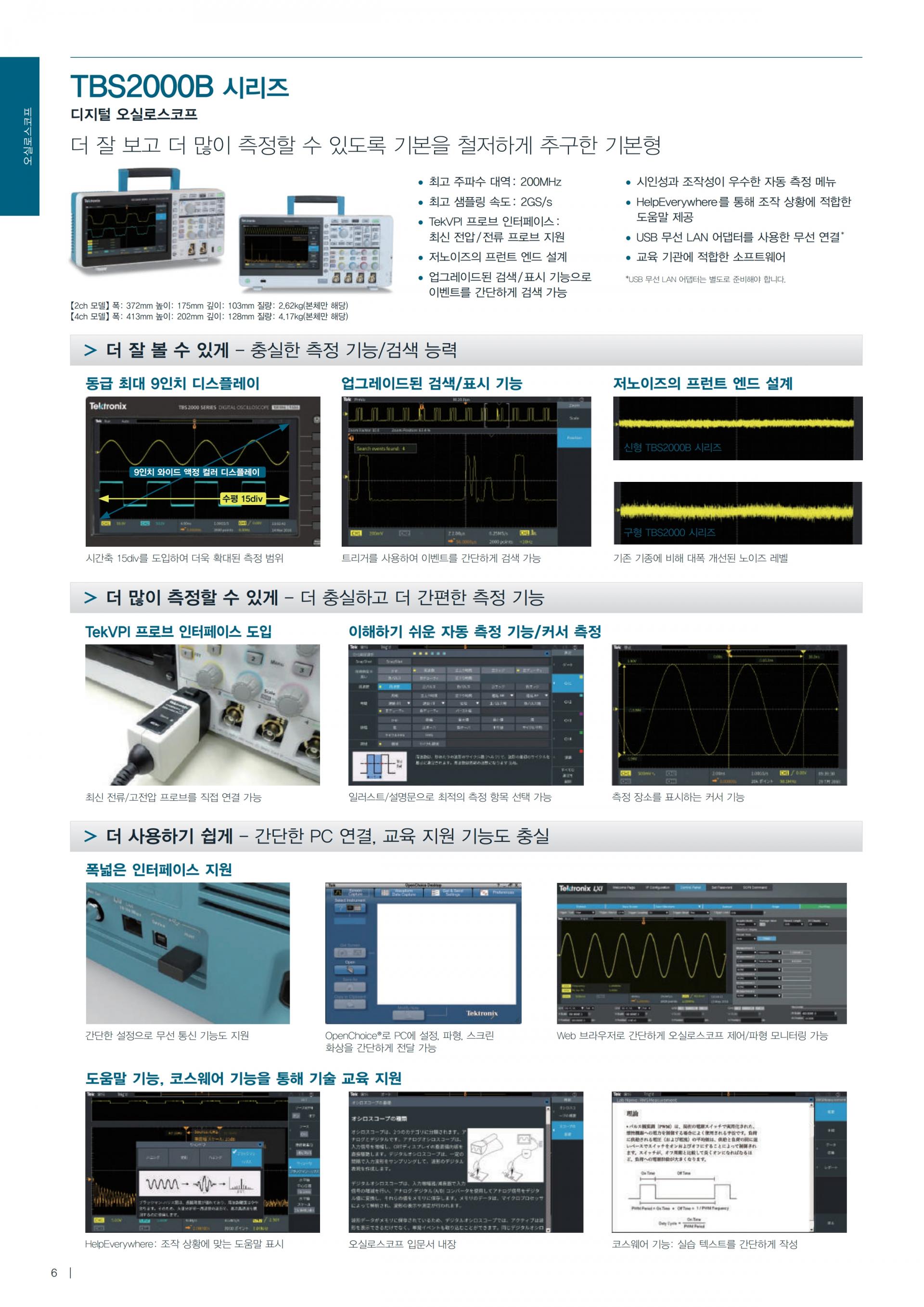 새로운 TBS2000B 디지털 스토리지 오실로스코프는 오실로스코프의 가장 중요한 기능인 신호 관찰 및 측정 작업을 보다 탁월하게 수행합니다. 더 커진 9인치 디스플레이와 15개의 수평 구간으로 화면별로 보다 오랜 시간을 할애할 수 있고 5M의 레코드 길이로 장시간 캡처할 수 있어 더 많은 내용을 확인할 수 있습니다. 또한 편리한 커서와 강력한 32개의 자동 측정으로 더 많은 것을 측정할 수 있으며, Wi-fi 연결 기능과 100-BaseT 이더넷 포트를 통해 더 많은 내용을 공유할 수 있습니다. 이 경제적인 스코프 제품은 내게 꼭 필요한 성능을 제공합니다.