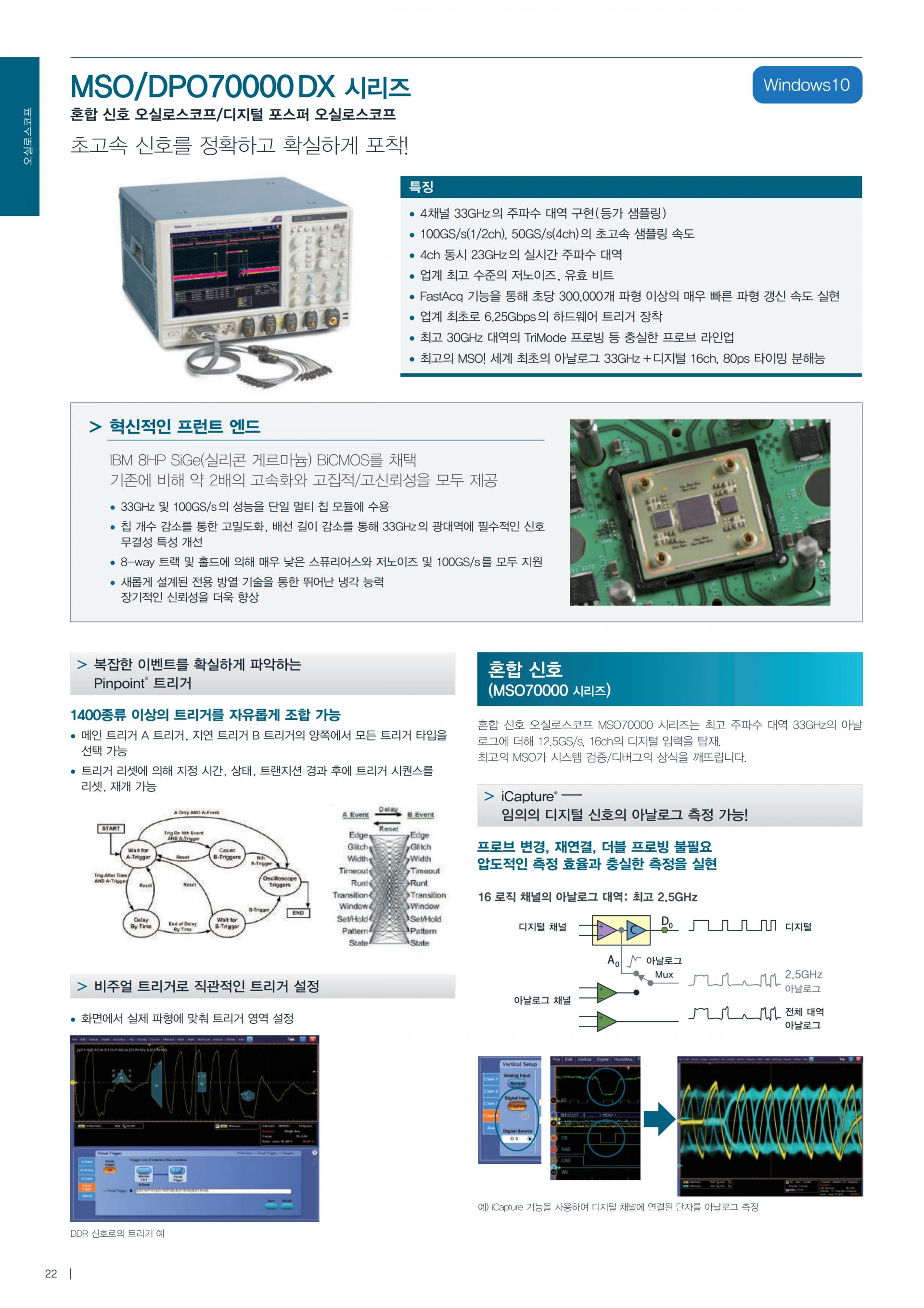 MSO/DPO70000은 동급 제품 중 가장 최첨단의 오실로스코프입니다. 이를 통해 오늘날의 엔지니어는 노이즈가 최소화된 상태로 신호를 더욱 잘 확인하고, 신호 이상 현상을 보다 빠르게 디버그하며, 자동 컴플라이언스 테스트 및 기타 검증용 측정/분석 도구를 활용할 수 있습니다. 또한 MSO/DPO70000은 아날로그/디지털 설계 및 디버그, 데이터 통신, 고속 시리얼 통신용으로 완벽한 제품입니다.