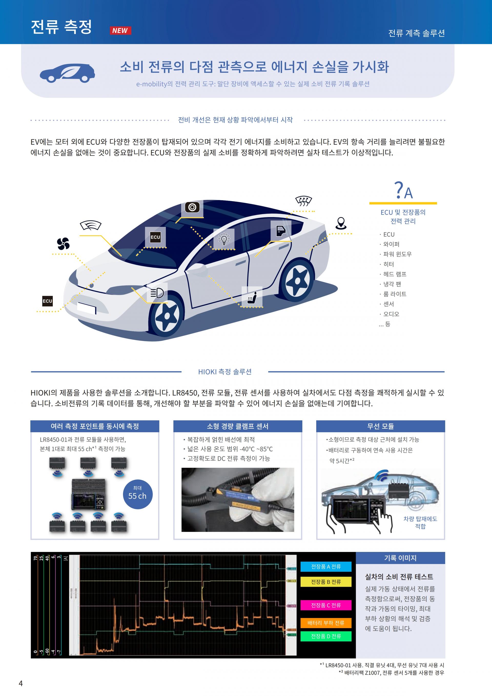 EV의 전력 관리에 기여하는 암전류 계측EV의 항속거리 향상을 실현하기 위해서는 ECU나 전장기기 등 디바이스의 소비전력이나 암전류를 파악하는 것이 중요합니다. EV 완성 차량의 각종 디바이스의 소비 전류나 암전류를 계측해, 차량 전체의 전력 관리에 공헌합니다. | ![]() |