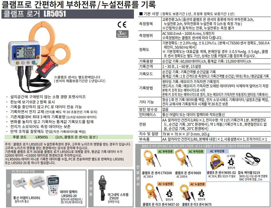 이전 모델인 클램프 로거 3636을 클램프 로거 LR5051로 교체할 경우, 평균 기록 데이터 수가 32000 데이터 → 15000 데이터로 변경되니 주의하시기 바랍니다.