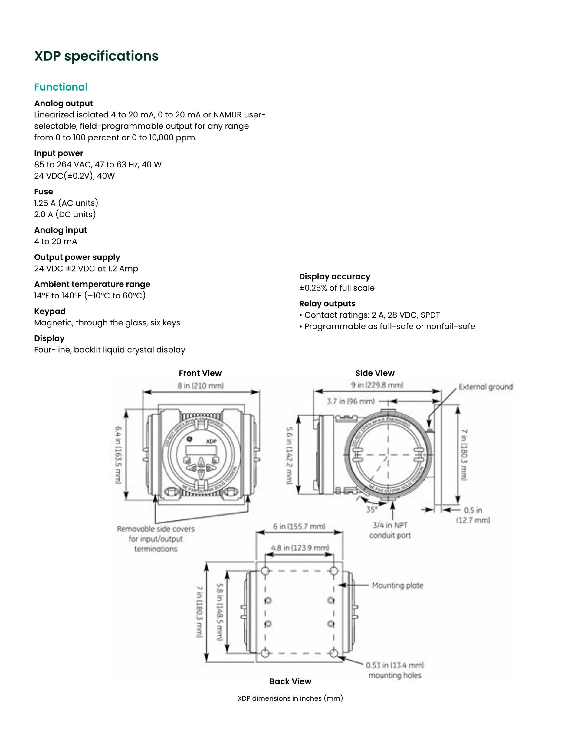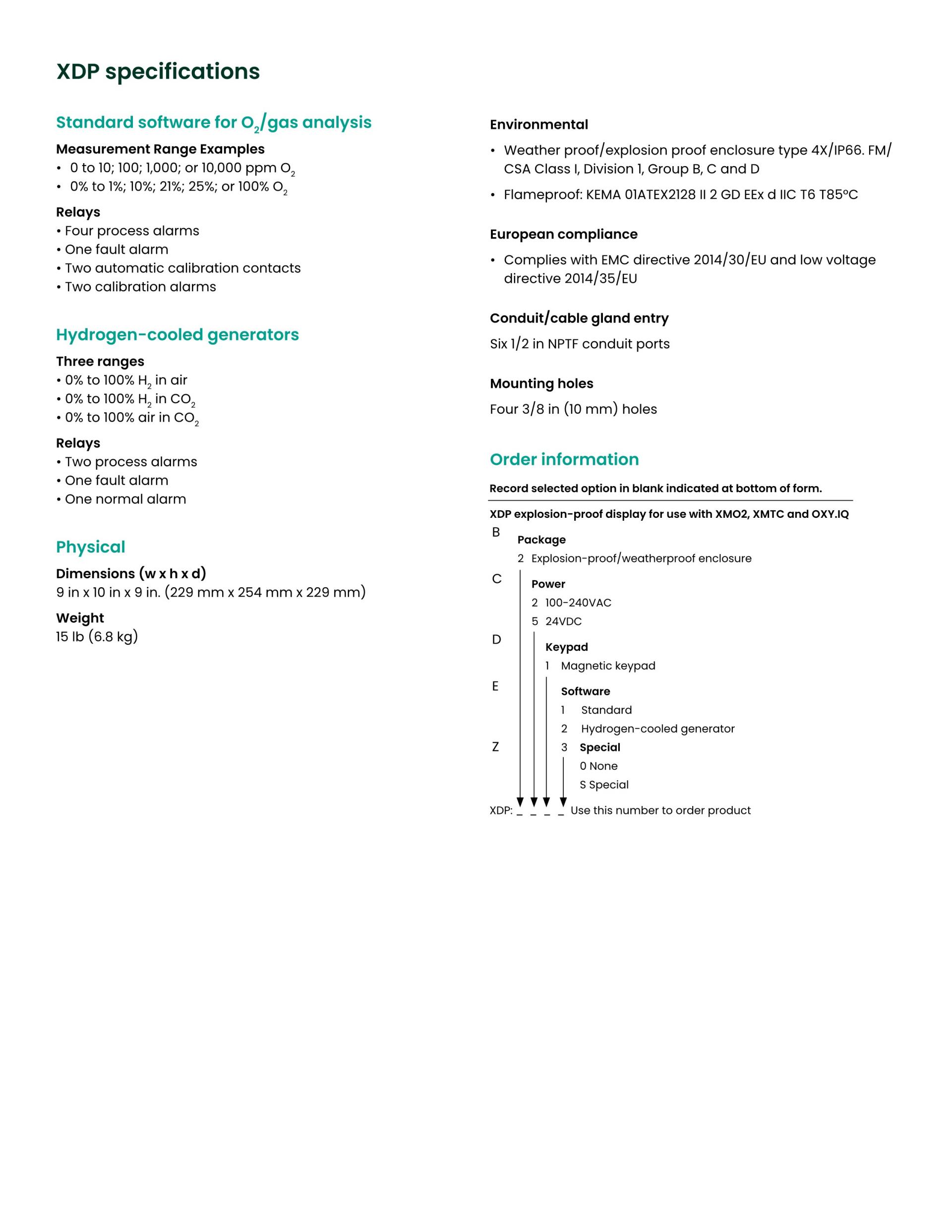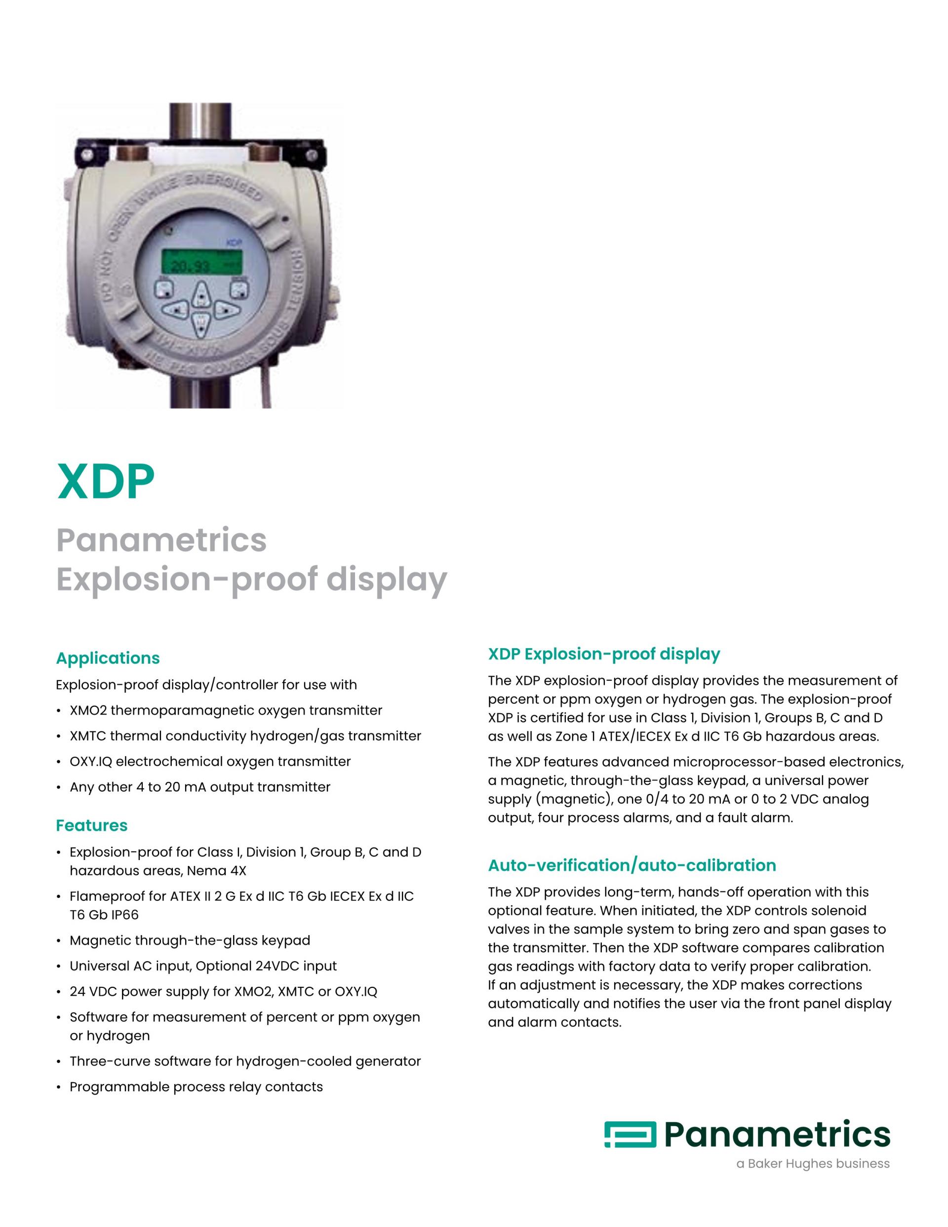 The Panametrics XDP explosion-proof display provides the measurement of percent or ppm oxygen or hydrogen gas. The explosion-proof XDP is certified for use in Class I, Division 1, Groups B, & D, and II 2 GD Exd IIC T6 hazardous areas. Features include: