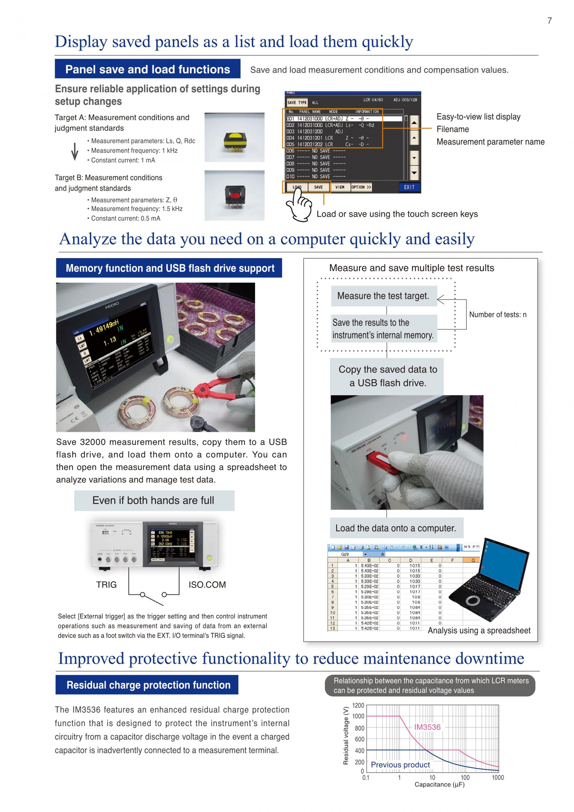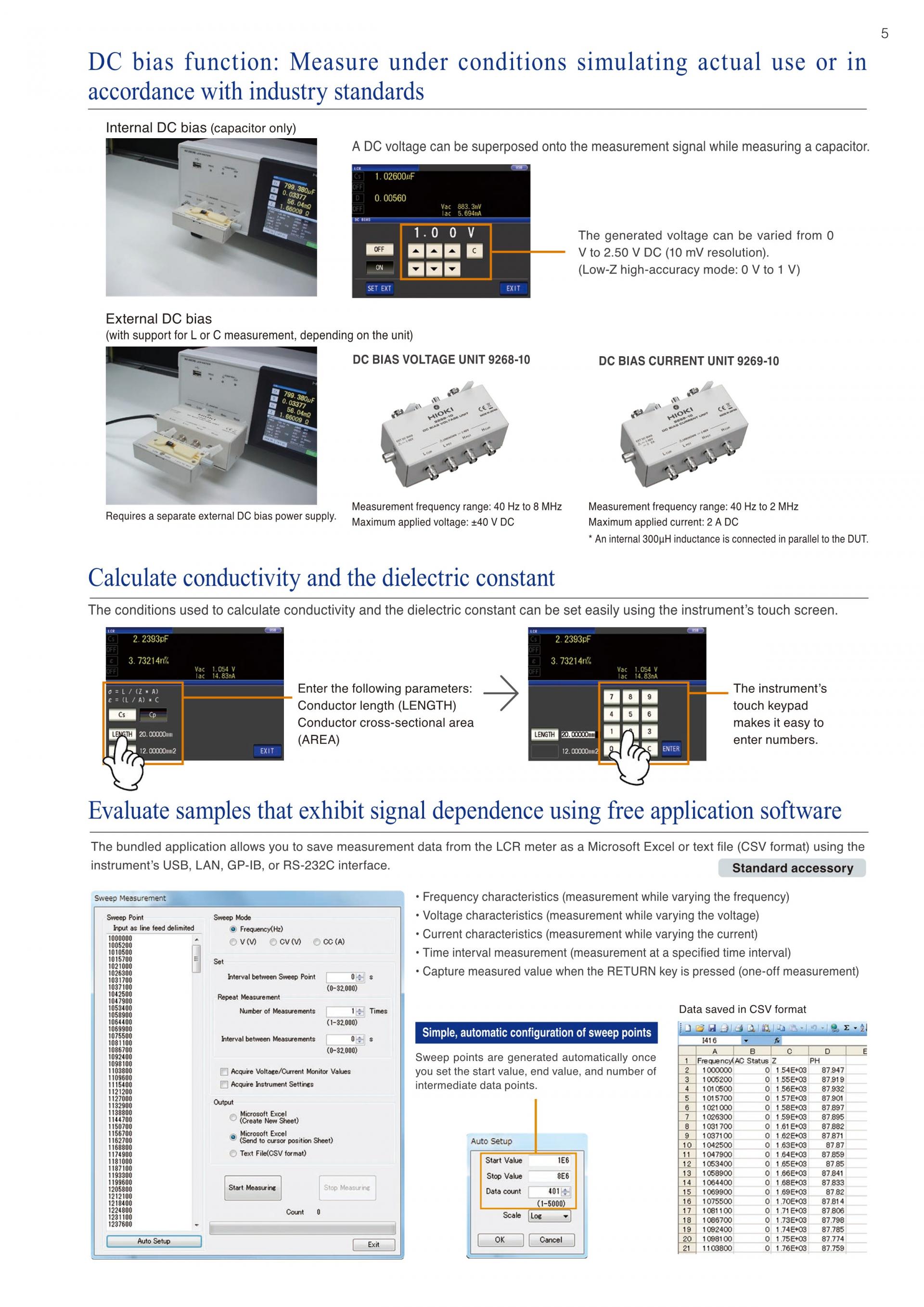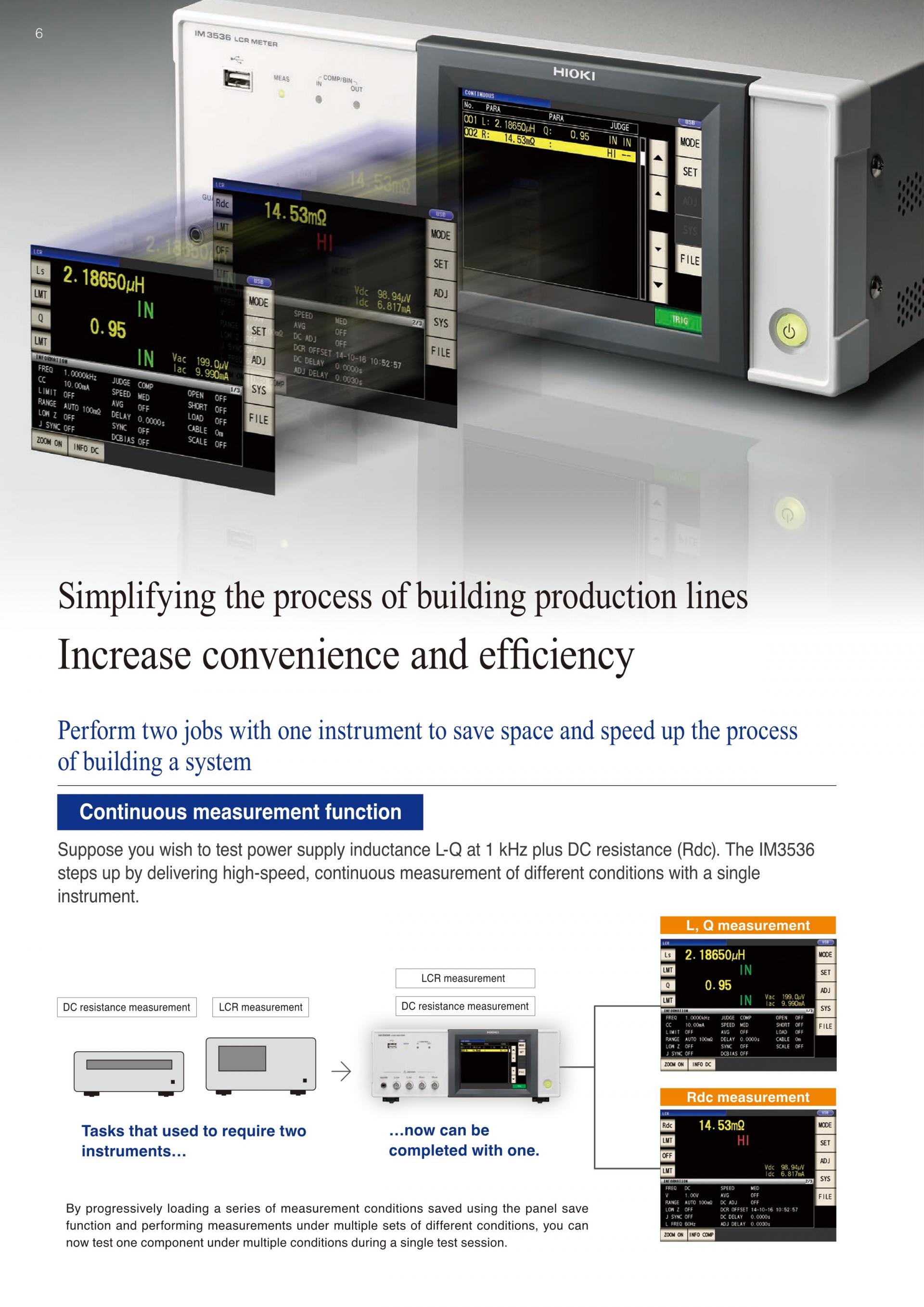 인덕터의 주파수 특성 측정 : LCR 미터 IM3536LCR 미터 IM3536은 측정 주파수를 DC, 4 Hz ~ 8 MHz로 광범위하게 설정할 수 있어 주파수를 바꾸어 측정하는 평가에 최적화되어 있습니다. 함께 제공되는 LCR 샘플 응용 프로그램(CD-R)을 PC에 설치, 인터페이스를 통해(USB, GP-IB, RS-232C) 지정 점수의 주파수를 가변, 자동 측정하여 그 측정 데이터를 Microsoft Excel 및 텍스트 파일로 저장할 수 있습니다. |