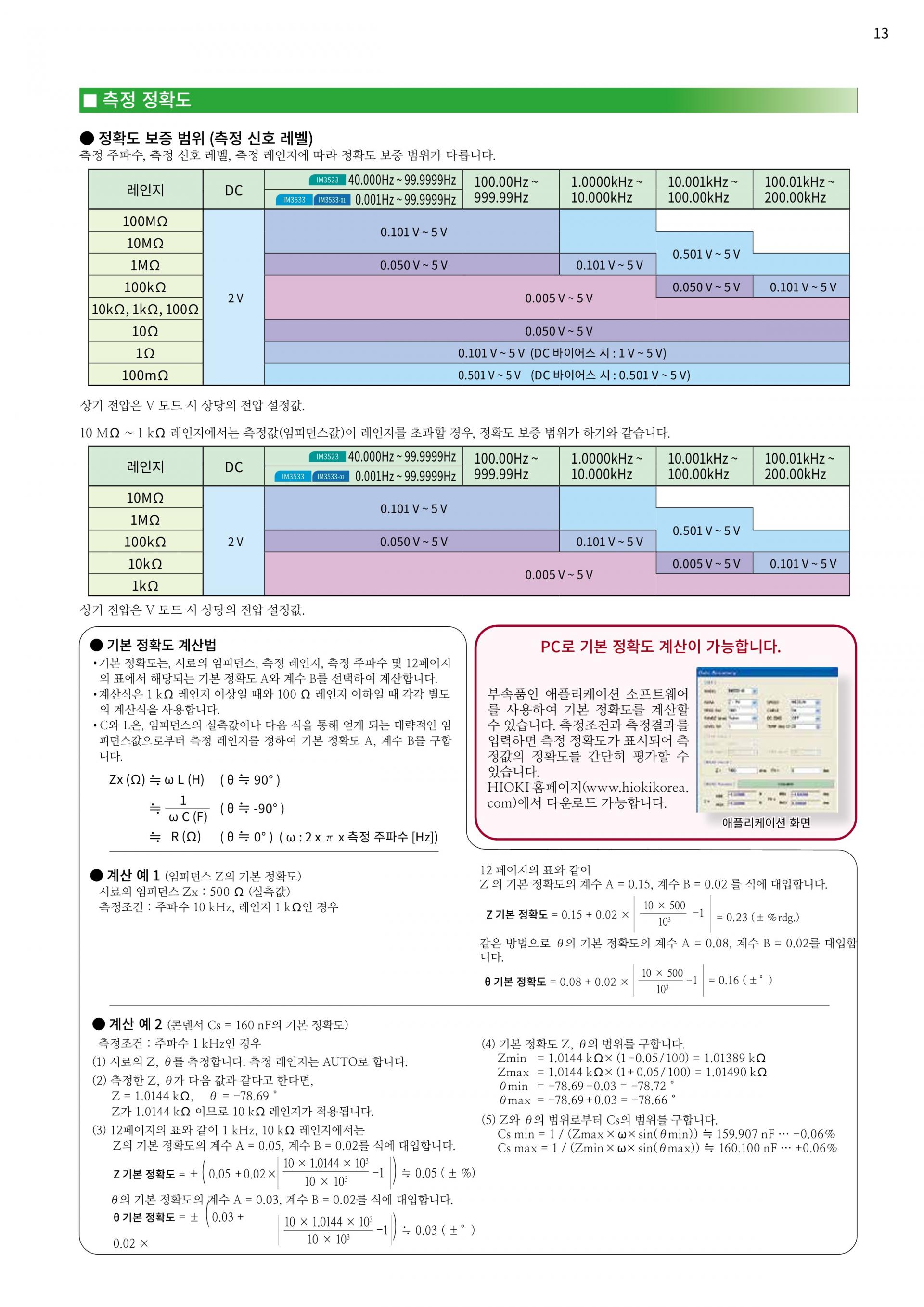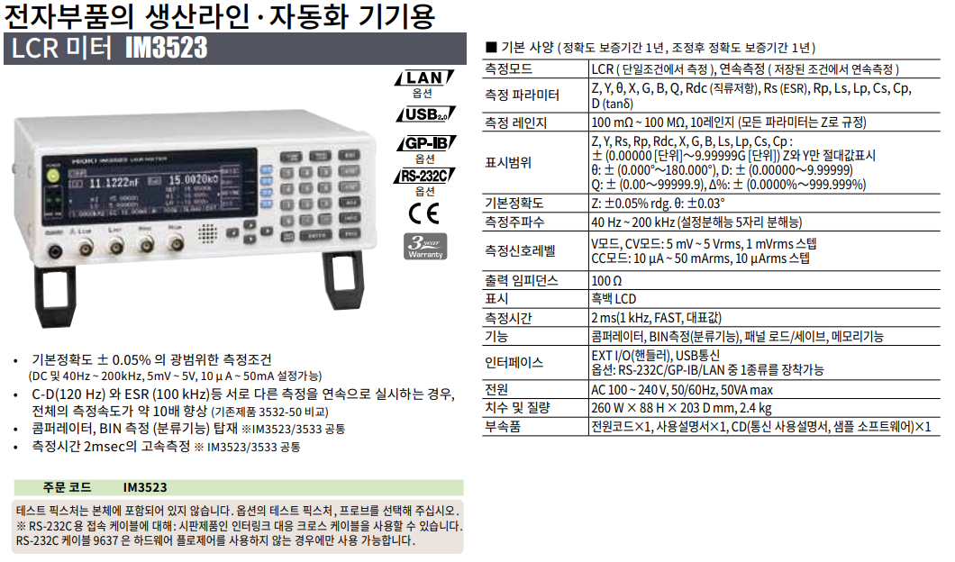 - 기본 정확도 ± 0.05%와 광범위한 측정 조건(DC 및 40Hz~200kHz, 5mV~5V, 10μA~50mA 설정 가능)