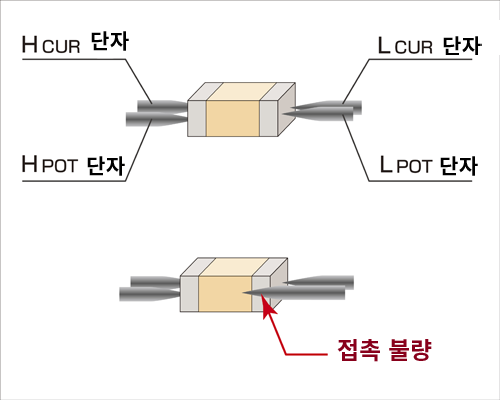 생란 라인 검사에 신뢰성을 : 컨텍트 체크 기능4단자 측정 시에 시료 간 접촉 불량을 검출 LPOT〜LCUR 사이와 HPOT〜HCUR 사이의 접촉 저항을 측정하고 측정하고 싶은 임계값 이상인 경우에 에러를 표시합니다. | ![]() |