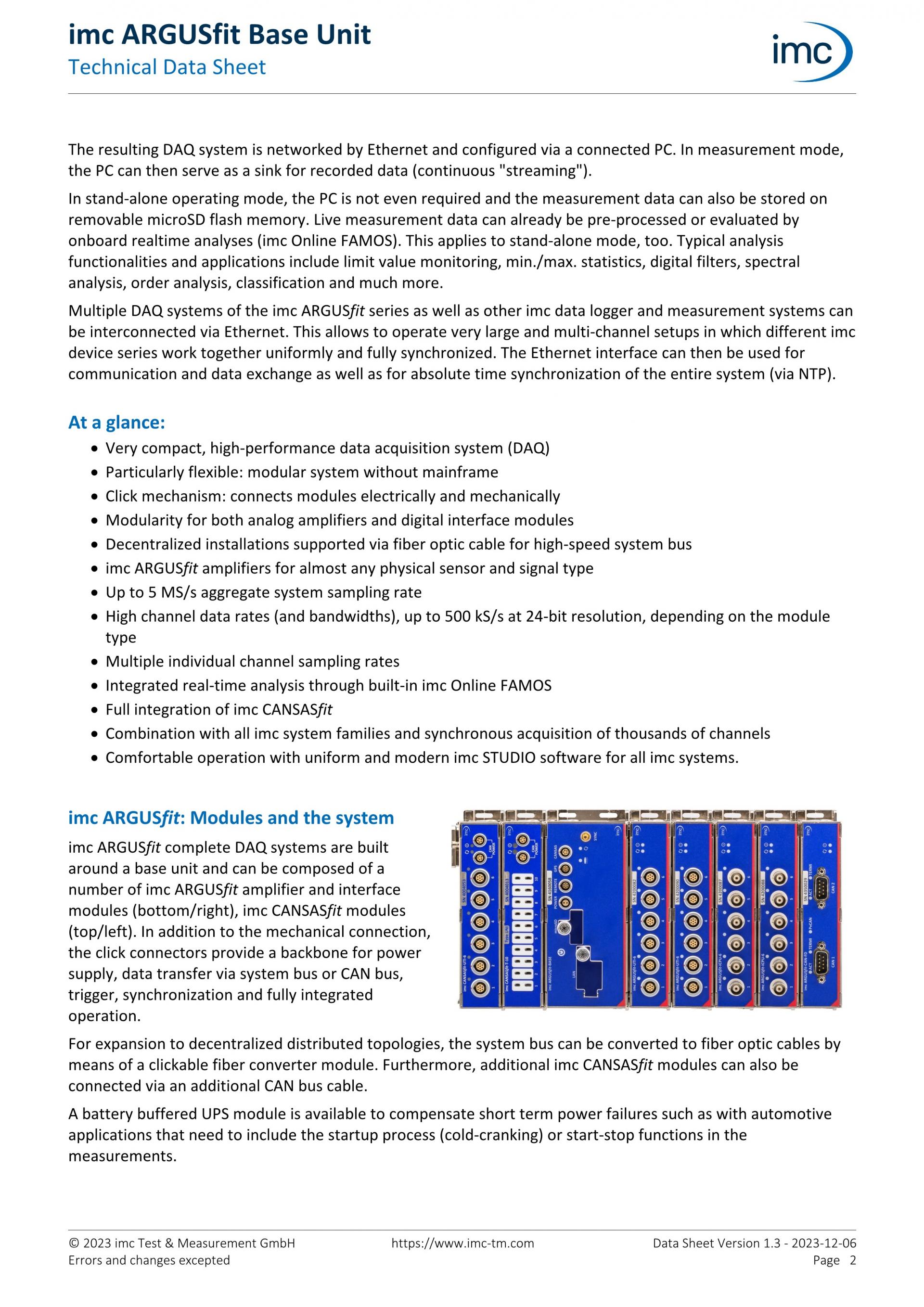 클릭 메커니즘으로 모듈을 쉽게 연결할 수 있는 강력하고 유연한 DAQ 시스템인 imc ARGUSfit에 대해 알아보세요. 강력한 성능, 컴팩트한 디자인, 분산 측정을 통해 프로토타입 테스트부터 실차 테스트, 기계 및 장비 모니터링에 이르기까지 다양한 분야에서 정밀한 계측이 가능합니다.