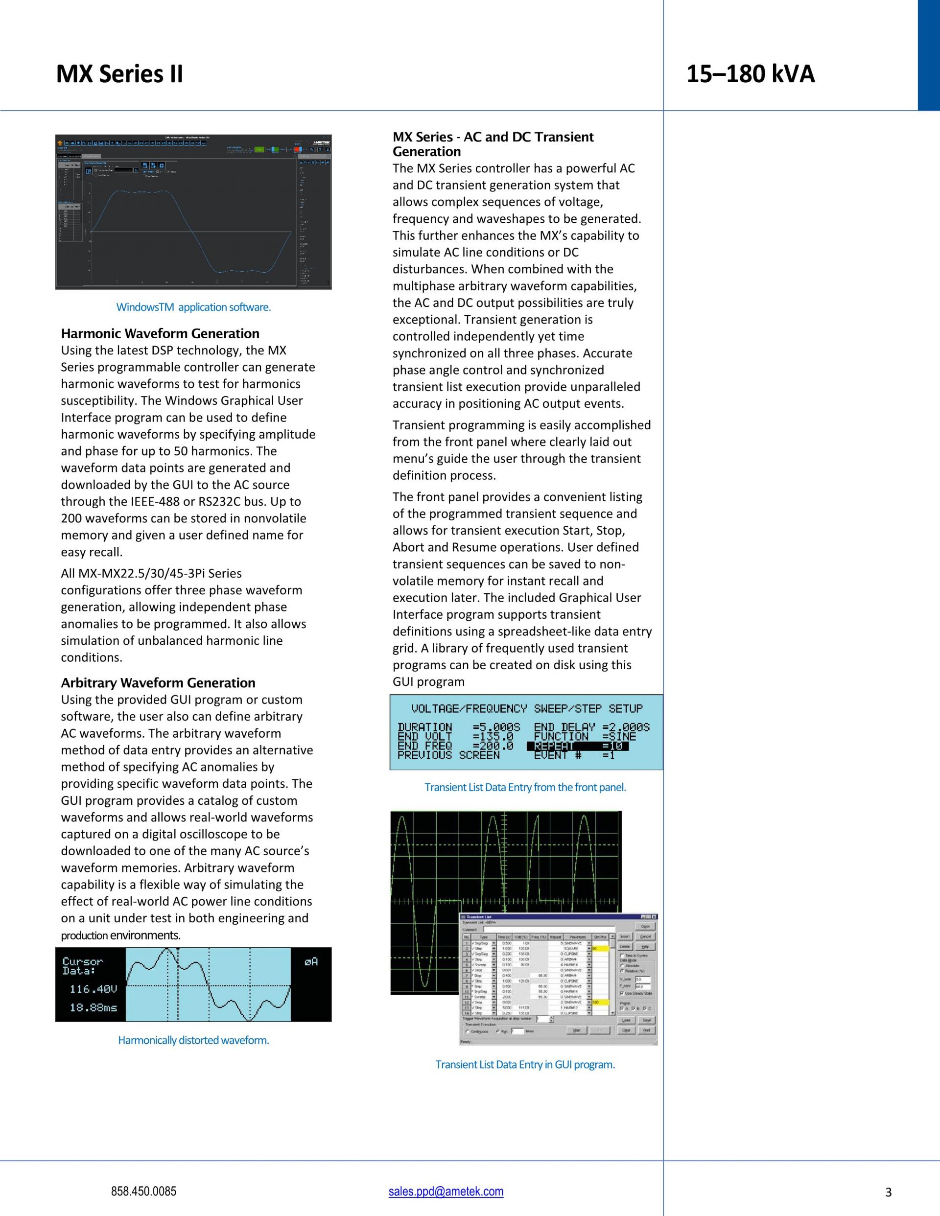 Increasingly, manufacturers of high power equipment and appliances are required to fully evaluate and test their products over a wide range of input line conditions. The built-in output transient generation and read-back measurement capability of the MX Series offers the convenience of a powerful, and easy to use, integrated test system.