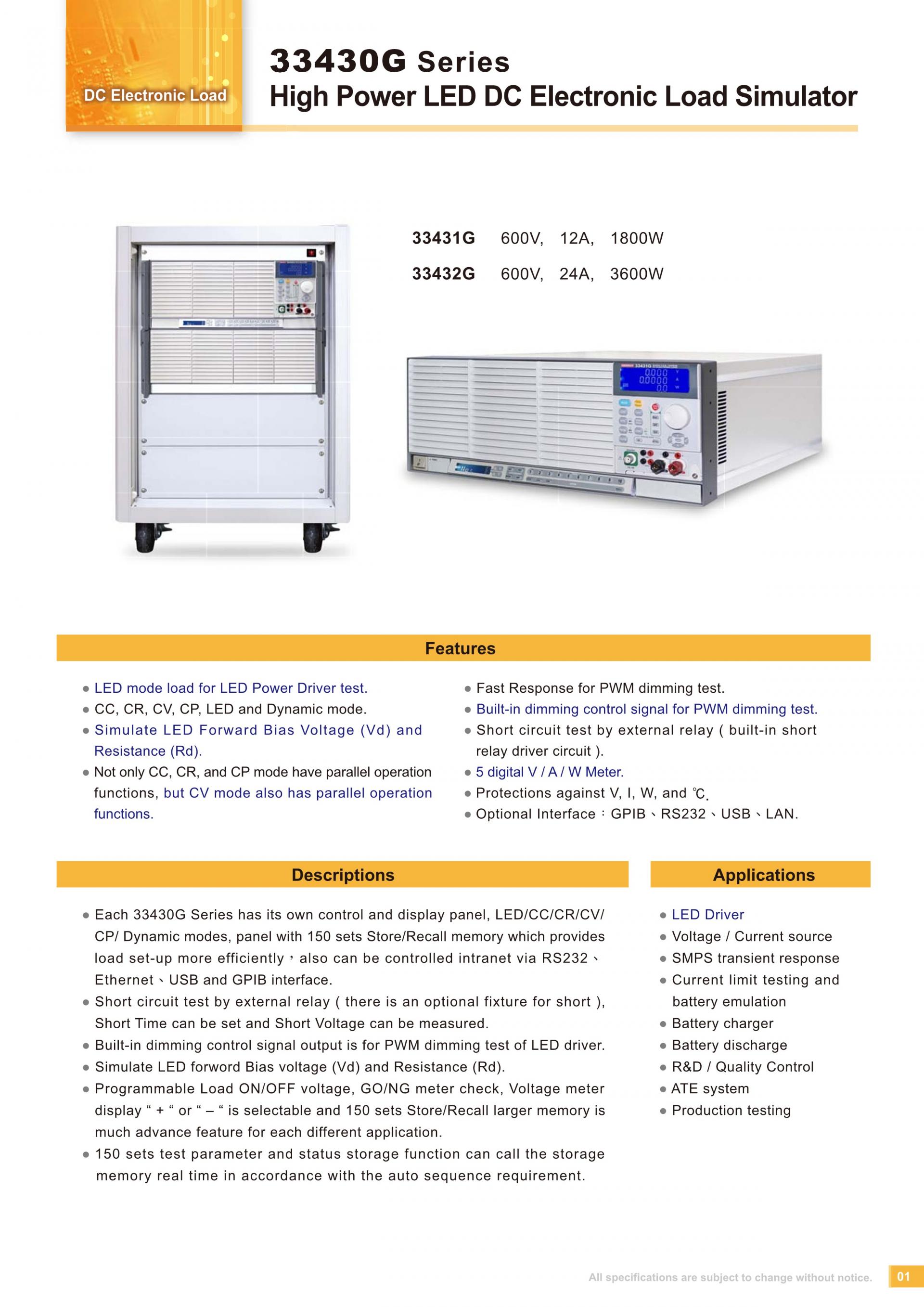 - Each 33430G Series has its own control and display panel, LED/CC/CR/CV/CP/ Dynamic modes, panel with 150 sets Store/Recall memory which provides load set-up more efficiently,also can be controlled intranet via RS232、Ethernet、USB and GPIB interface.