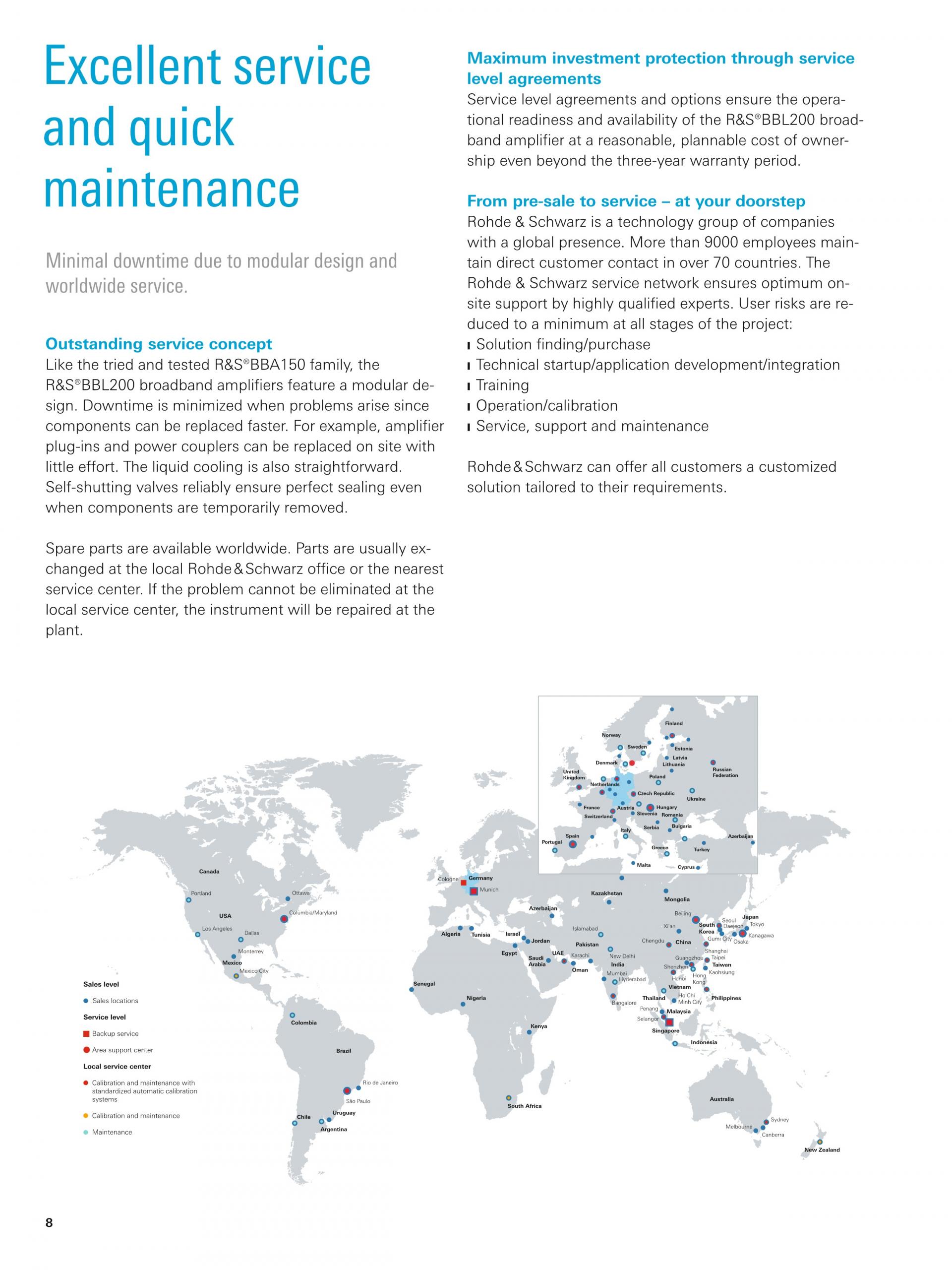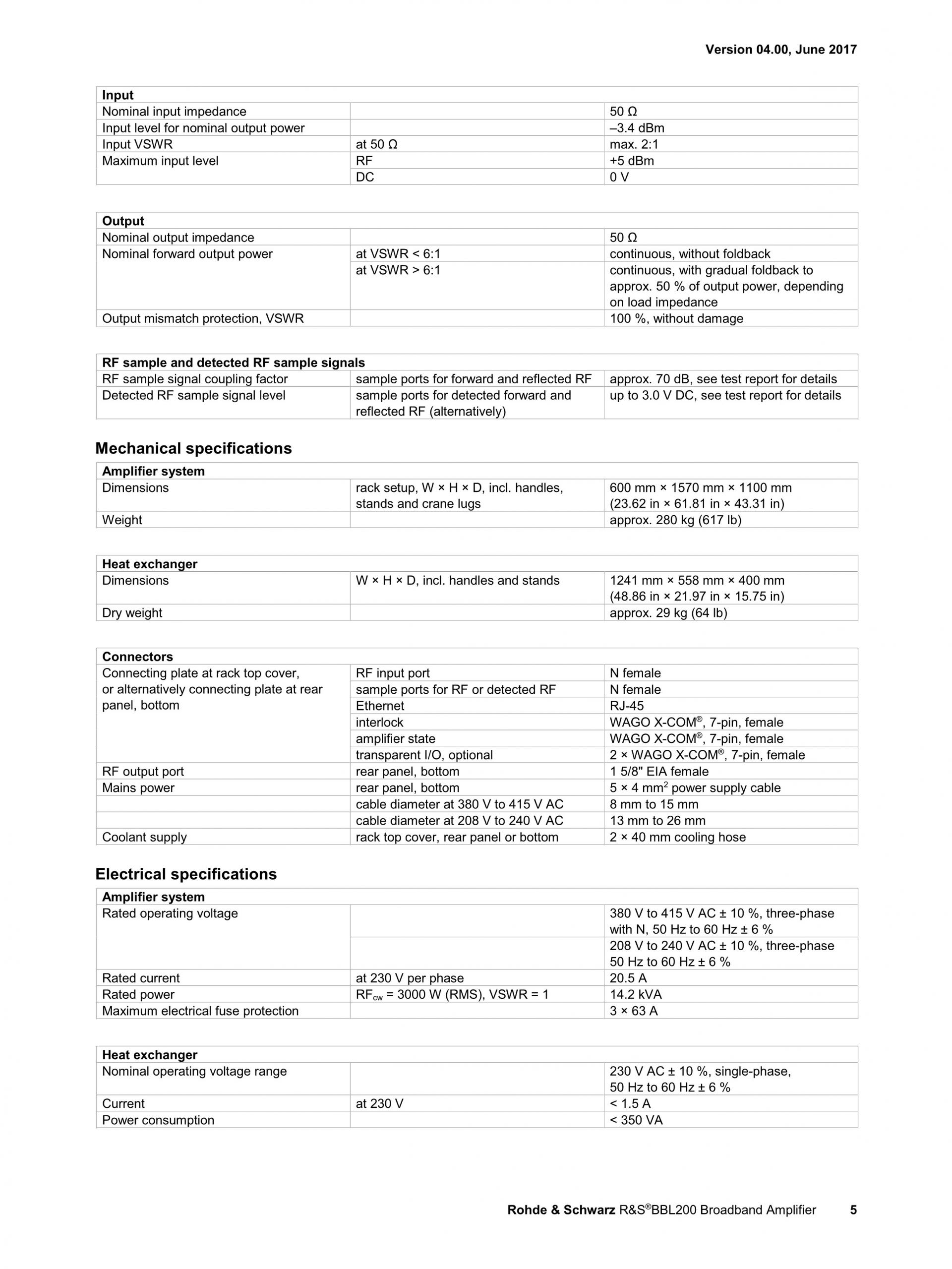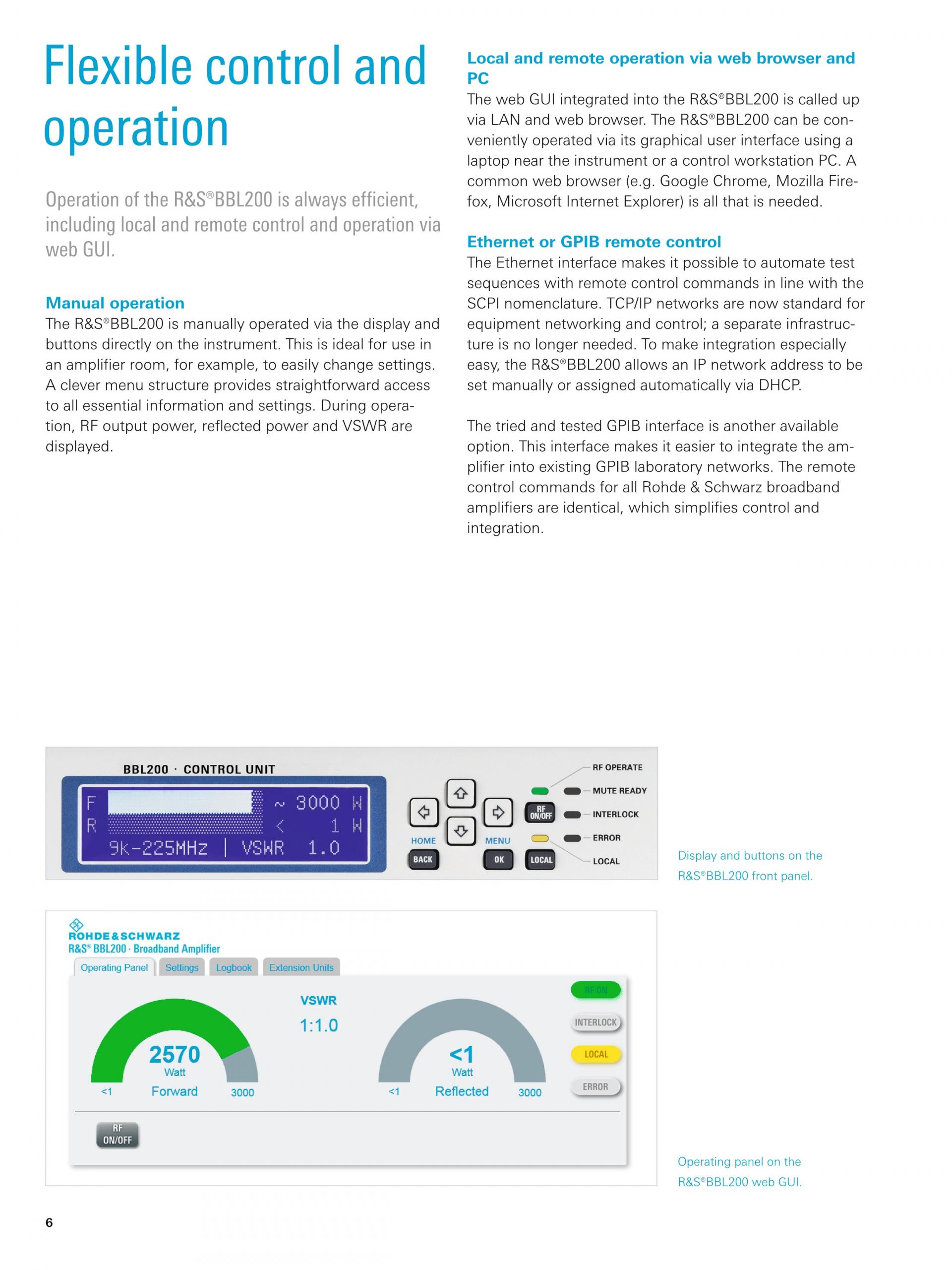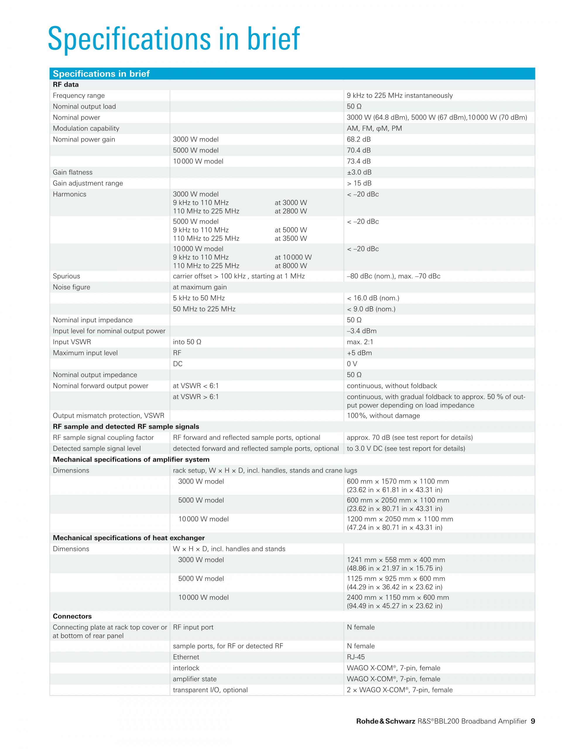 R&S®BBL200 Broadband Amplifier는 높은 RF 출력이 필요한 운용 환경에 적합합니다. R&S®BBL200 Broadband Amplifier는 리니어 클래스 A 증폭기이며 9 kHz ~ 250 MHz 주파수 대역에서 3 kW, 5 kW, 10 kW를 발생합니다. 이 기기는 수냉식, Solid State 방식으로 매우 견고하며 조용하고 효율적입니다. 모든 런타임 파라미터를 정밀 모니터링하여 최대한의 견고성과 신뢰성을 보장합니다. 이 증폭기는 연속 작동을 위해 설계되었으며 부정합 조건에서도 정전력을 제공합니다.