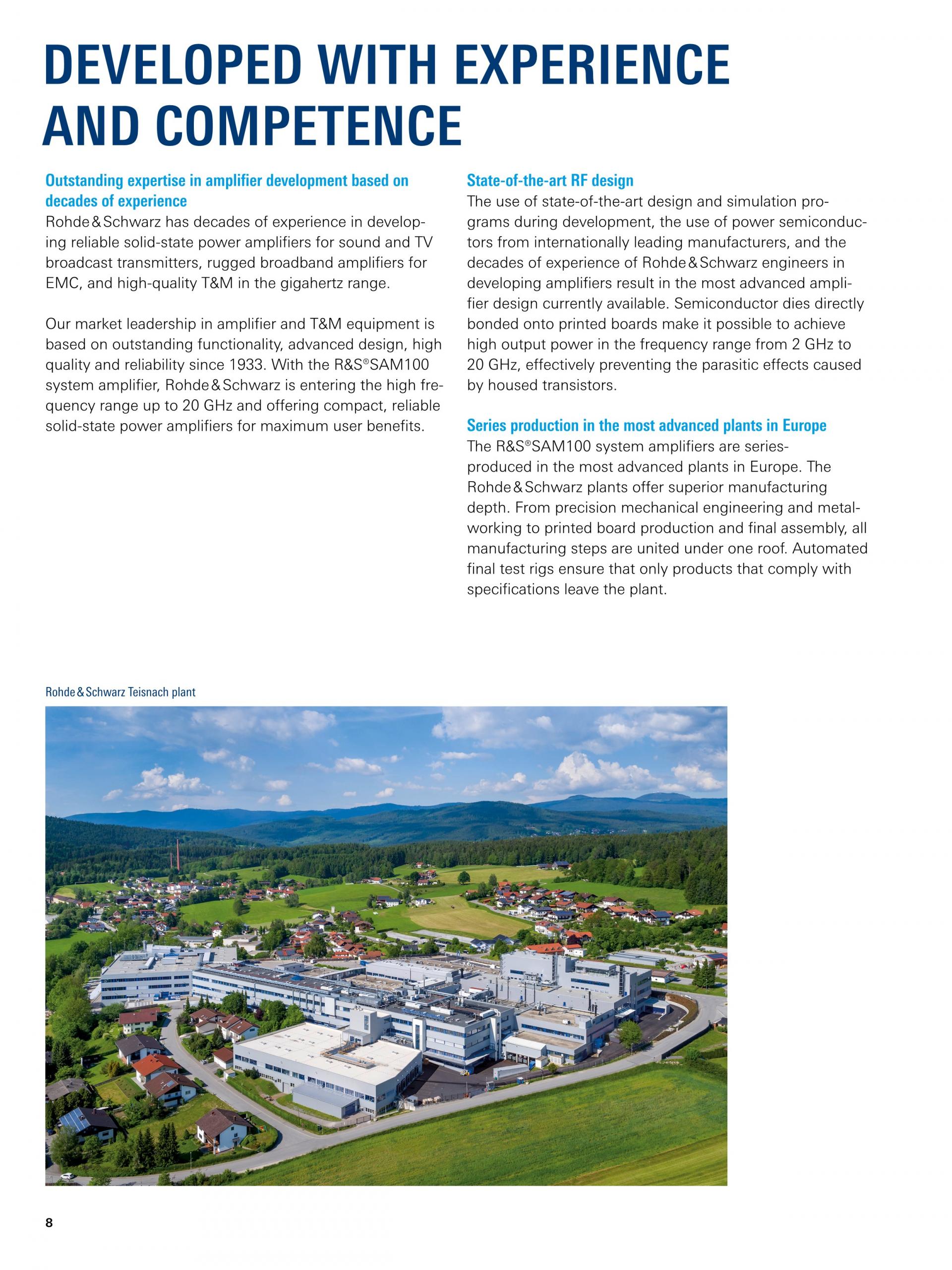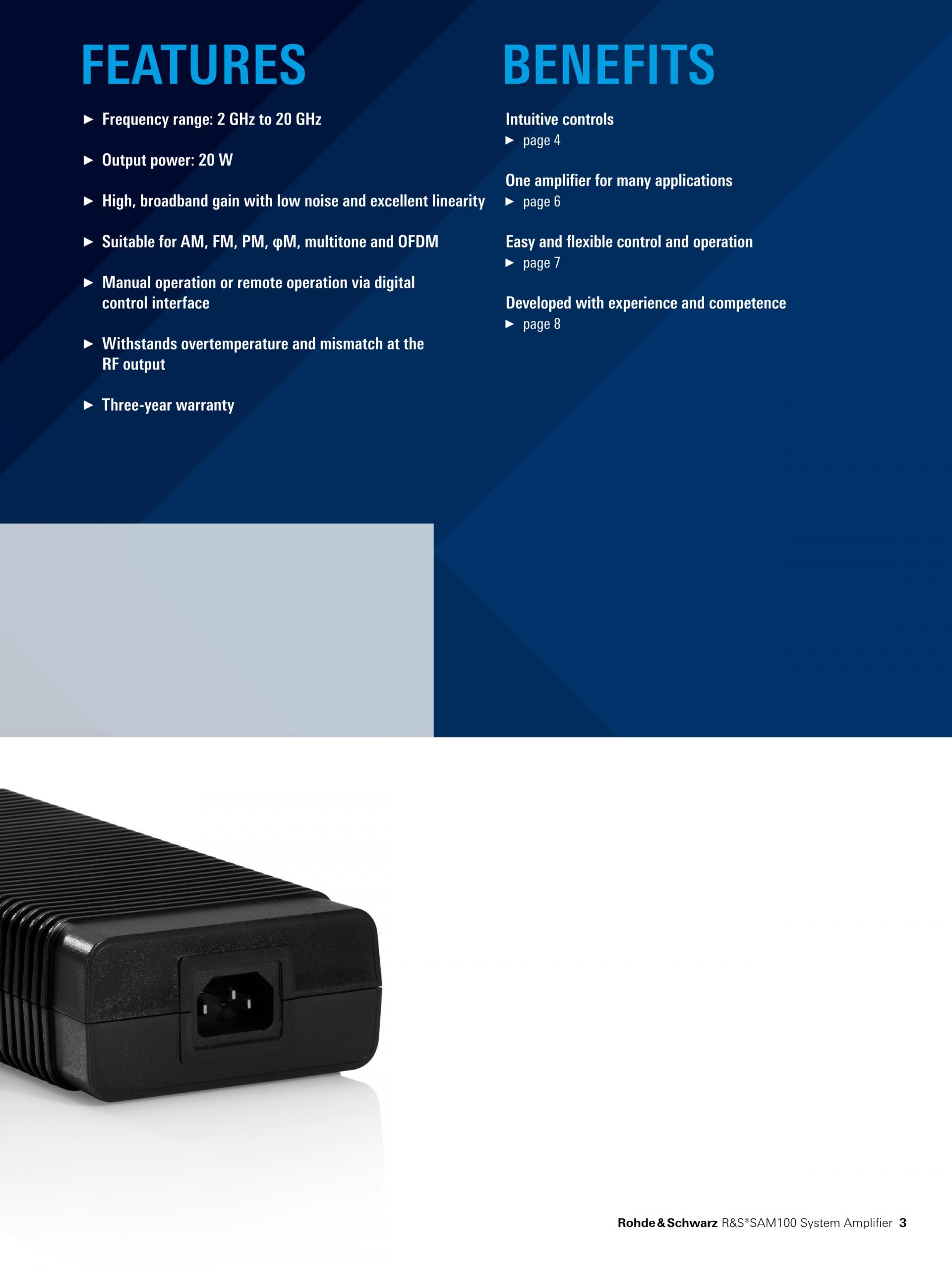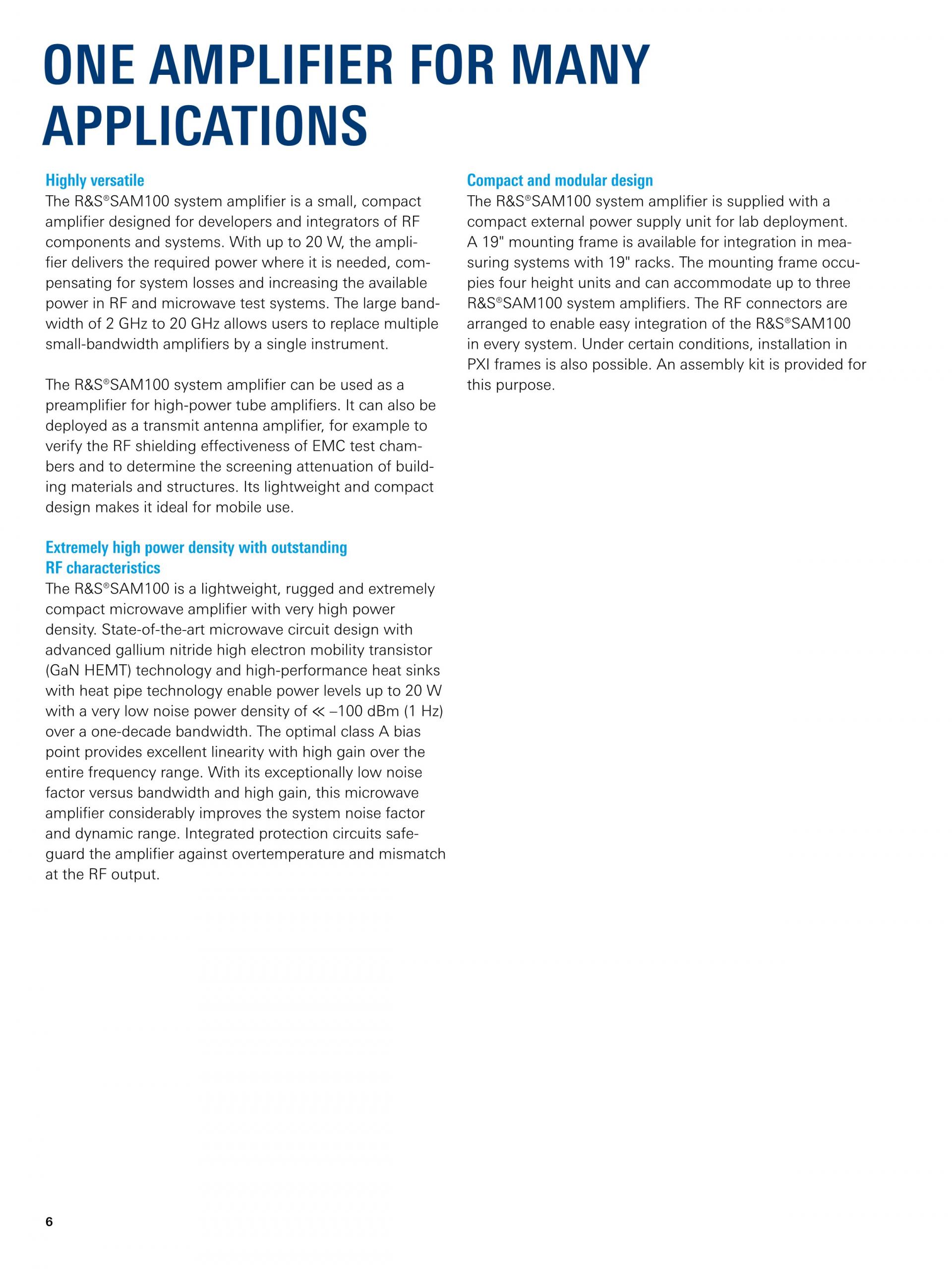 R&S®SAM100 System Amplifier는 2 GHz ~ 20 GHz 주파수 대역의 Ultra-broadband 솔리드 스테이트 Microwave 증폭기입니다. R&S®SAM100 Amplifier는 최대 20 W의 출력, 뛰어난 선형성과 노이즈 특성으로 다양한 측정 셋업(예: 설계(DVT), PVT(Product Validation Test) 또는 EMC)에서 초소형 시스템으로 적합합니다. R&S 발생기, 주파수 분석기 또는 네트워크 분석기로 구성된 측정 환경에서 드라이버 또는 부스터로 사용해 측정 신호를 증폭할 수 있습니다. R&S®SAM100도 튜브 증폭기뿐만 아니라 Narrow-band 단일 증폭기로 구성된 멀티 밴드 어셈블리의 대체 기기로도 적합합니다.