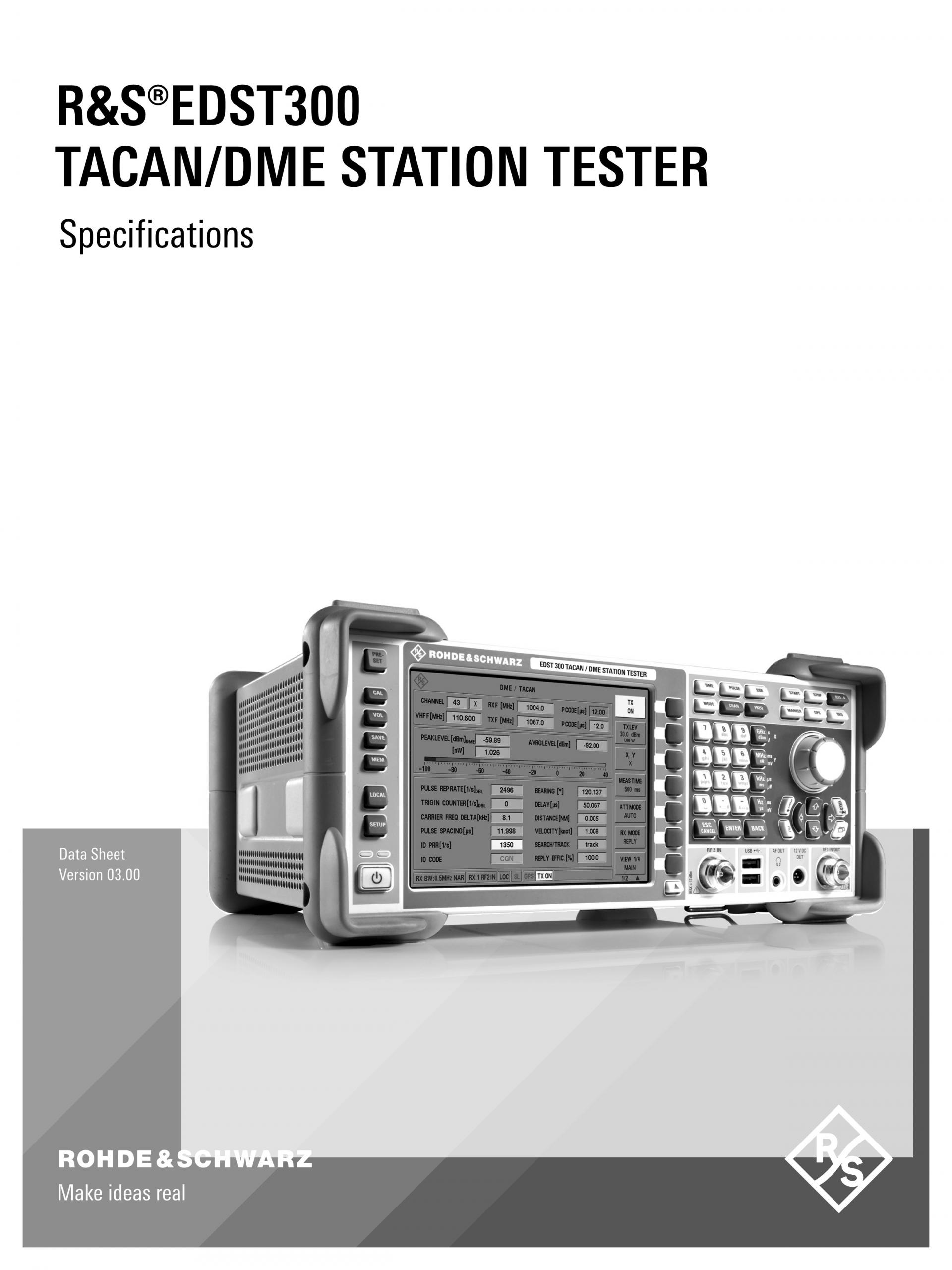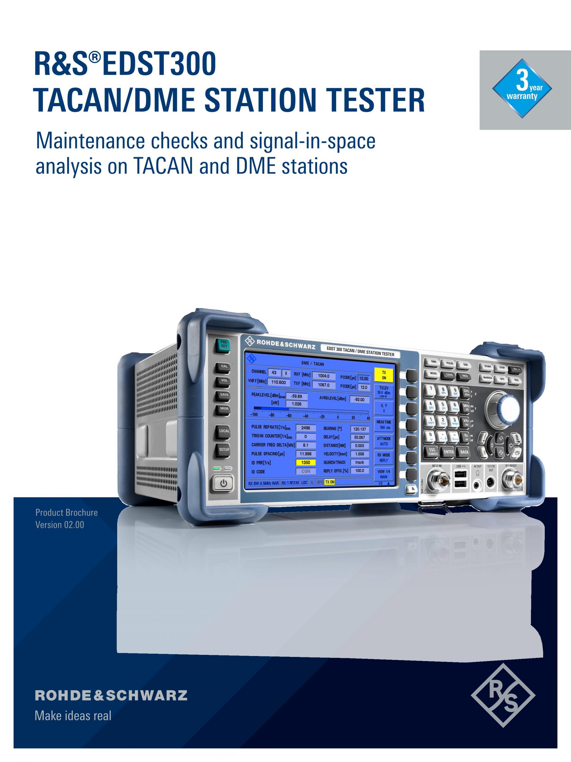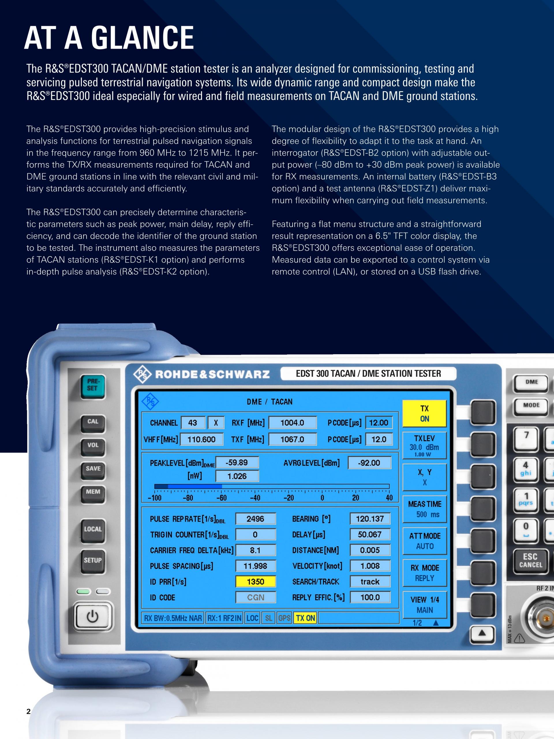 R&S®EDST300 TACAN/DME Station Tester는 펄스 지상 항법 시스템의 시운전, 테스트, 수리를 위해 설계된 분석기입니다. 넓은 다이내믹 레인지와 컴팩트한 디자인의 R&S®EDST300은 TACAN 및 DME 지상국에서 유선 및 현장 측정에 적합합니다.