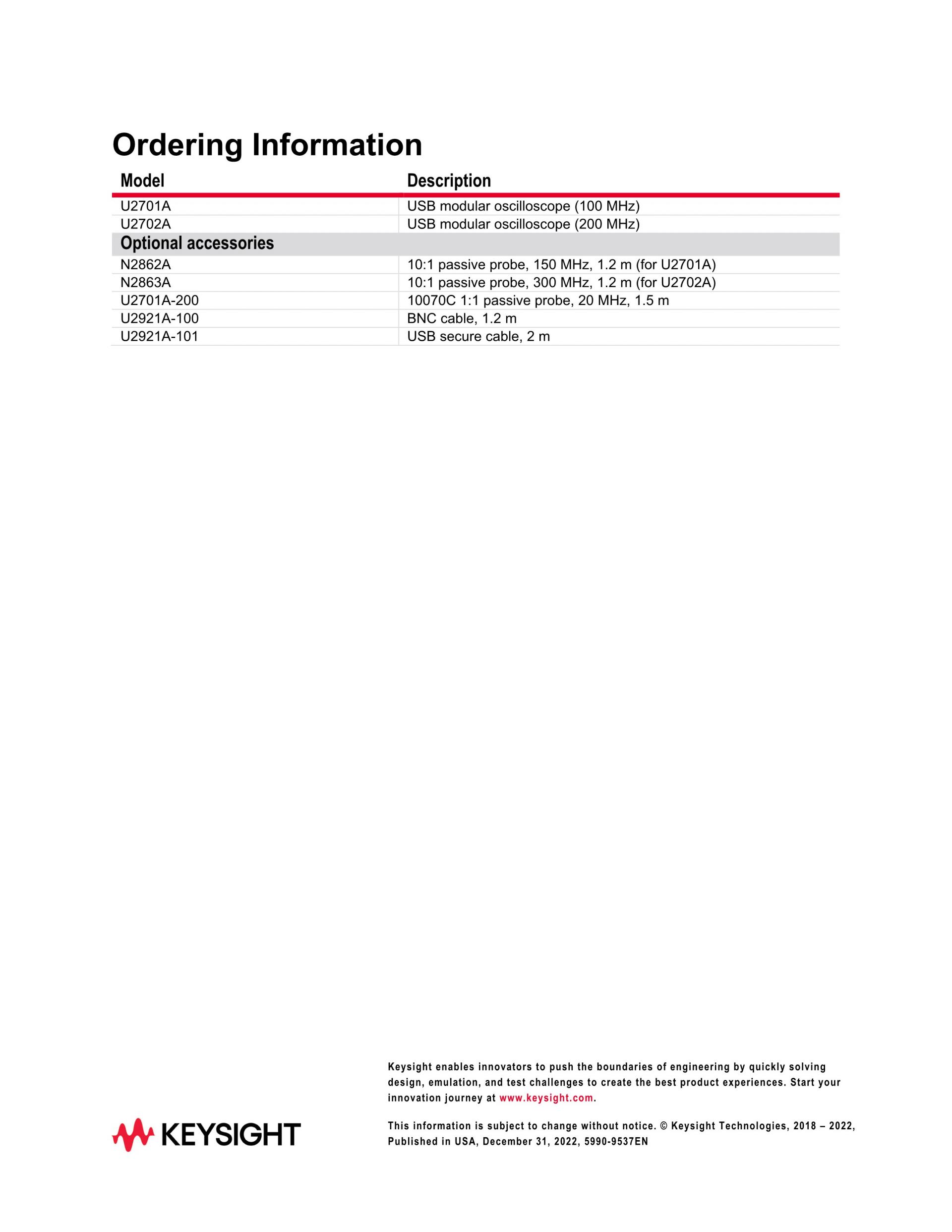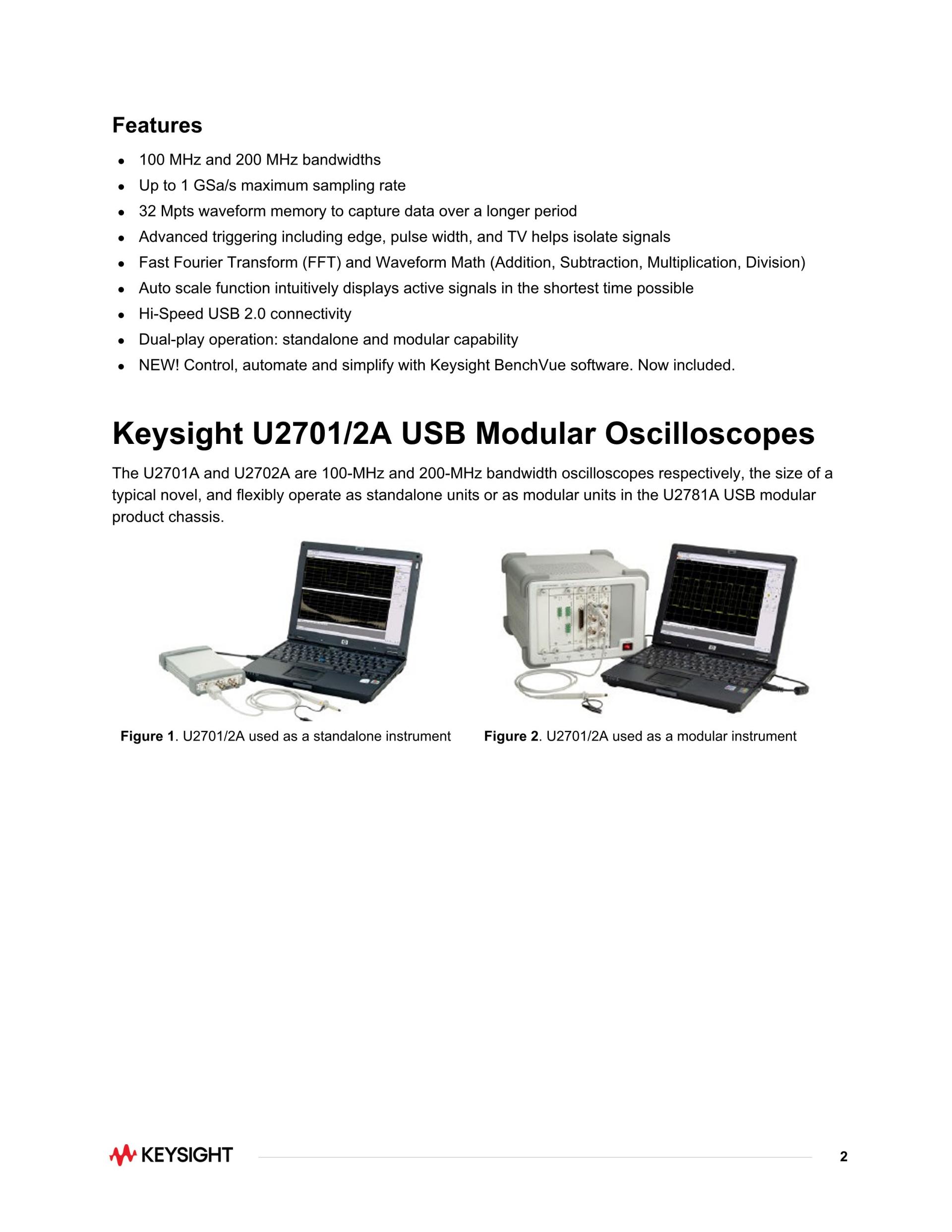 - 키사이트 U2701A는 2채널, 8비트 100MHz 오실로스코프로, 비독점인 표준 고속 USB 2.0 인터페이스를 사용하므로 손쉽게 연결이 가능합니다.