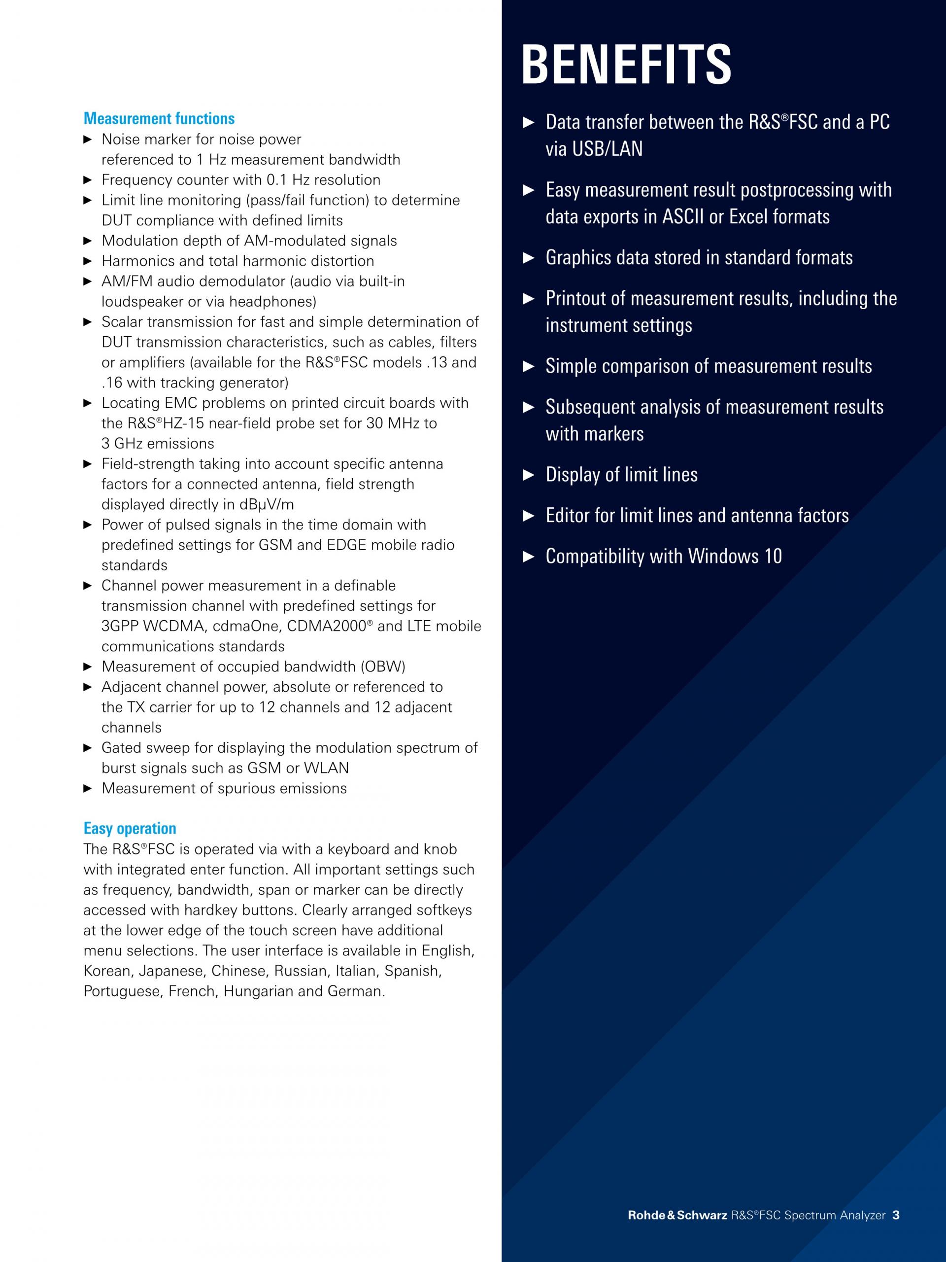 애플리케이션에 적합합니다. R&S®FSC에는 RF 제품의 개발과 테스트를 간소화하고 빠르게 수행할 수 있는 다양한 기능이 탑재되어 있습니다. 뛰어난 RF 특성과 높은 정확도를 이용하여 높은 신뢰성의 재현 가능한 결과를 보장합니다.