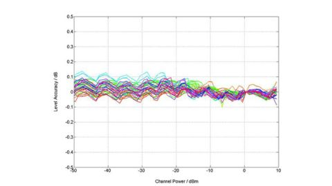 채널 출력에 대한 레벨 선형성 파고율이 10.55 dB인 3GPP TM1/64 신호의 레벨 선형성, 각 색은 각 RF 주파수를 나타냄(측정) |