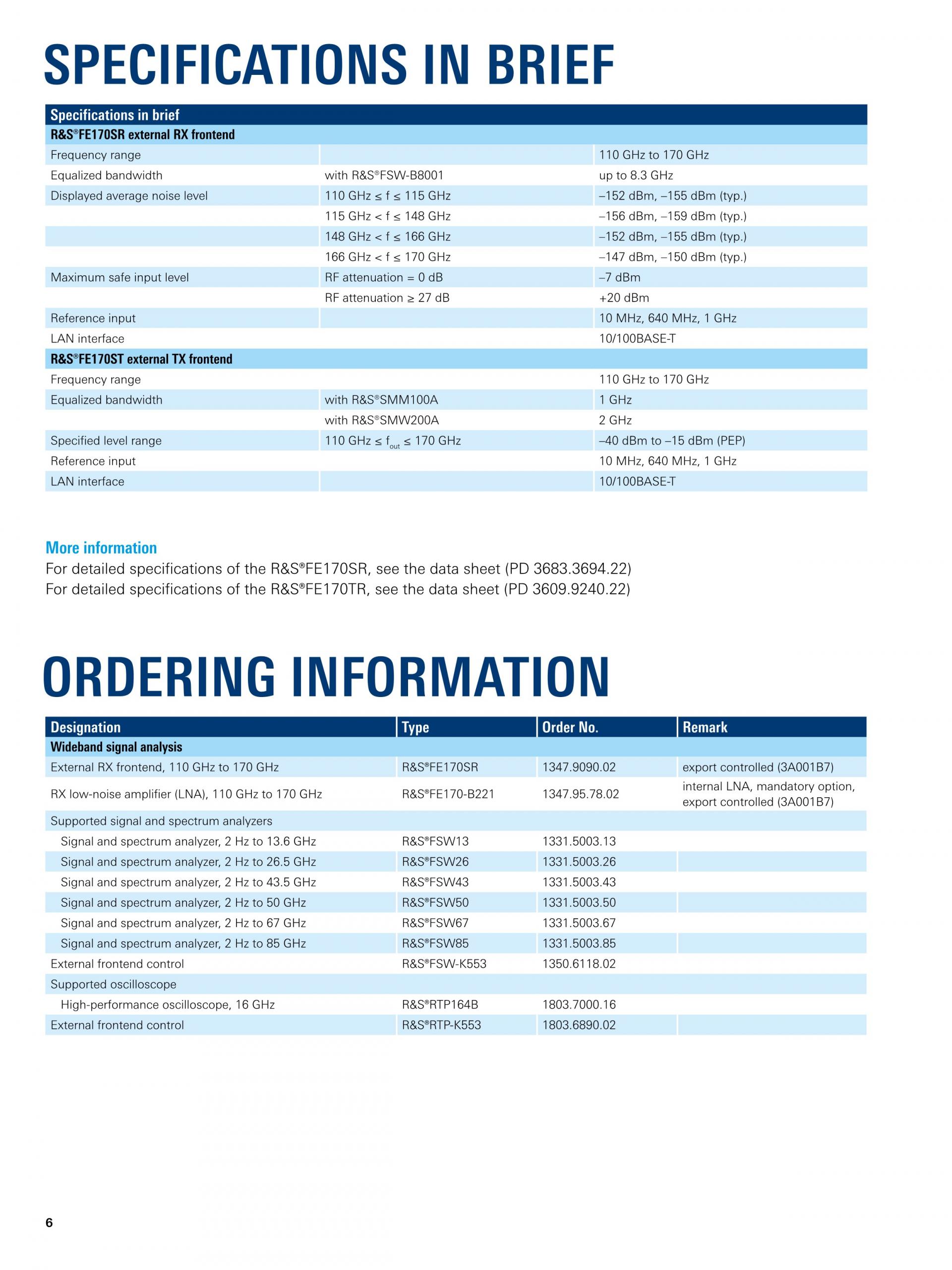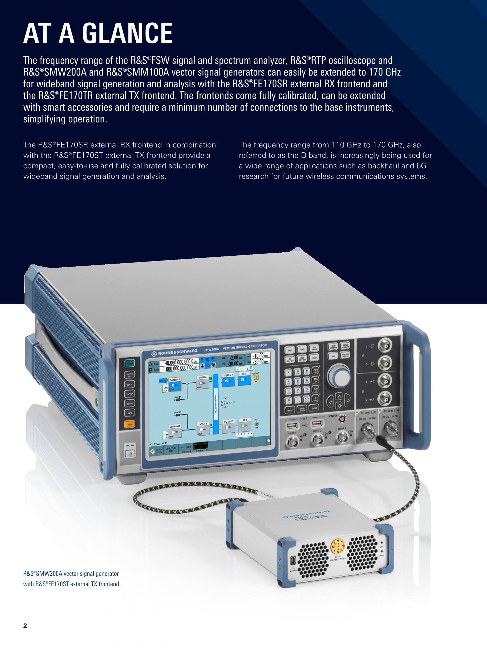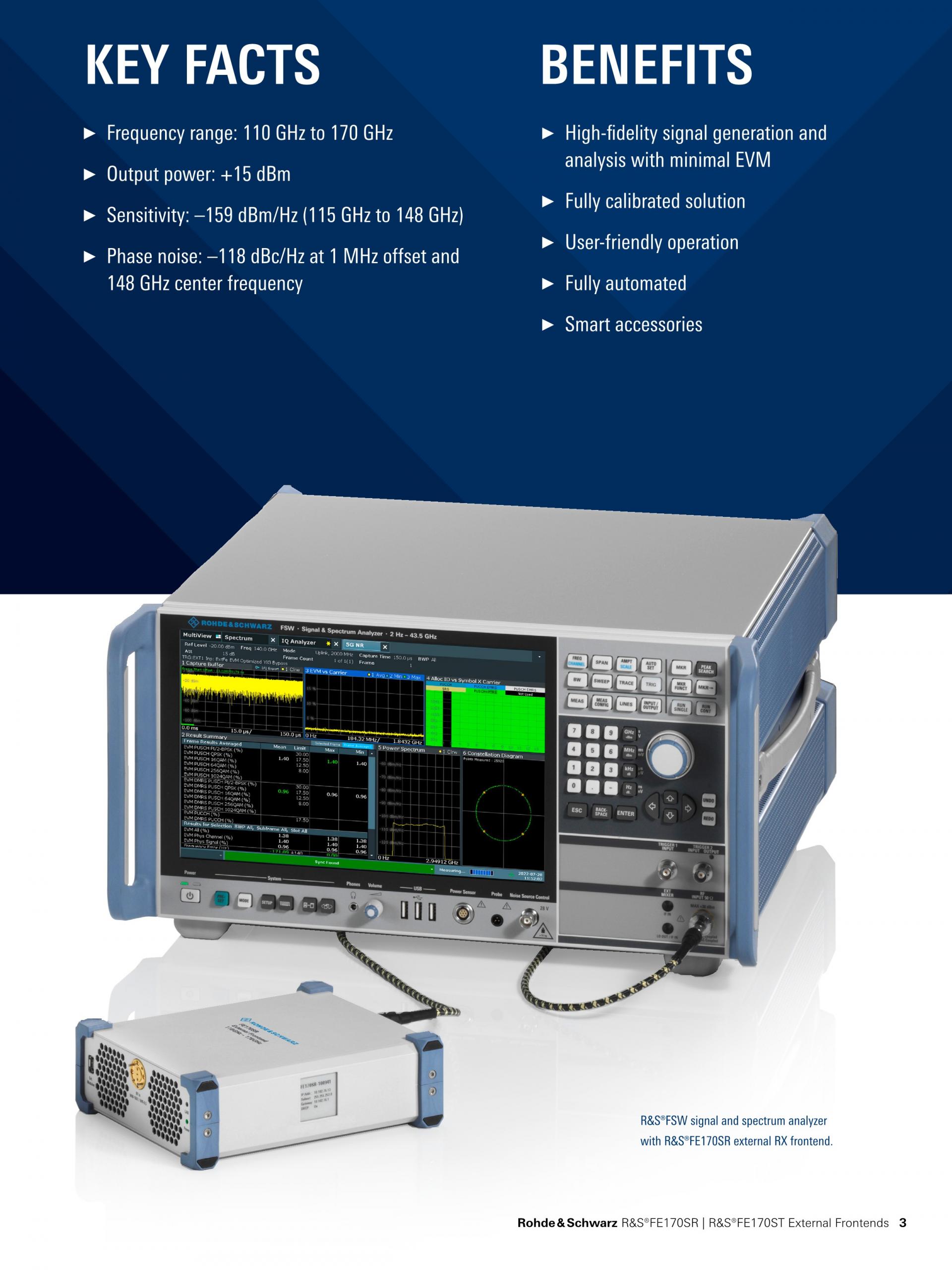 R&S®FE170SR은 Sub-THz 및 6G 연구에 적합합니다. 제품을 연결하여 R&S®FSW Signal and Spectrum Analyzer와 R&S®RTP Oscilloscope의 주파수 대역을 D-Band(110 GHz ~ 175 GHz)로 확장시킵니다. 개발자는 차세대 이동통신을 개발을 위해 필요한 주파수 대역에 액세스할 수 있습니다. 사용이 간단하고 완벽하게 교정된 솔루션으로 로데슈바르즈의 신호 발생기, 신호 분석기, 오실로스코프 제품과 호환됩니다. 지금 바로 차세대 이동통신 설계를 시작하십시오