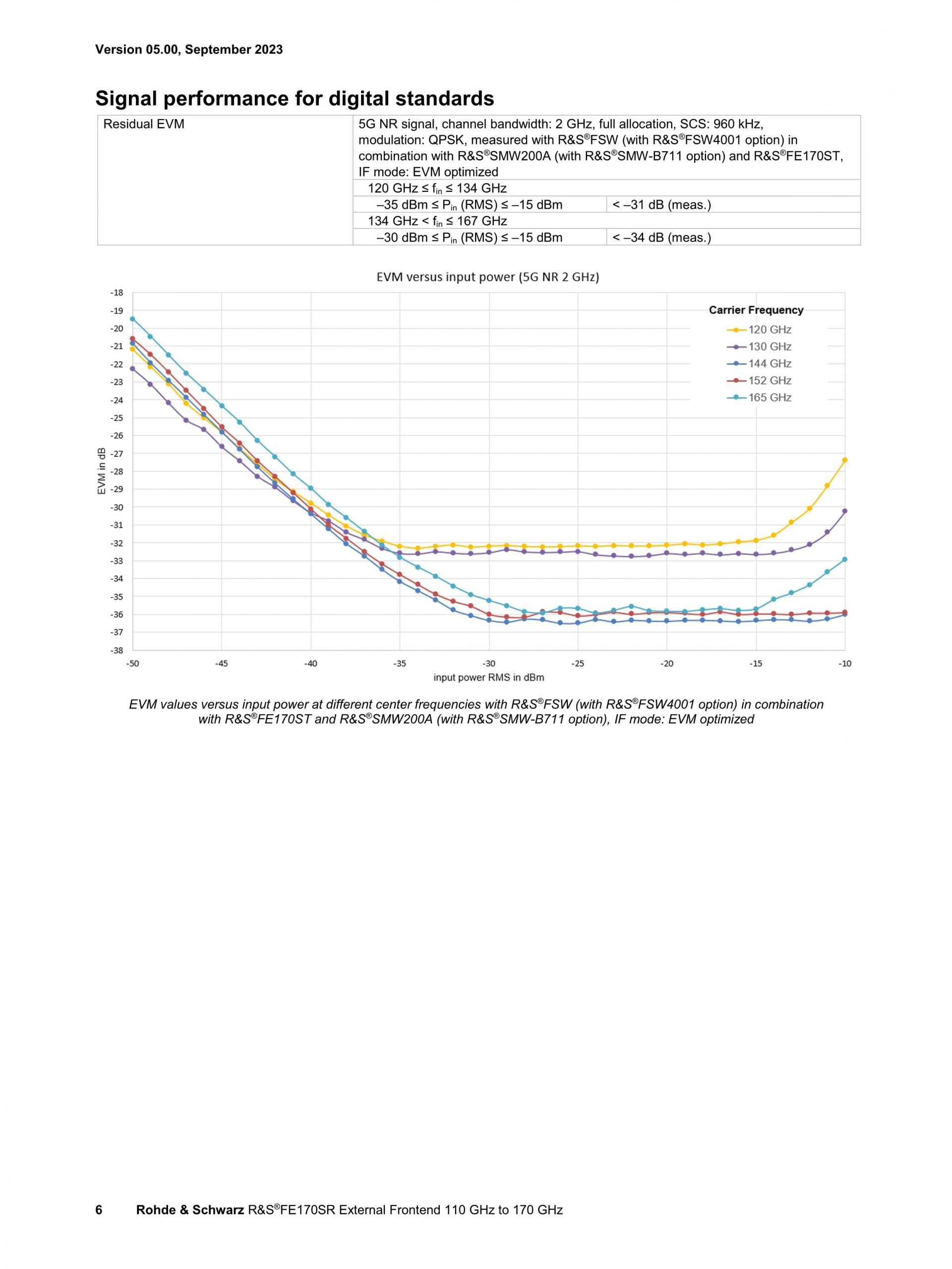 뛰어난 신호 성능 우수한 변조 품질의 광대역 변조 신호는 차세대 이동통신 기술, 자동차 레이더 애플리케이션 개발을 위한 필수 요소입니다. R&S®FE170SR은 타의 추종을 불허하는 변조 품질을 제공합니다. 2 GHz(960 kHz SCS) 채널 대역폭으로 QPSK 변조의 5G NR 신호를 발생시킬 경우 -36 dB(@ 148 GHz)의 뛰어난 EVM 성능을 제공합니다. 이와 같이 뛰어난 변조 품질은 넓은 다이내믹 레인지에 걸쳐 유지됩니다. |