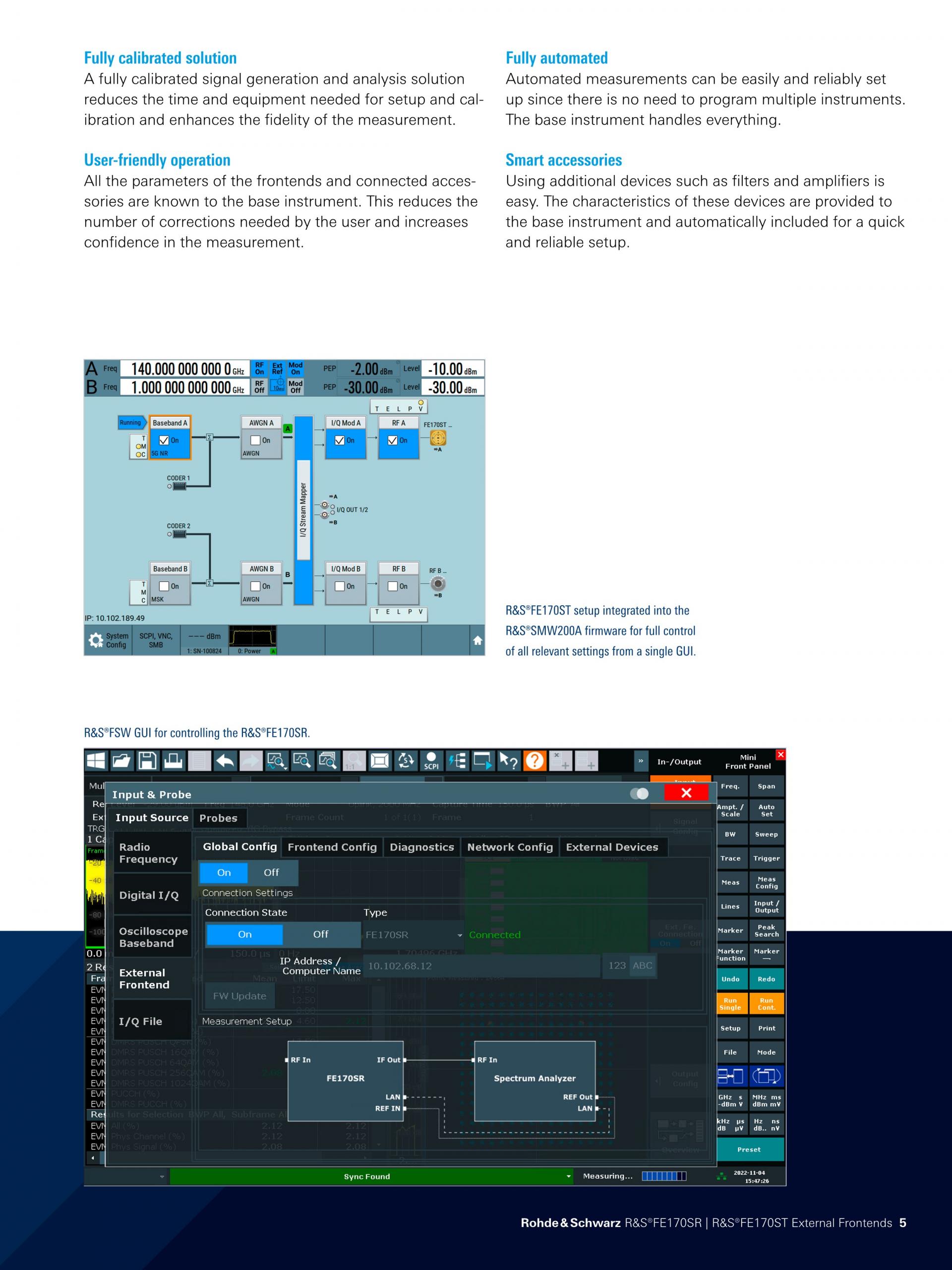 간편한 운용 R&S®FE170SR은 R&S®FSW Signal Analyzer와 R&S®RTP Oscilloscope의 동작 컨셉과 완벽히 일치합니다. 프론트엔드와 본체 사이에서 LAN, IF, 그리고 REF 커넥터만 연결하면 충분합니다. 복수의 기기를 프로그래밍할 필요가 없으므로 자동 측정을 쉽고 안정적으로 셋업할 수 있습니다. | ![]() R&S®FE170SR 연결 R&S®FE170SR Frontend를 연결한 R&S®FSW |