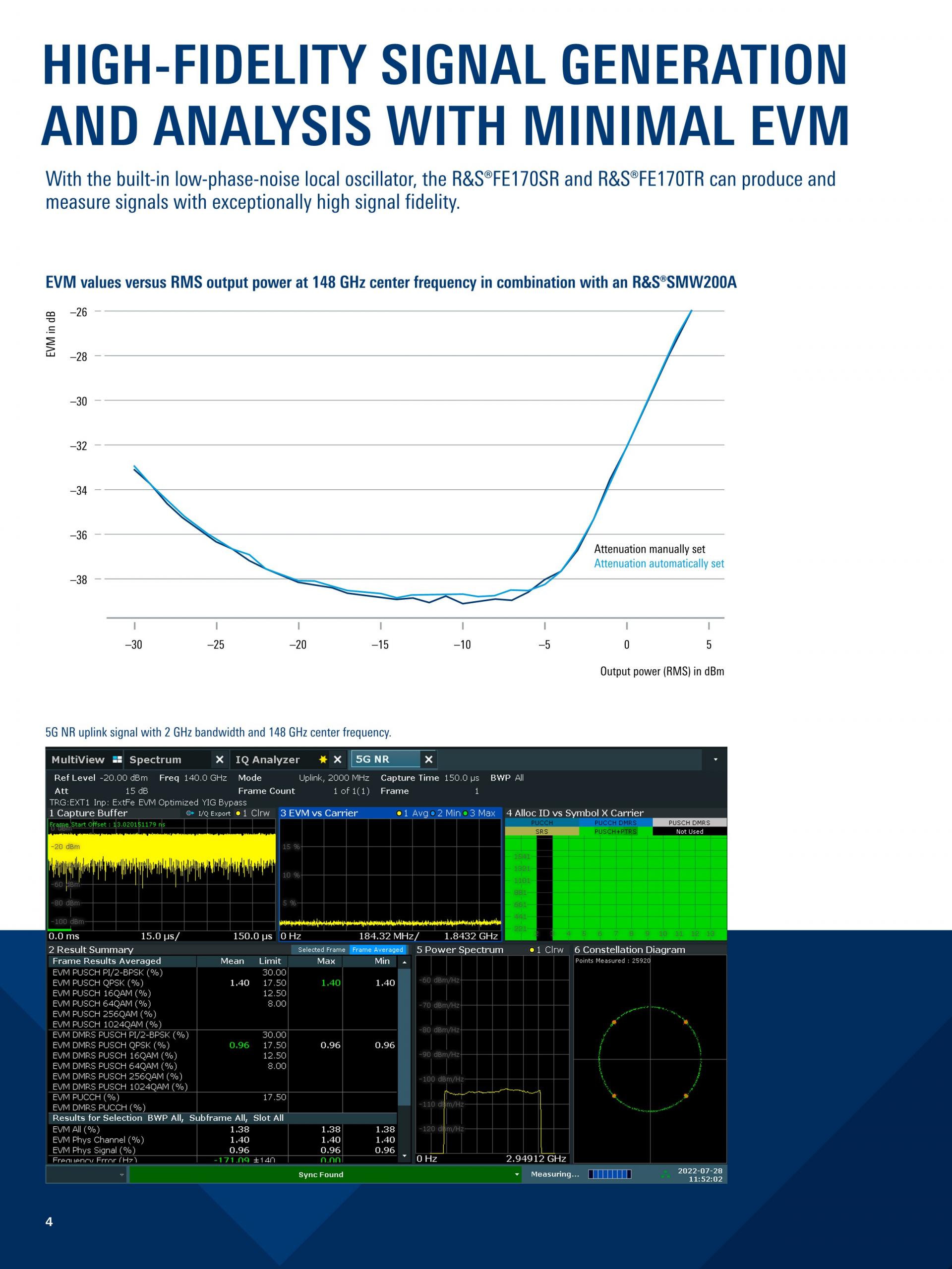 뛰어난 신호 성능 우수한 변조 품질의 광대역 변조 신호는 차세대 이동통신 기술, 자동차 레이더 애플리케이션 개발을 위한 필수 요소입니다. R&S®FE170SR은 타의 추종을 불허하는 변조 품질을 제공합니다. 2 GHz(960 kHz SCS) 채널 대역폭으로 QPSK 변조의 5G NR 신호를 발생시킬 경우 -36 dB(@ 148 GHz)의 뛰어난 EVM 성능을 제공합니다. 이와 같이 뛰어난 변조 품질은 넓은 다이내믹 레인지에 걸쳐 유지됩니다. |