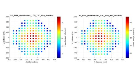 PF(Power Factor, 역률) 공간 분포 그래픽 RMS(왼쪽) 및 피크(오른쪽) 전력 밀도 예. 3.4 GHz에서 TDD 신호의 공간 분포. |