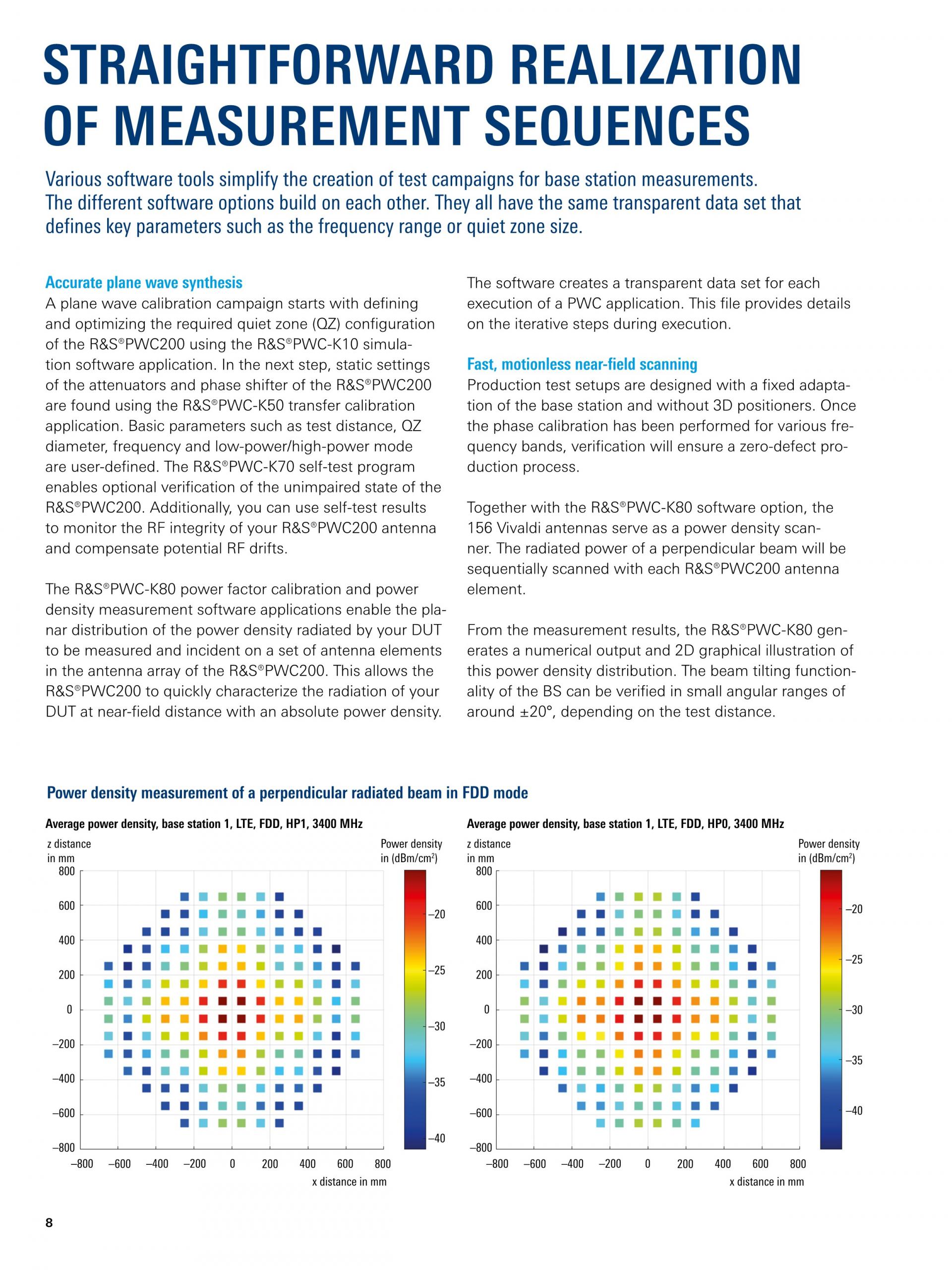 R&S®PWC-K80 Power Density Measurement Software는 5G massive MIMO 기지국에서 발생하는 전력 밀도의 평면 분포를 측정합니다. 이 기능은 특히 포지셔닝 시스템을 적용하지 않는 생산 테스트에 유용합니다. R&S®PWC200은 기지국에 대해 작은 틸트 각도(+/- 10°)의 전자주사빔을 손쉽게 검증하고 피크 영역을 표시할 수 있습니다. |