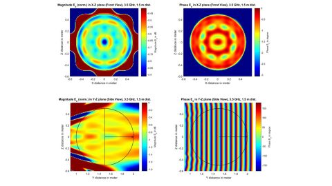 필드 시뮬레이션 결과 안테나 배열로부터 1.5 m 거리 Quiet Zone에서 3.5 GHz 전기장 분포의 샘플 결과 |