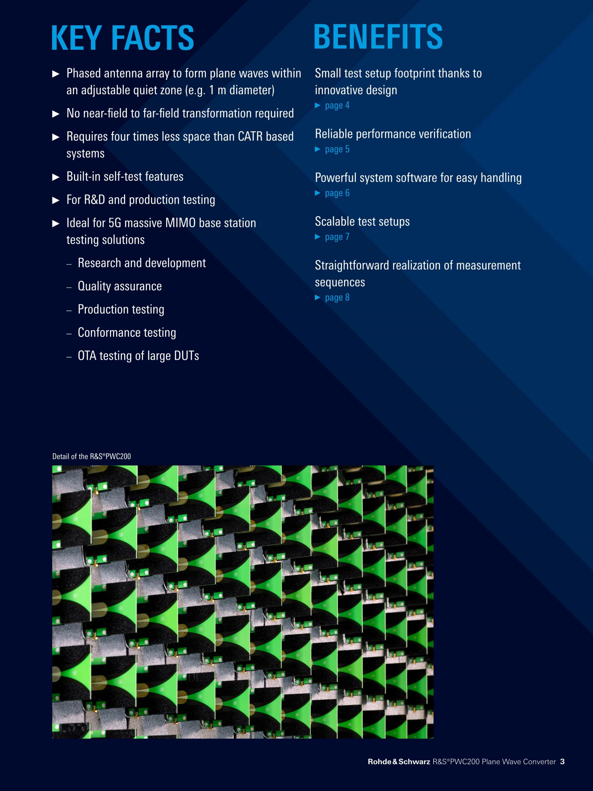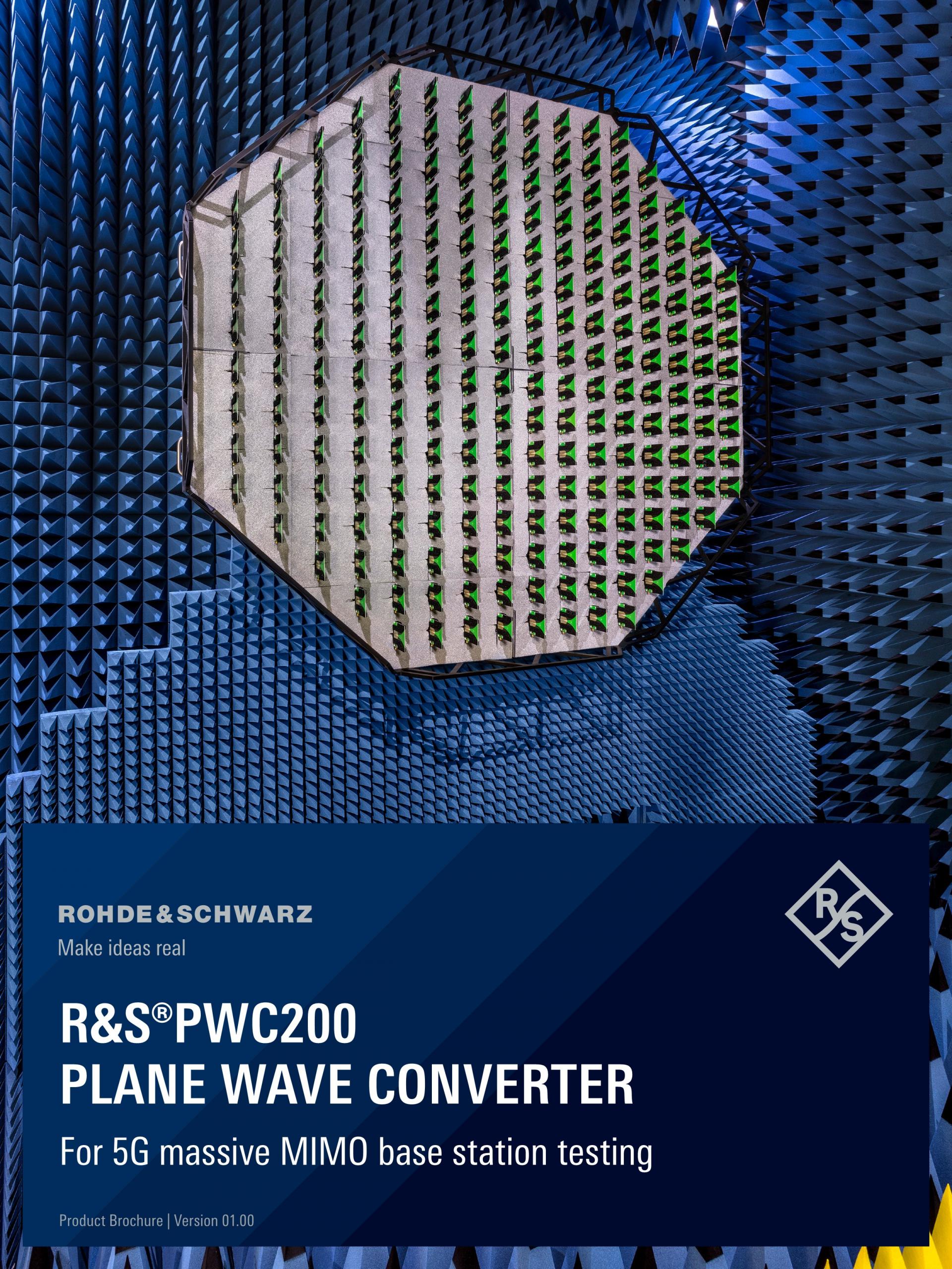 R&S®PWC200 Plane Wave Converter는 R&D, 품질 보증, 생산뿐만 아니라 OTA(over the air) 적합성 테스트에서 5G massive MIMO 기지국 테스트용으로 설계된 독자적 기기입니다. 이 기기는 DUT(Device under Test)의 방출 NF(Near-Field)에 156개 Wideband Vivaldi 안테나를 양방향으로 배열합니다. 위상 안테나 배열은 실시간 방사 전력과 트랜시버 측정(EVM, ACLR, SEM 등)을 위해 5G massive MIMO 기지국 DUT를 둘러싸고 있는 지정 Quite Zone 내에서 평면파를 형성할 수 있습니다.