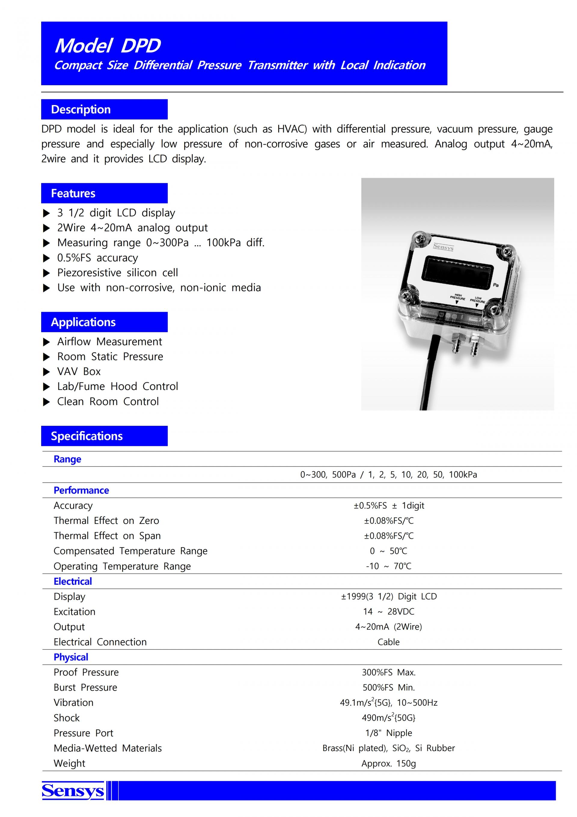 DPD모델은 매우 작은 차압, 진공압, 게이지압 측정이 가능하므로 공조시스템에 적합하며 소형으로 협소한 장소에 설치가 용이합니다.