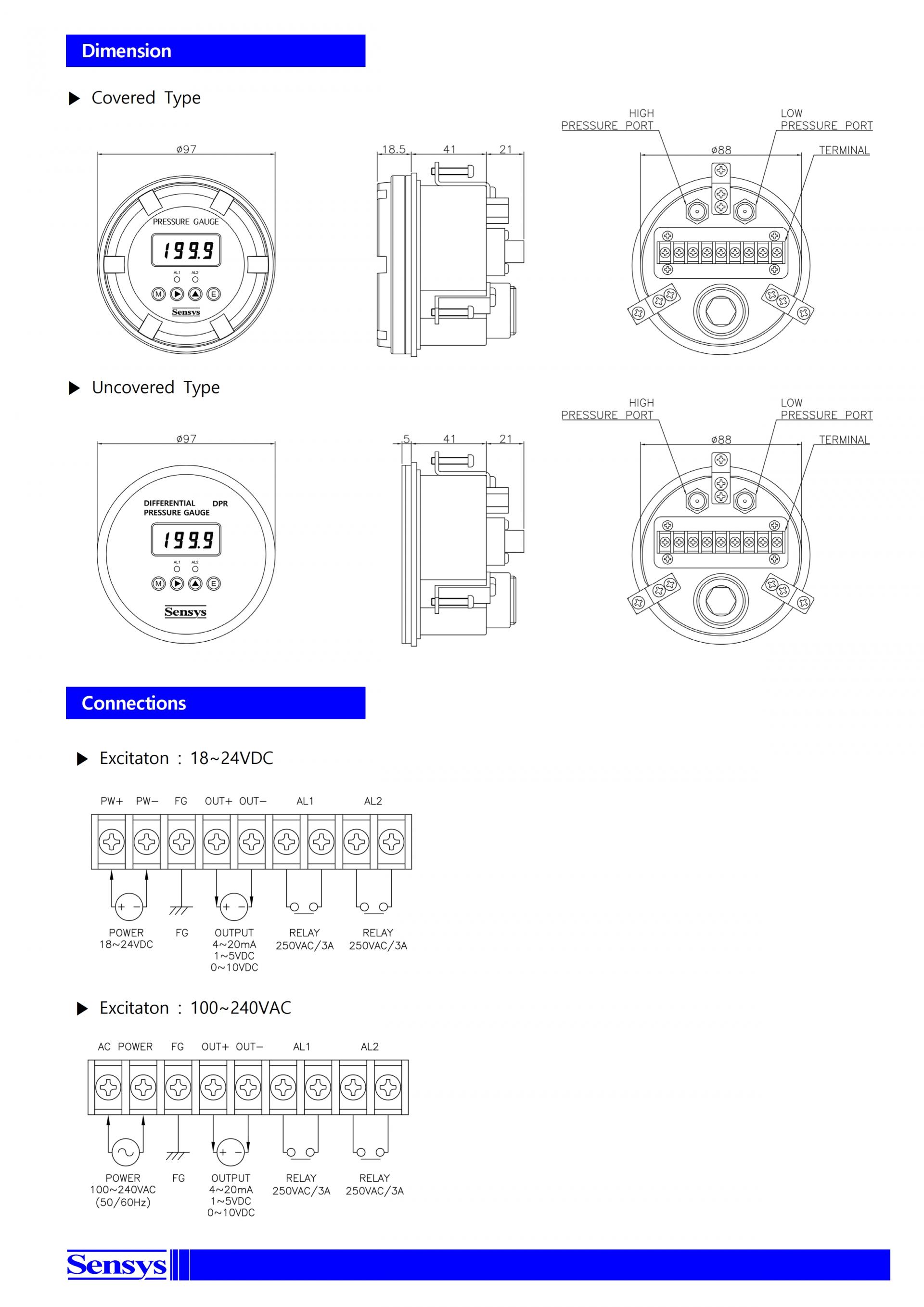- 1~5, 0~10VDC 또는 4~20mA 출력 (사용압력범위 임의 조절 가능)