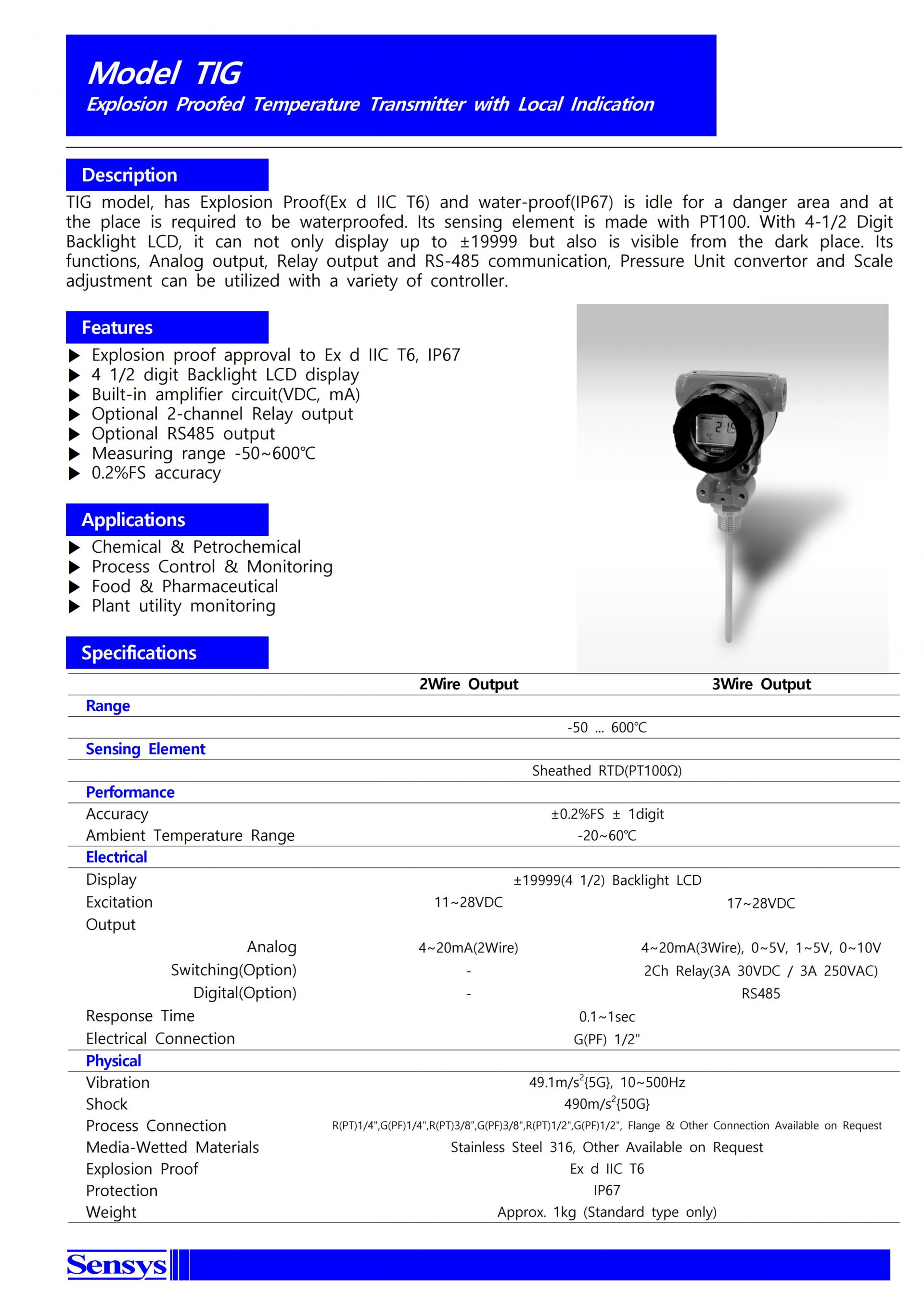 TIG모델은 내압방폭(Ex d IIC T6)과 방수(IP67)제품으로 위험지역 및 방수가 필요한 지역에서도 사용이 가능합니다.